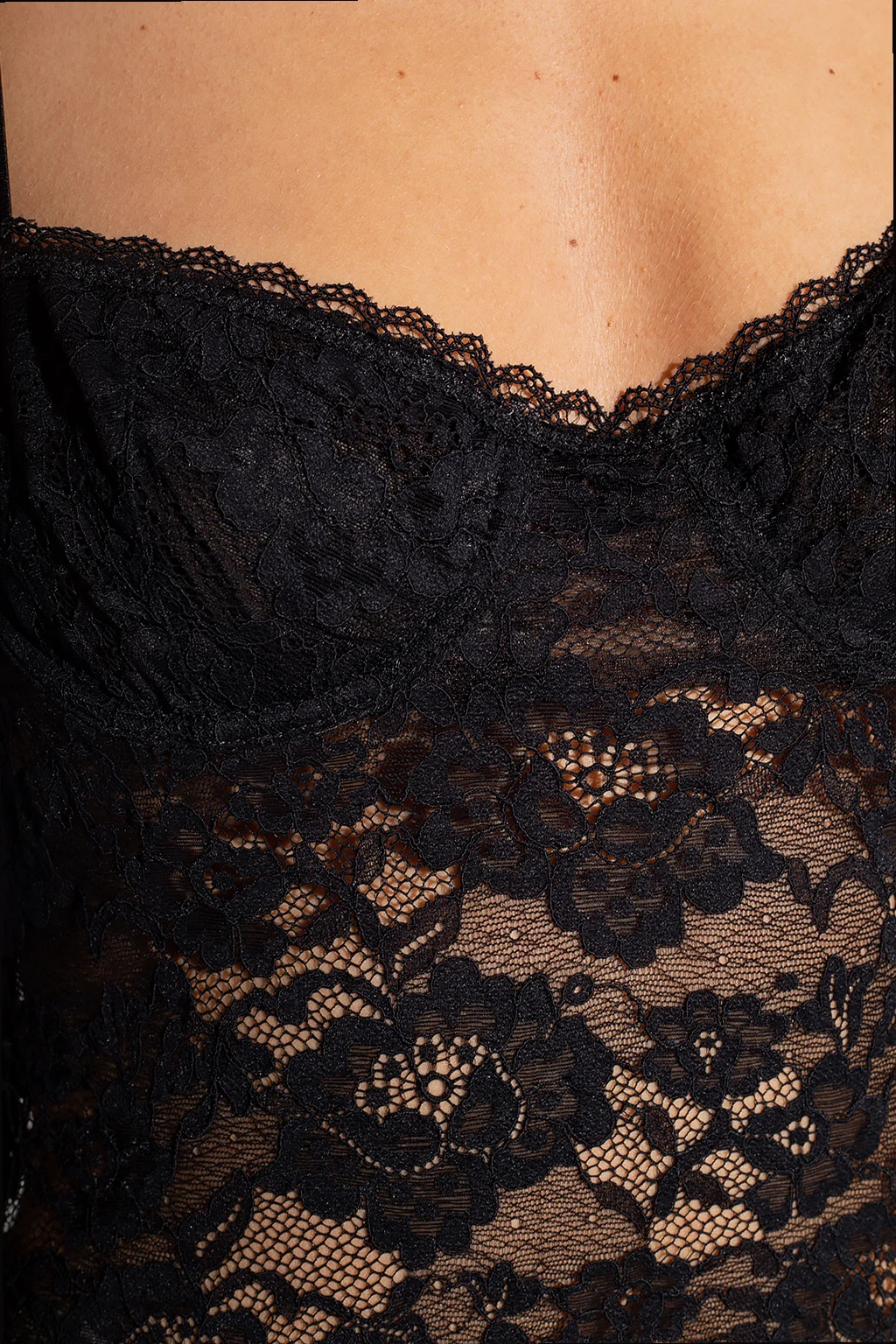 Black chemise from Oseree. Rendered in lace, this style features underwires, removable padded cups and adjustable spaghetti straps.