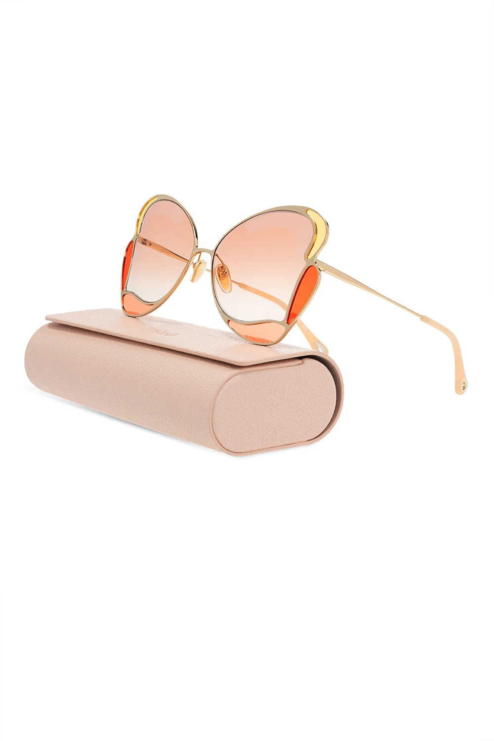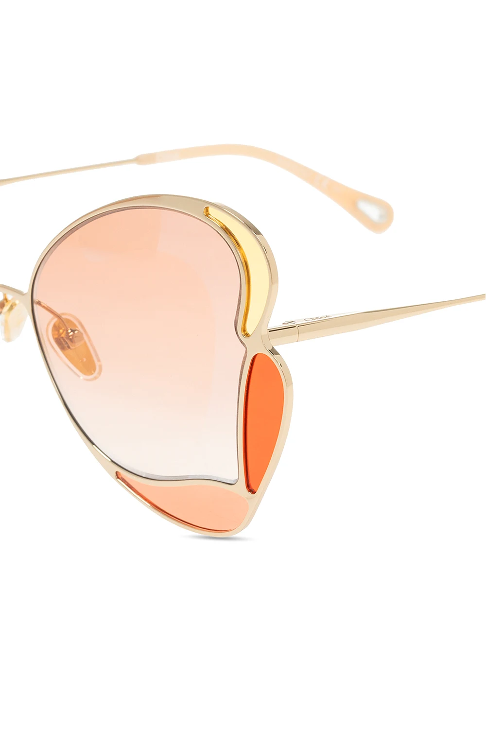 Gold-tone sunglasses from Chloé. Emblazoned with the brand's logo, this pair features decoratively shaped, certified orange lenses with UVA/UVB protection. It also comes with a pink protective case.