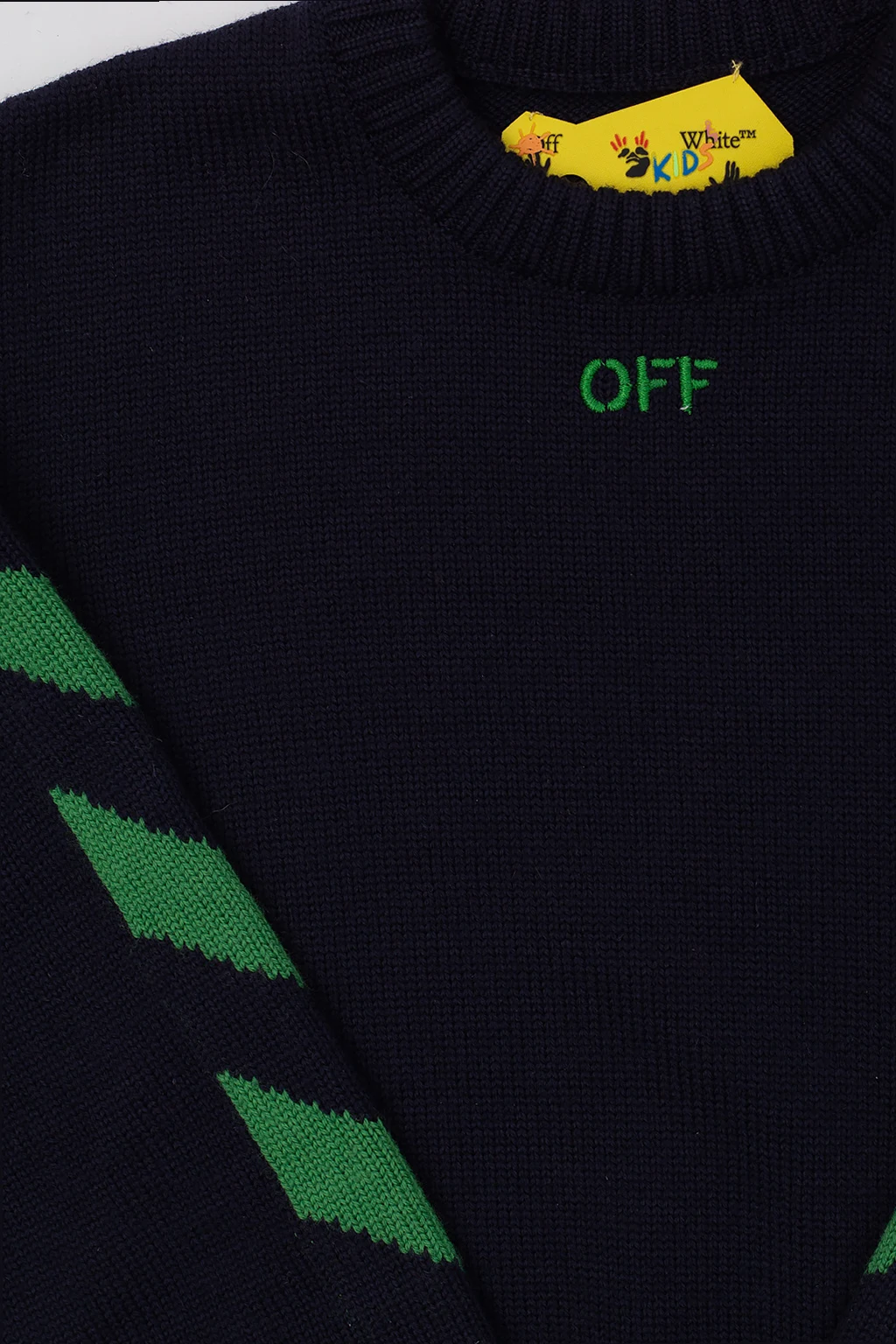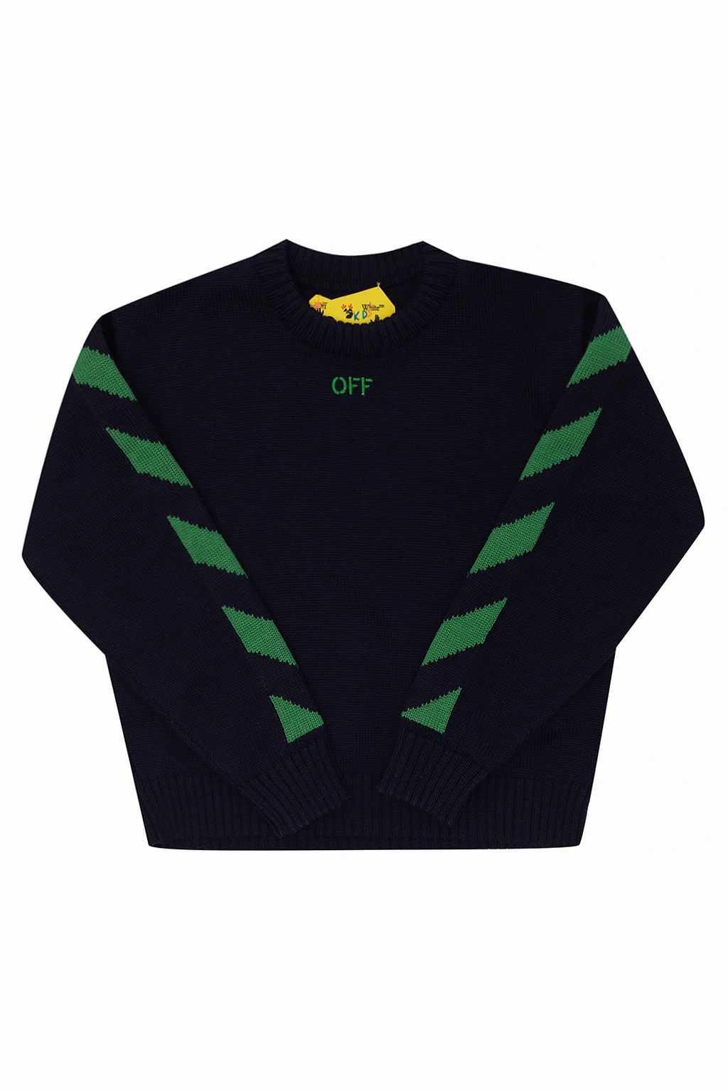 Navy blue crewneck sweater from Off-White Kids. Crafted from wool, this style showcases a green graphic motif with the brand's logo and ribbed trims on the edges.