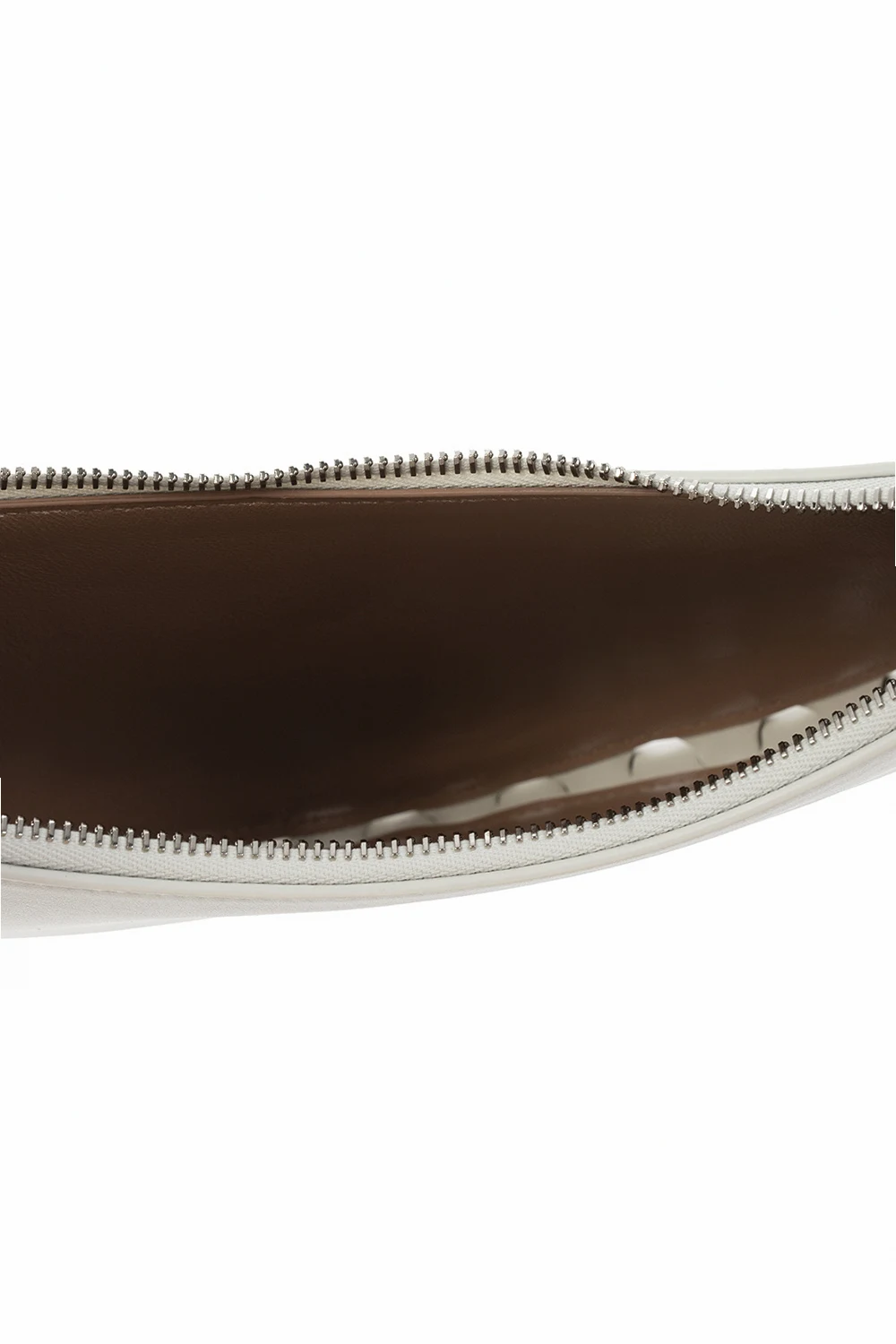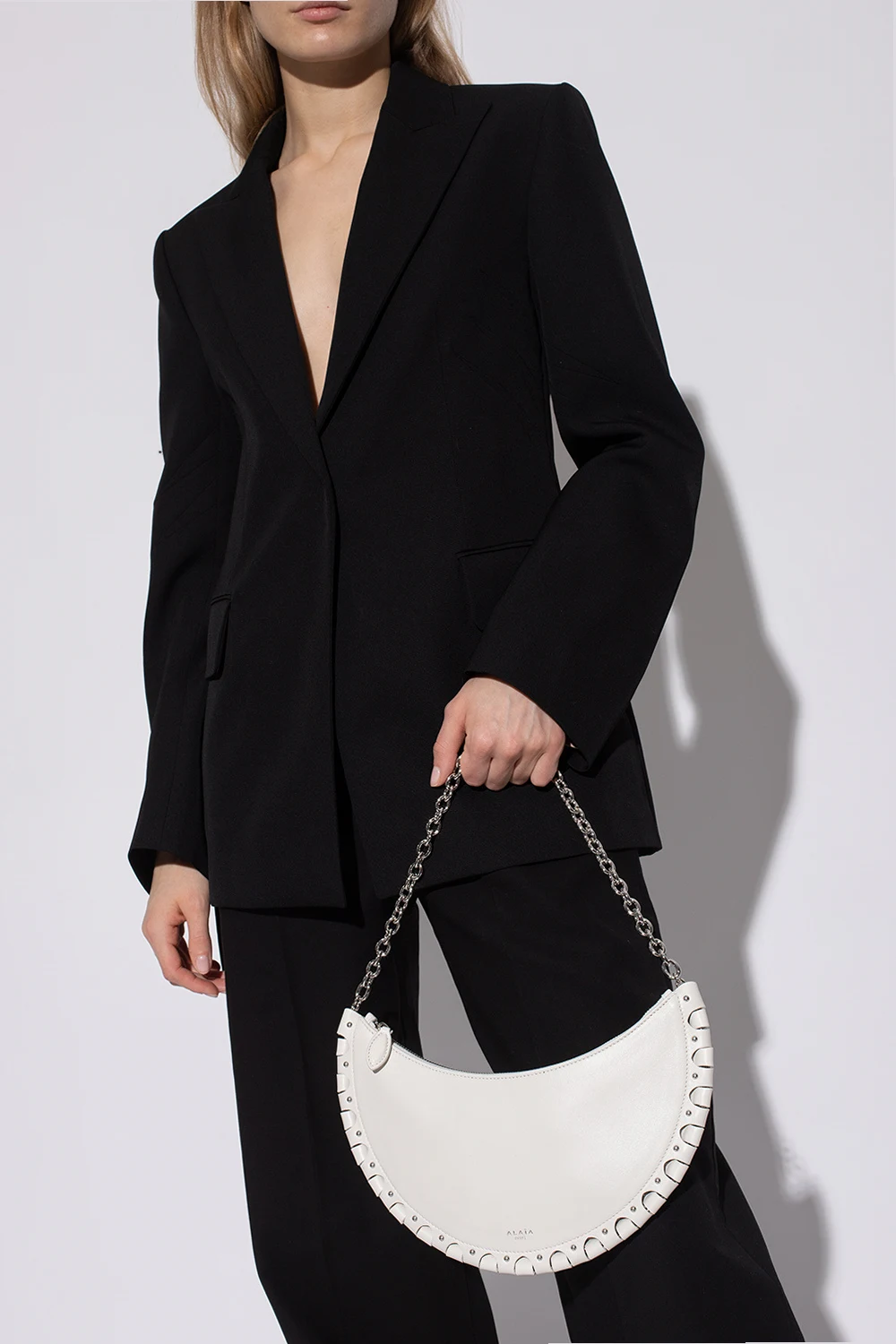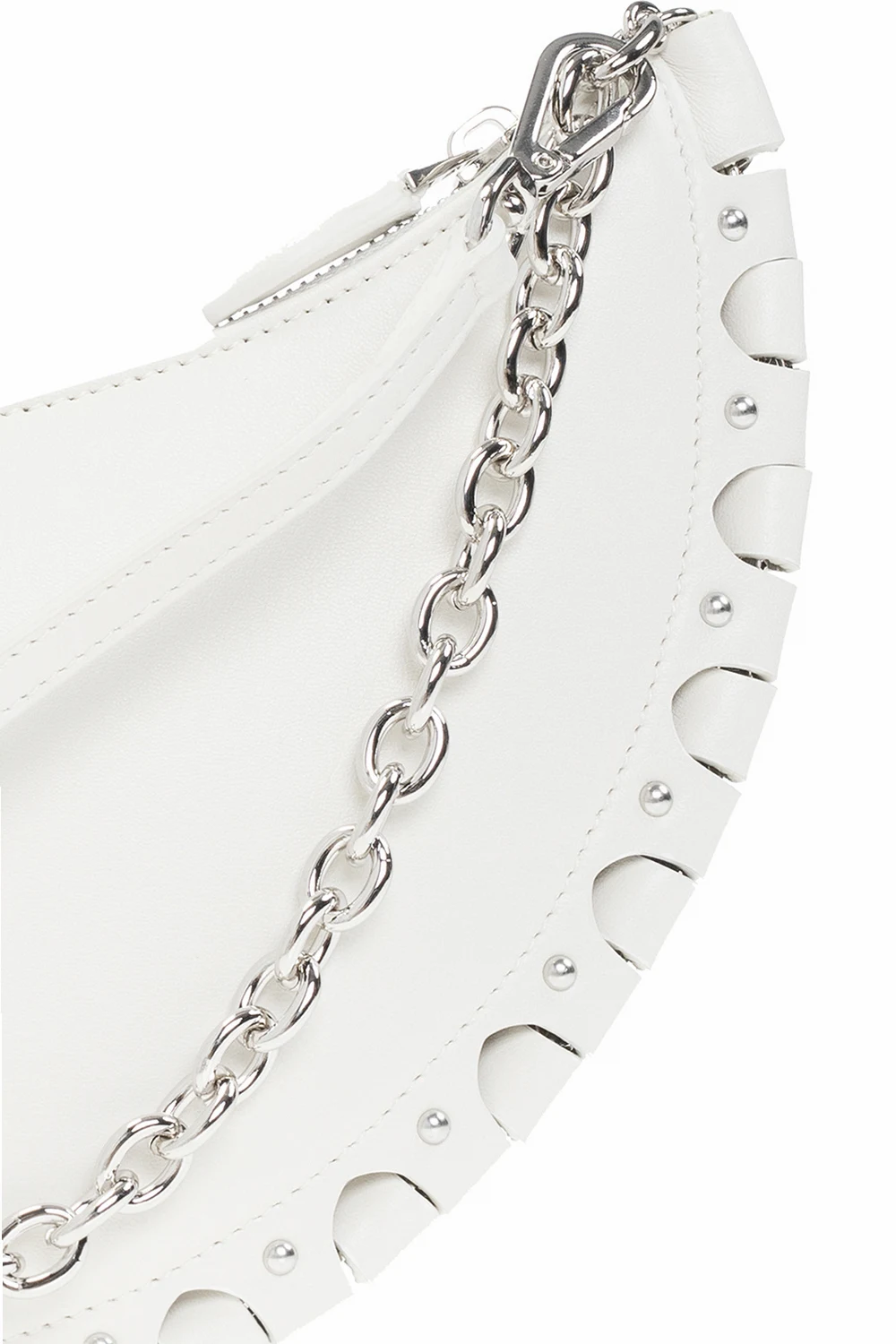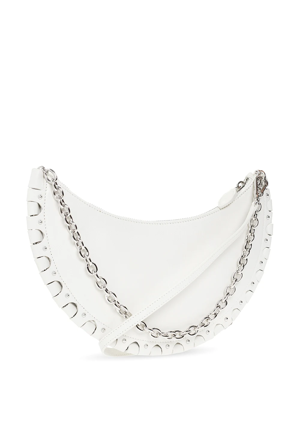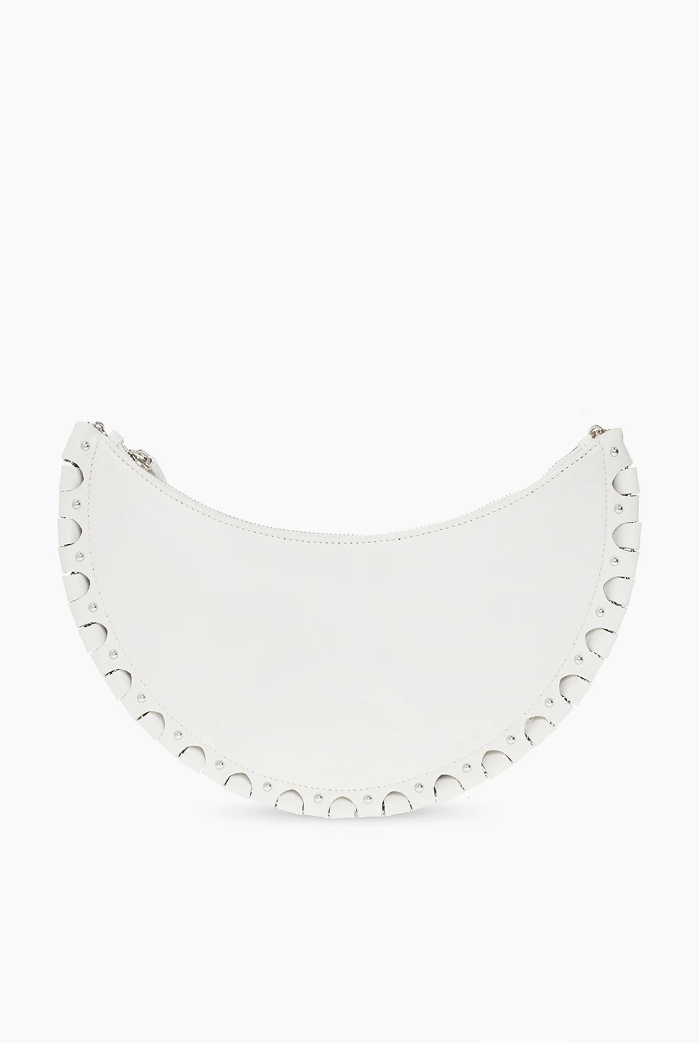 White 'Demi-Lune' shoulder bag from Alaia. Crafted from lamb leather, this design features a zip fastening, silver-tone logo detailing on the front, an openwork motif, metal rivets, a silver-tone chain strap, an adjustable shoulder strap and one internal compartment with a slip pocket.