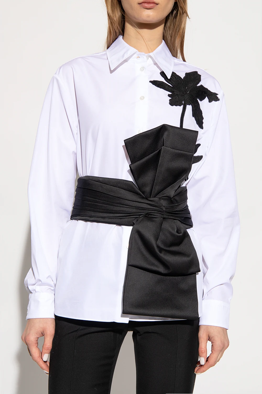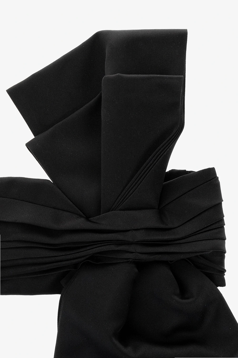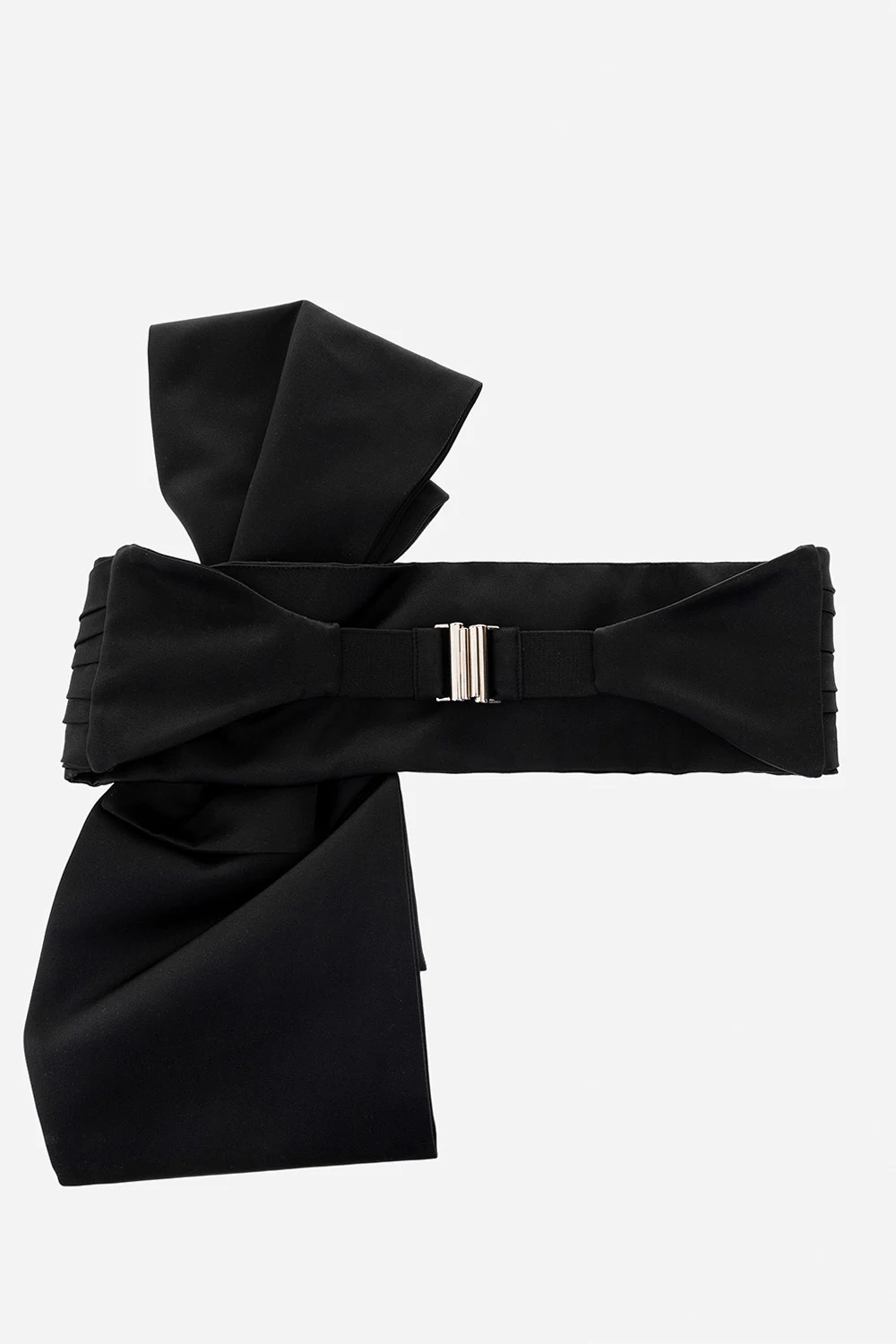 Black tuxedo belt from Erdem. Made of satin and trimmed with an elastic strap, this item features a silver-tone metal hook fastening, pleats and a bow.