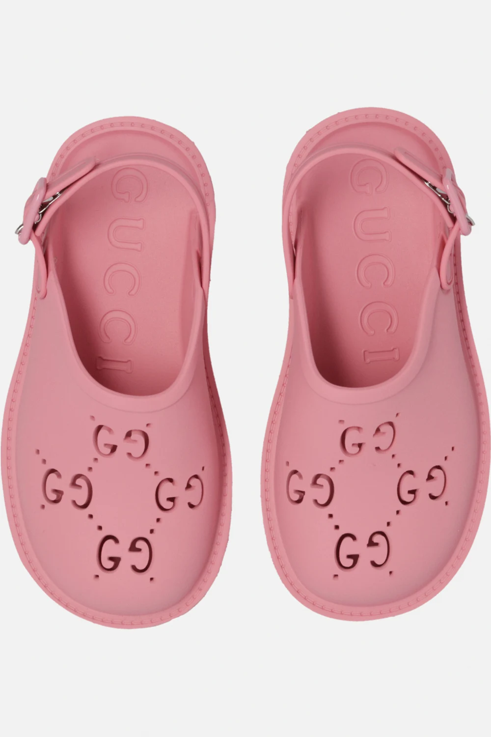 Pink sandals from Gucci Kids. Made of rubber, this model showcases a buckle strap fastening and a perforated ‘GG’ pattern.