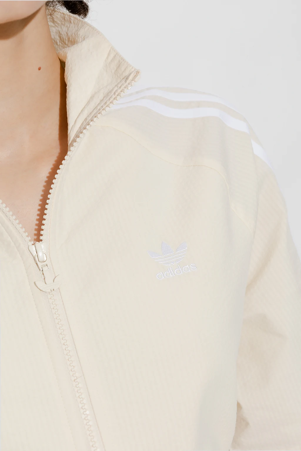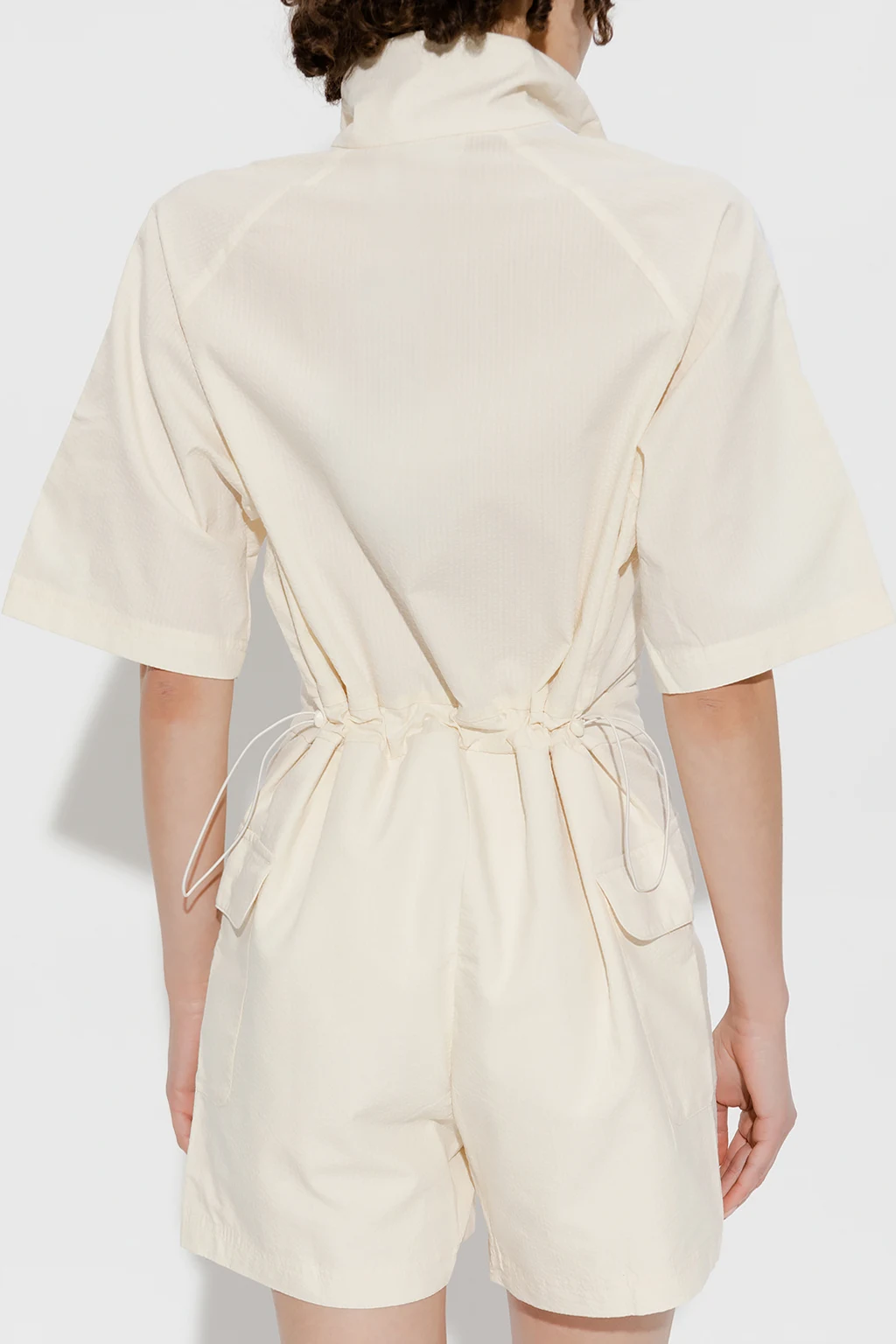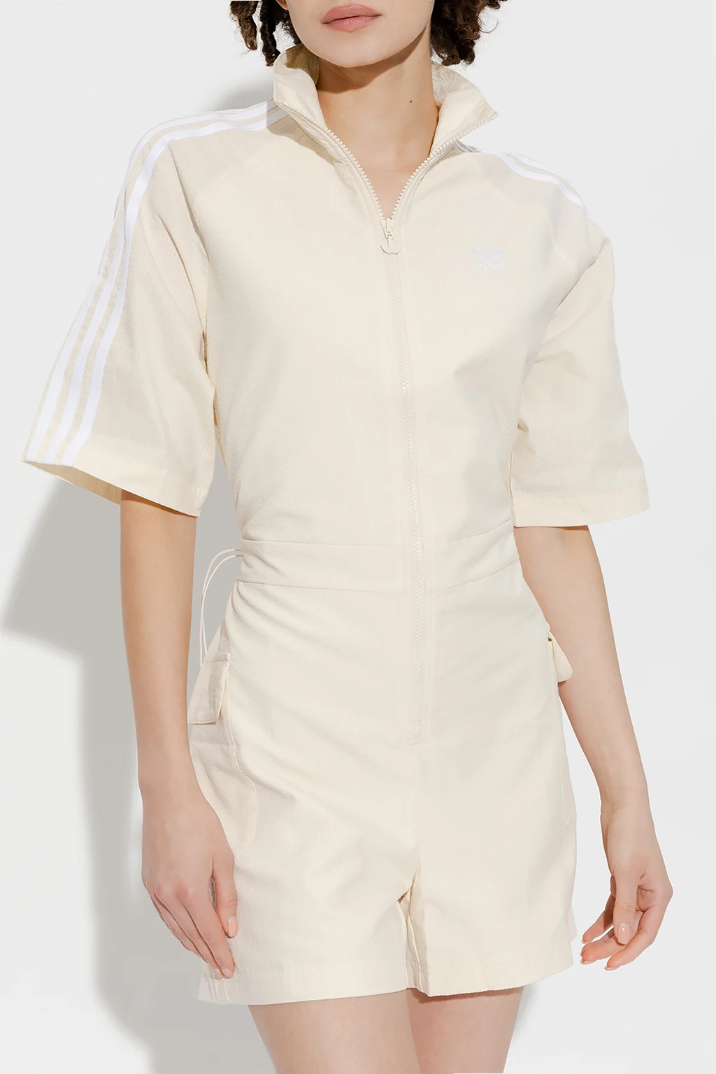 Cream jumpsuit with a stand collar from ADIDAS. Fastened with a zip, this short sleeve design features the brand’s signature three white stripes, logo embroidery, two flap pockets and drawstring waist.