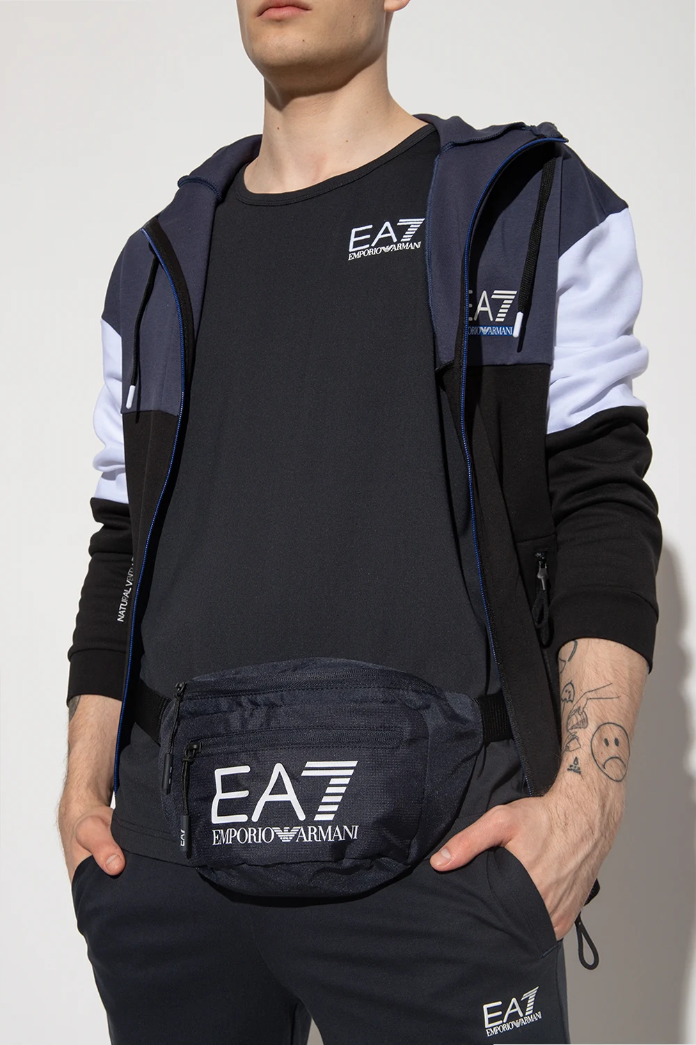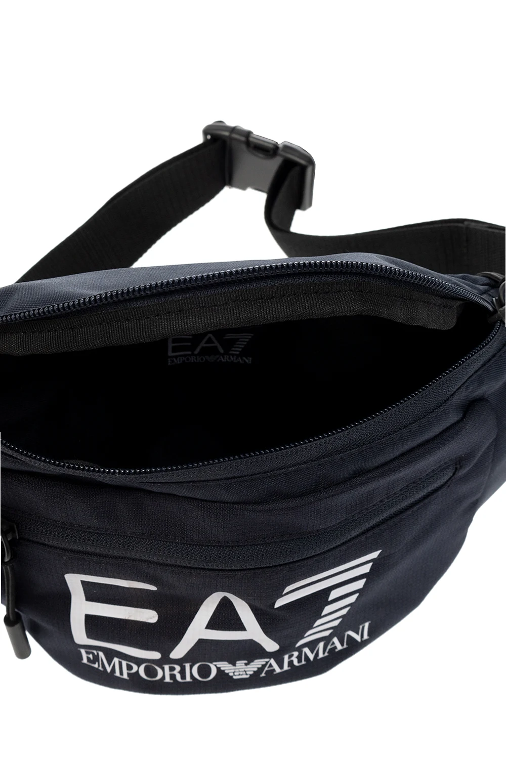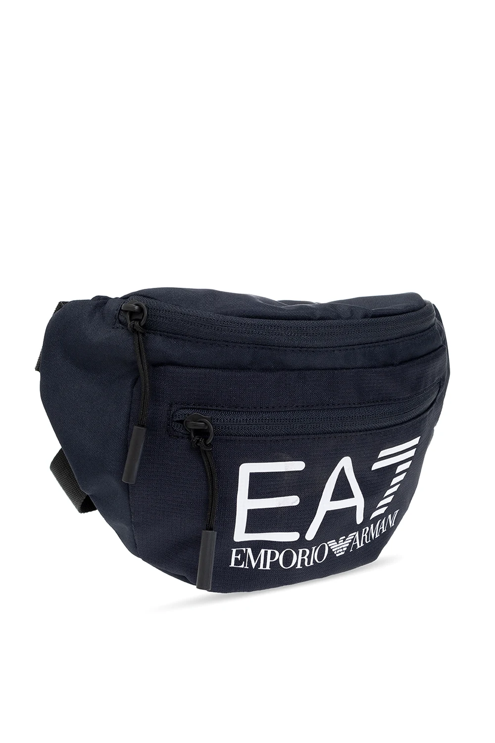 Navy and black belt bag from EA7 Emporio Armani. Fastened with a zip, this model features a front zip pocket, white logo print, adjustable strap and one internal compartment.