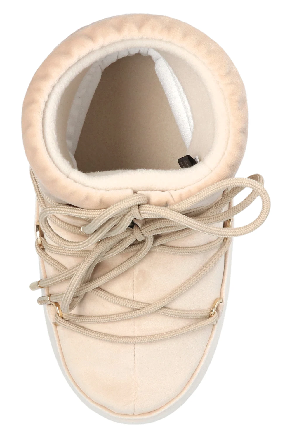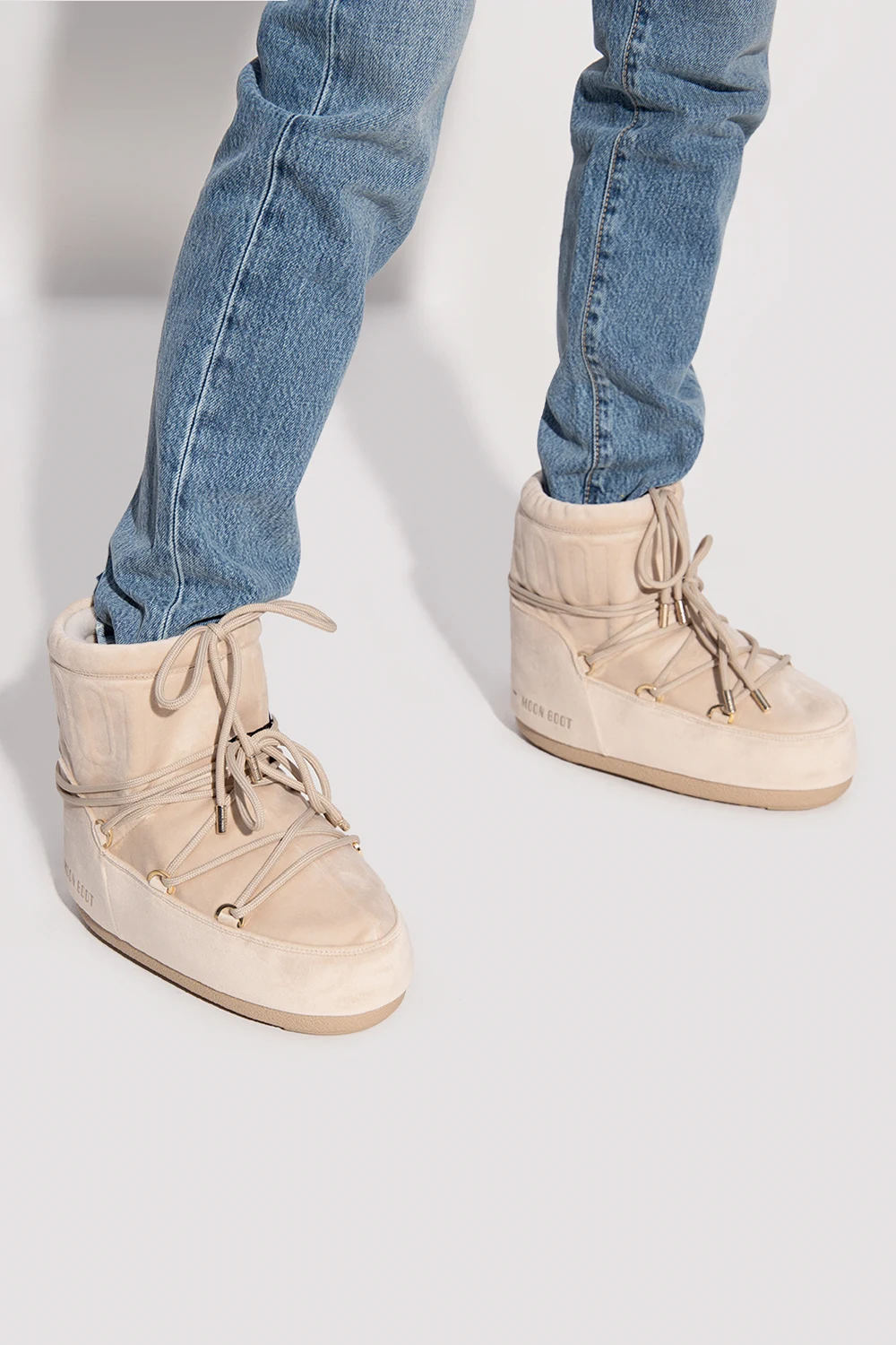 Beige ‘Mars Velvet’ snow boots from Moon Boot. Made of velour, this model sits on a beige rubber sole and showcases a logo graphic, distinctive laces and silver-tone metal hardware. Inspired by the peculiar shape and technology of the astronauts' boots, the iconic style was designed in 1969 after the first Moon landing.