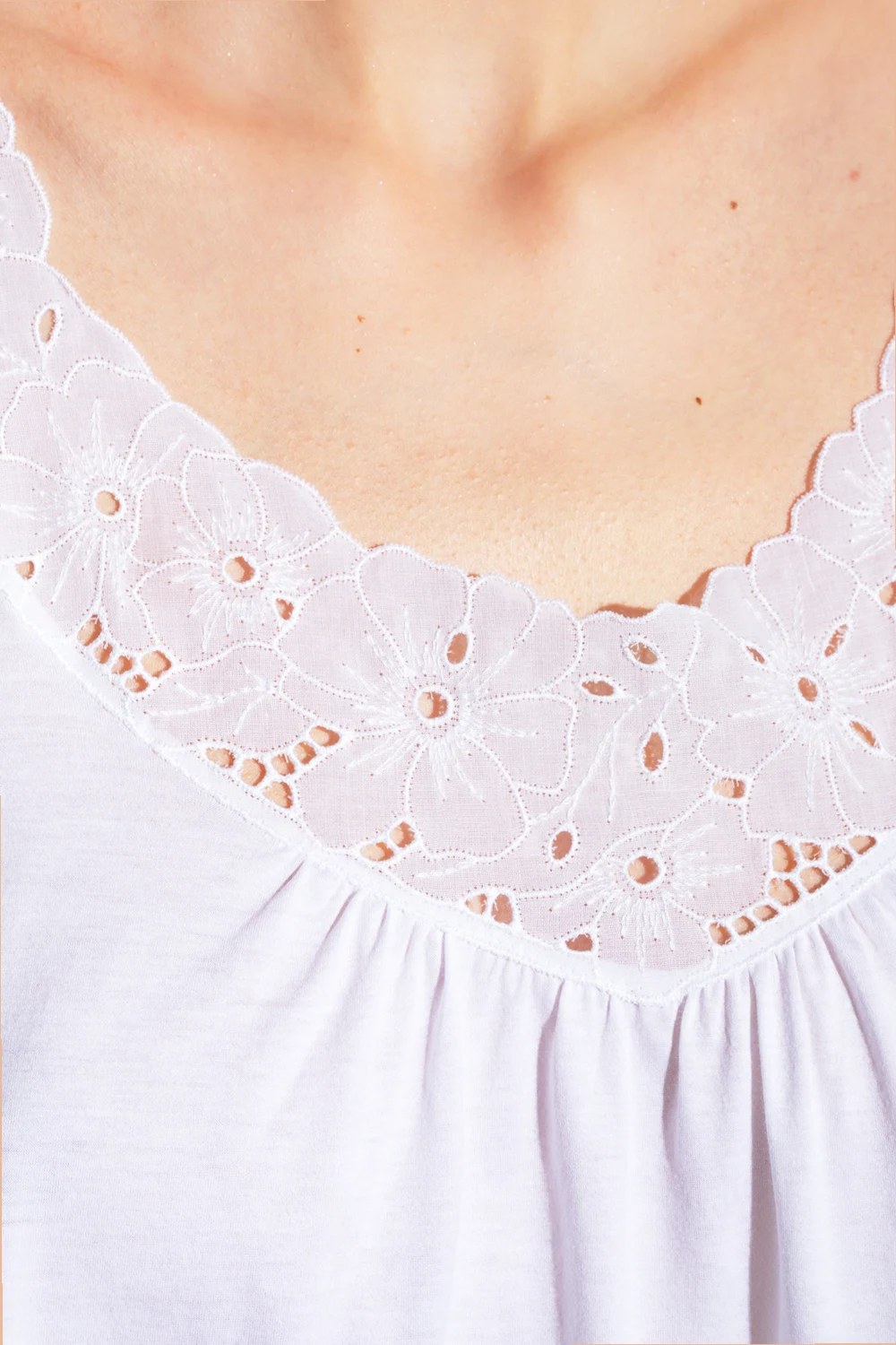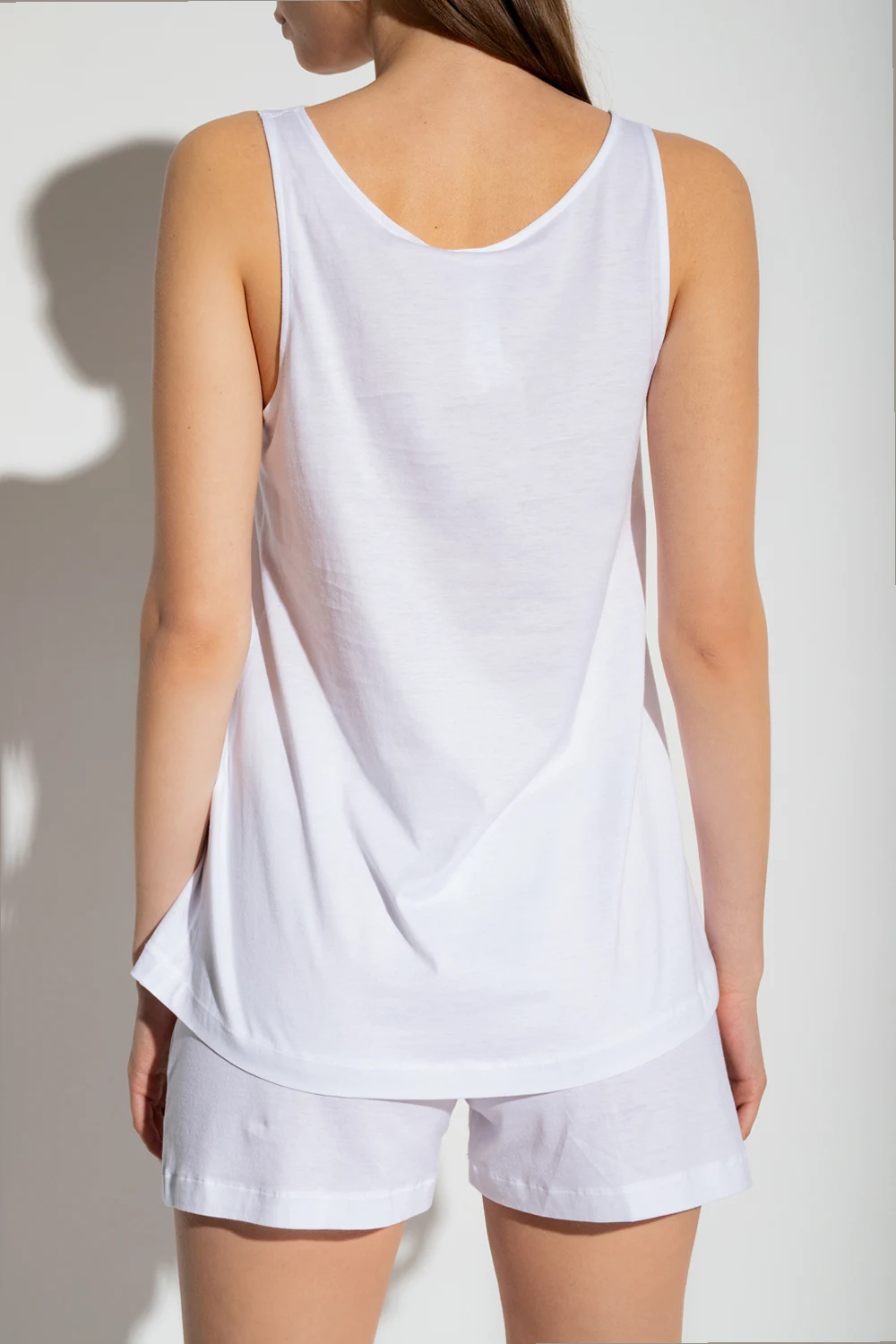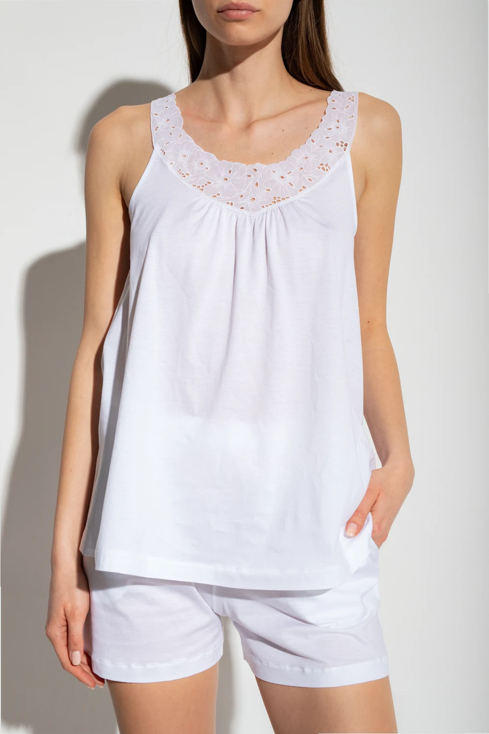 White ‘Maila’ tank top from Hanro. Made of cotton, this style features a round neck and floral embroidery.