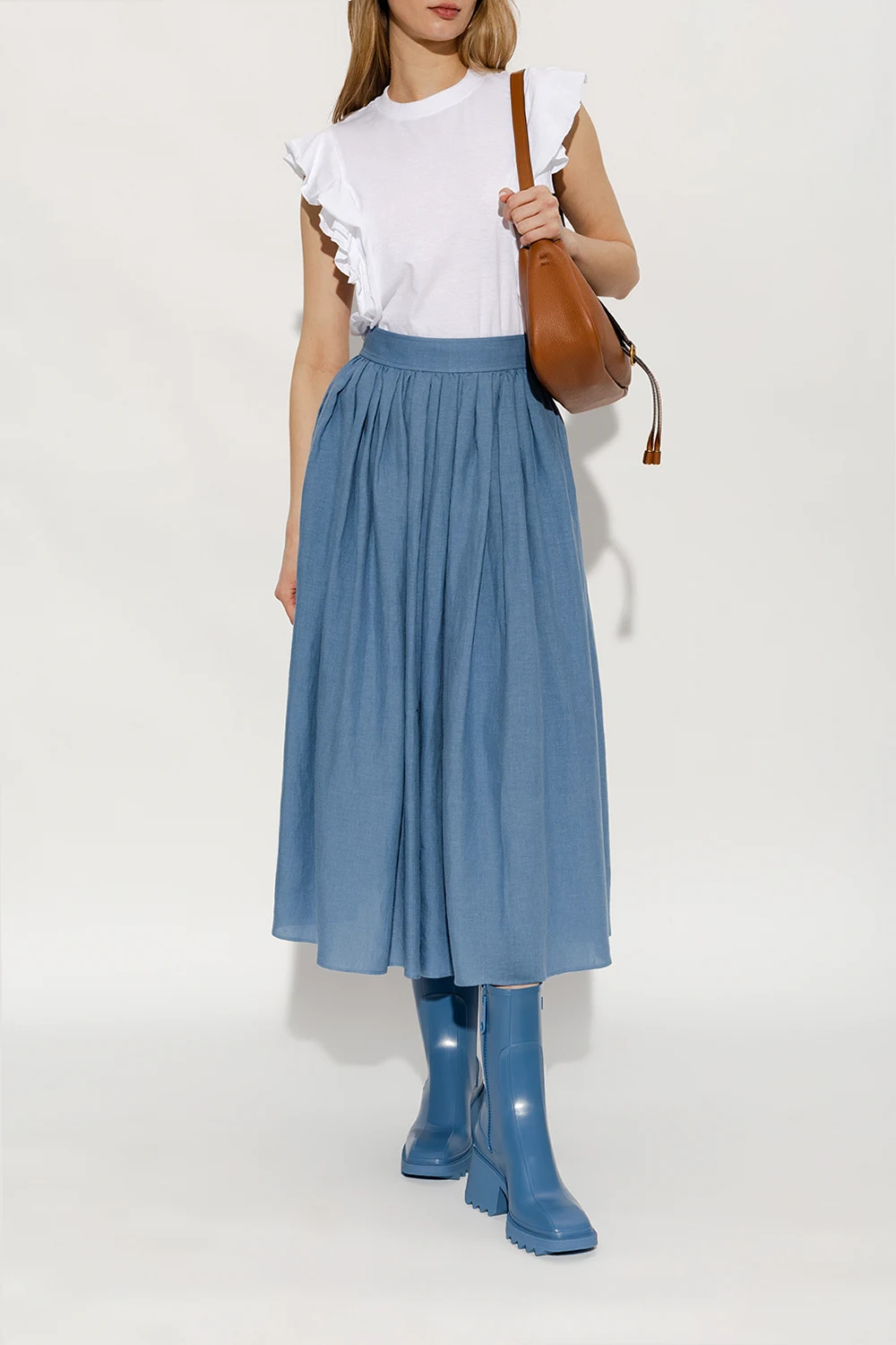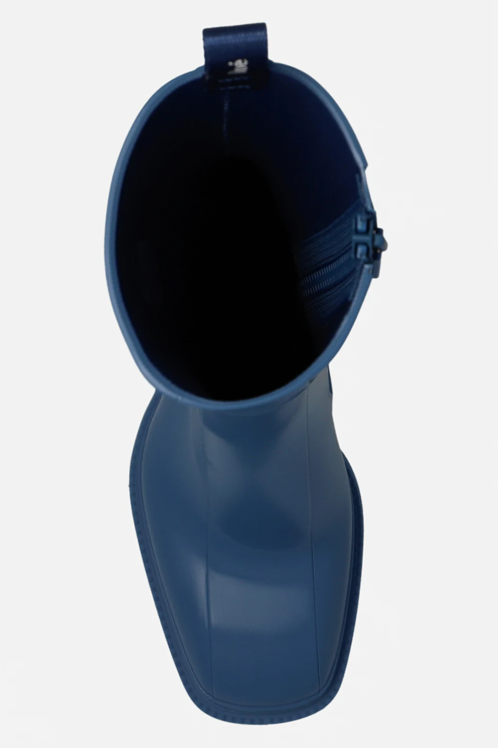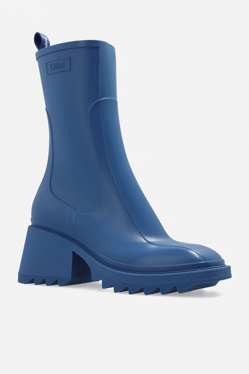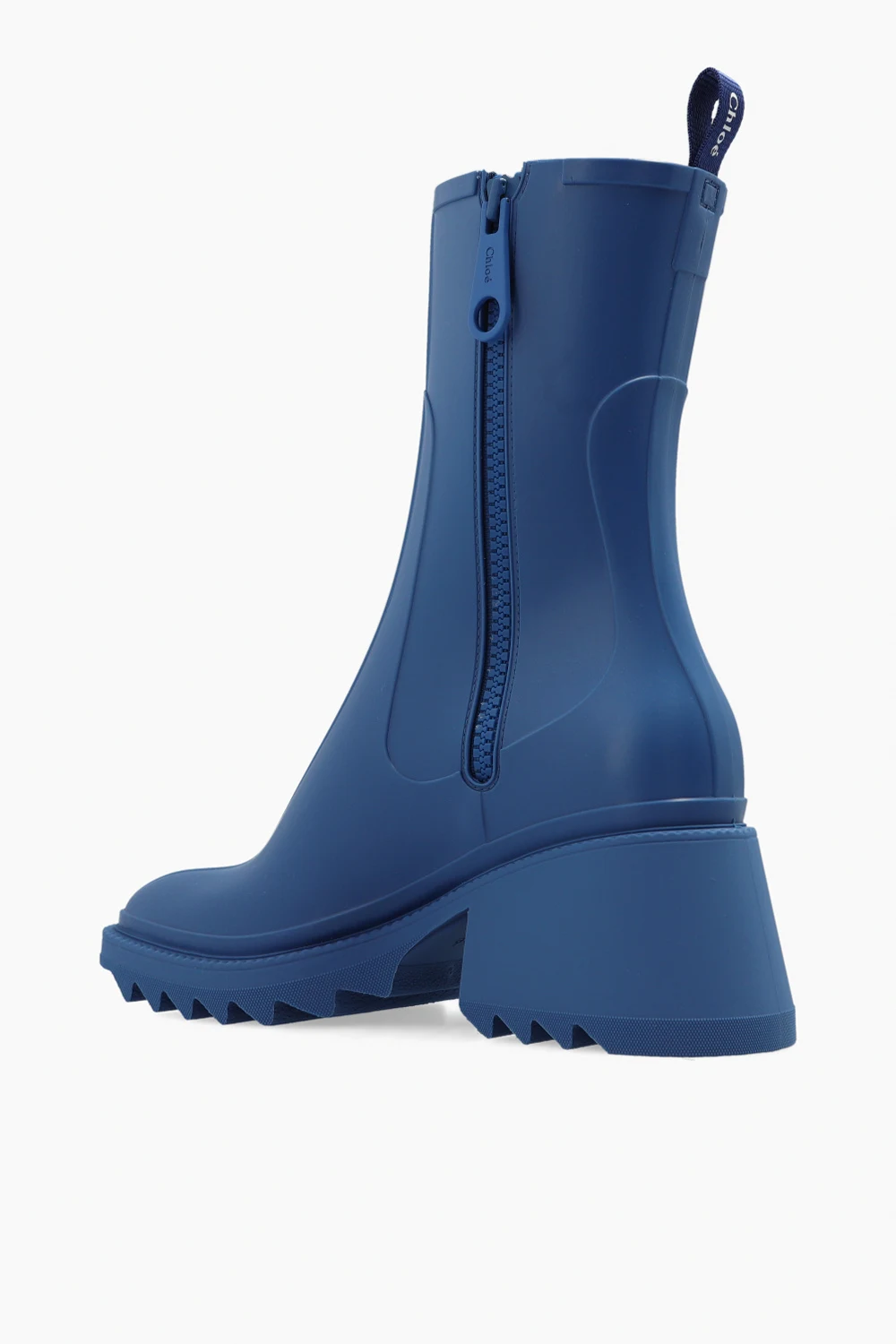 Blue ‘Betty’ heeled rain boots from Chloé. Made of rubber, this pair features a side zip, raised and printed logo, square, rounded toe, block heel and light beige rubber sole.