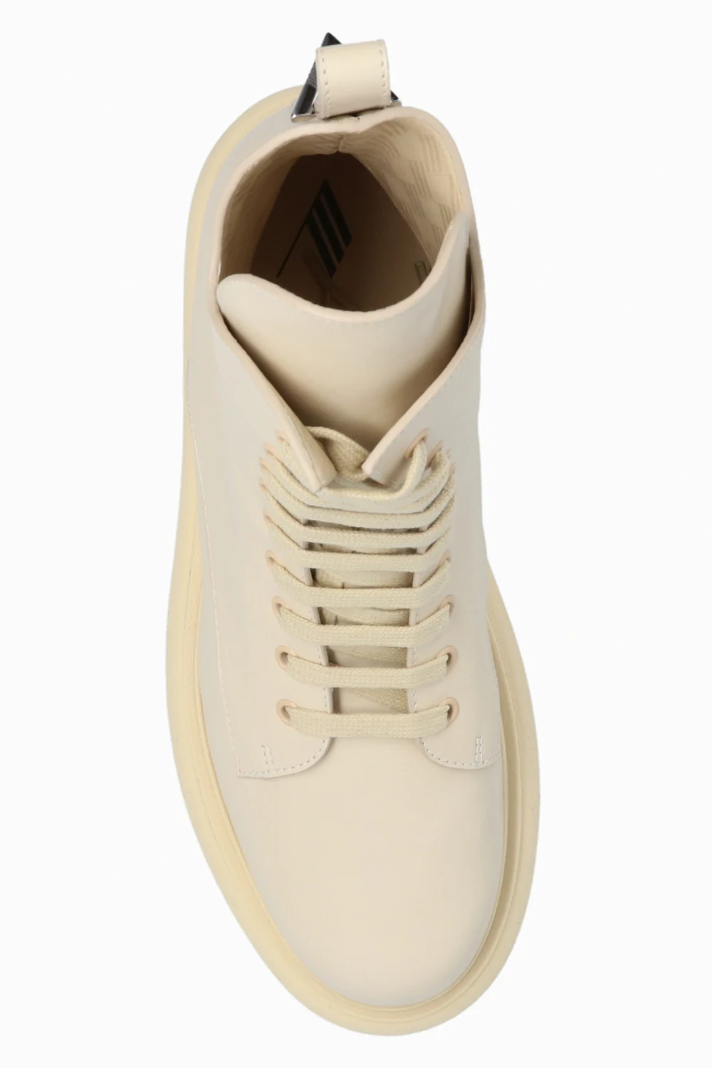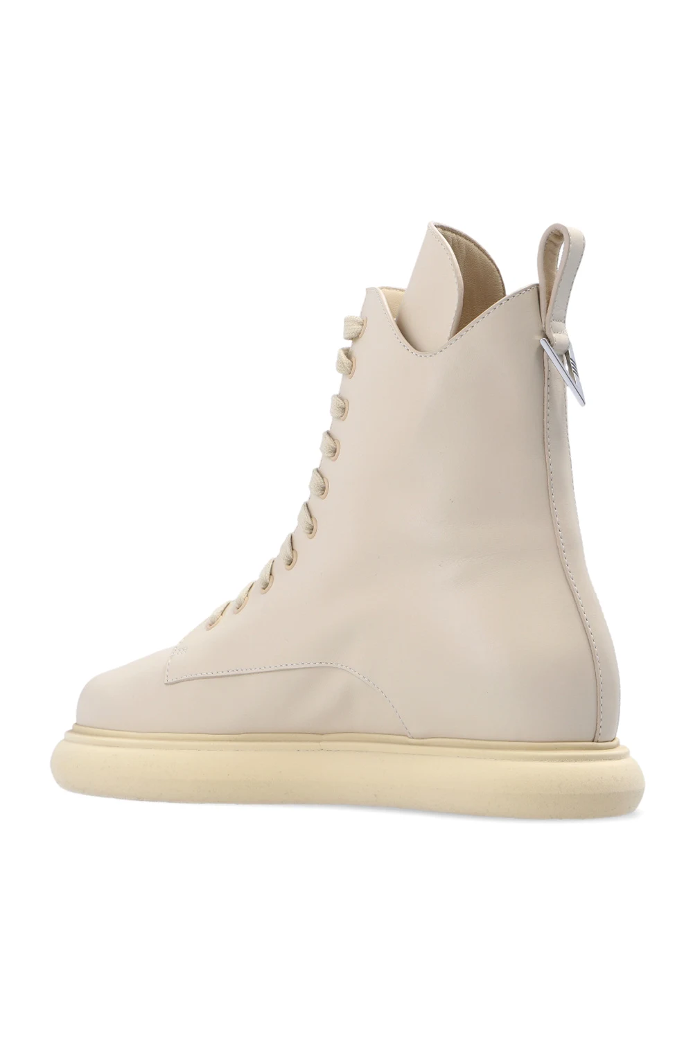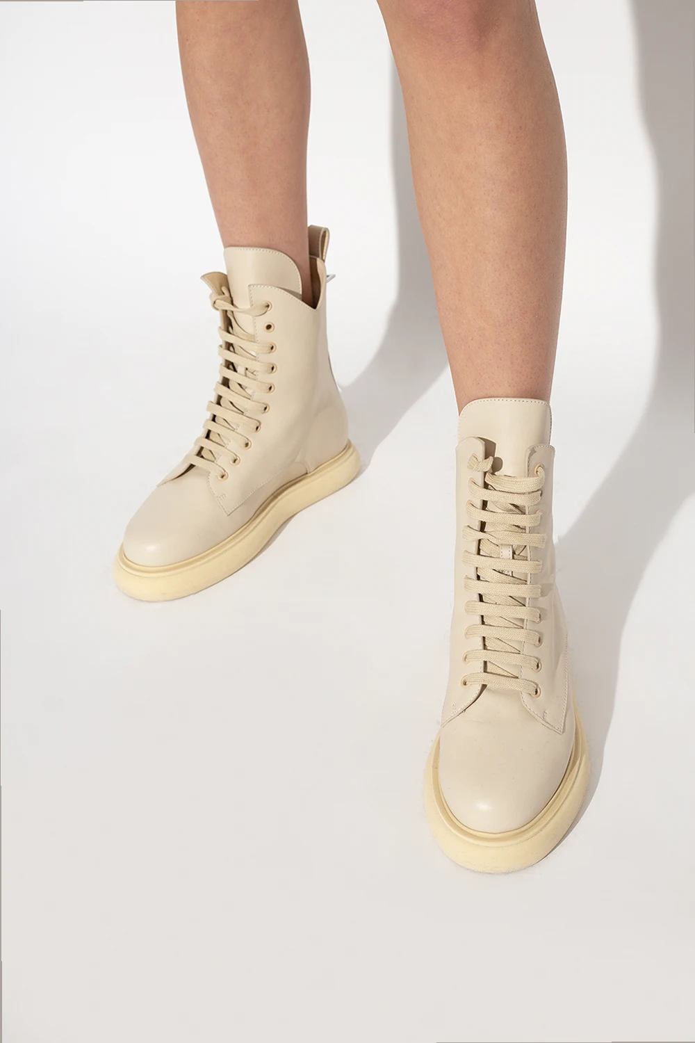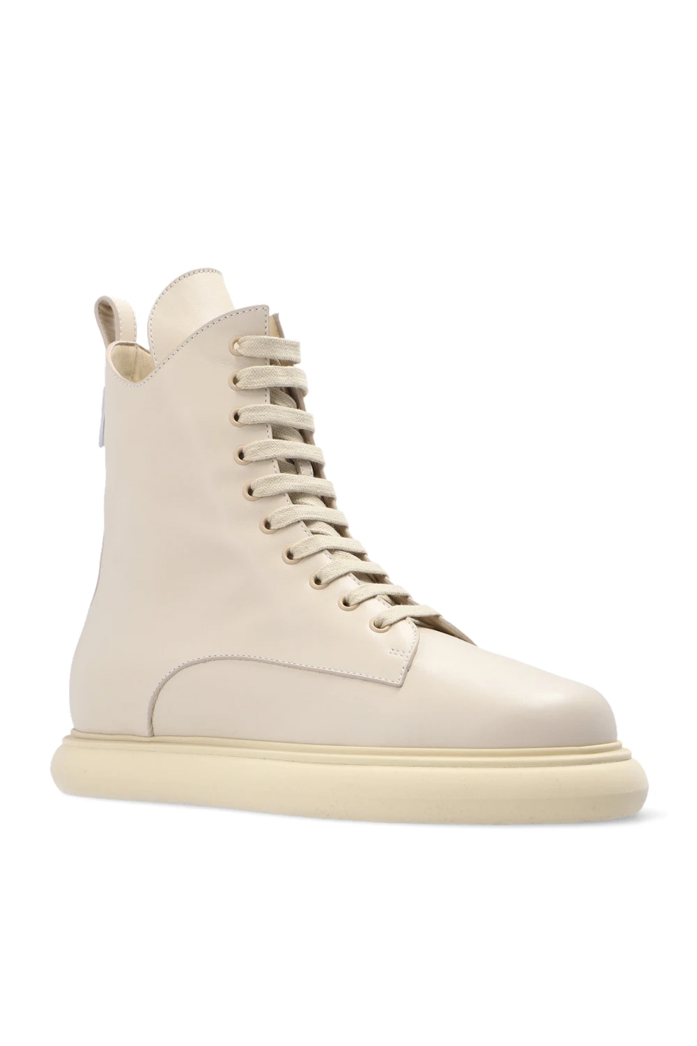 Cream and beige ‘Selene’ high-top boots from The Attico. Made of calf leather, this lace-up pair features a silver-tone logo appliqué, almond toe and beige rubber sole with an embossed pattern.