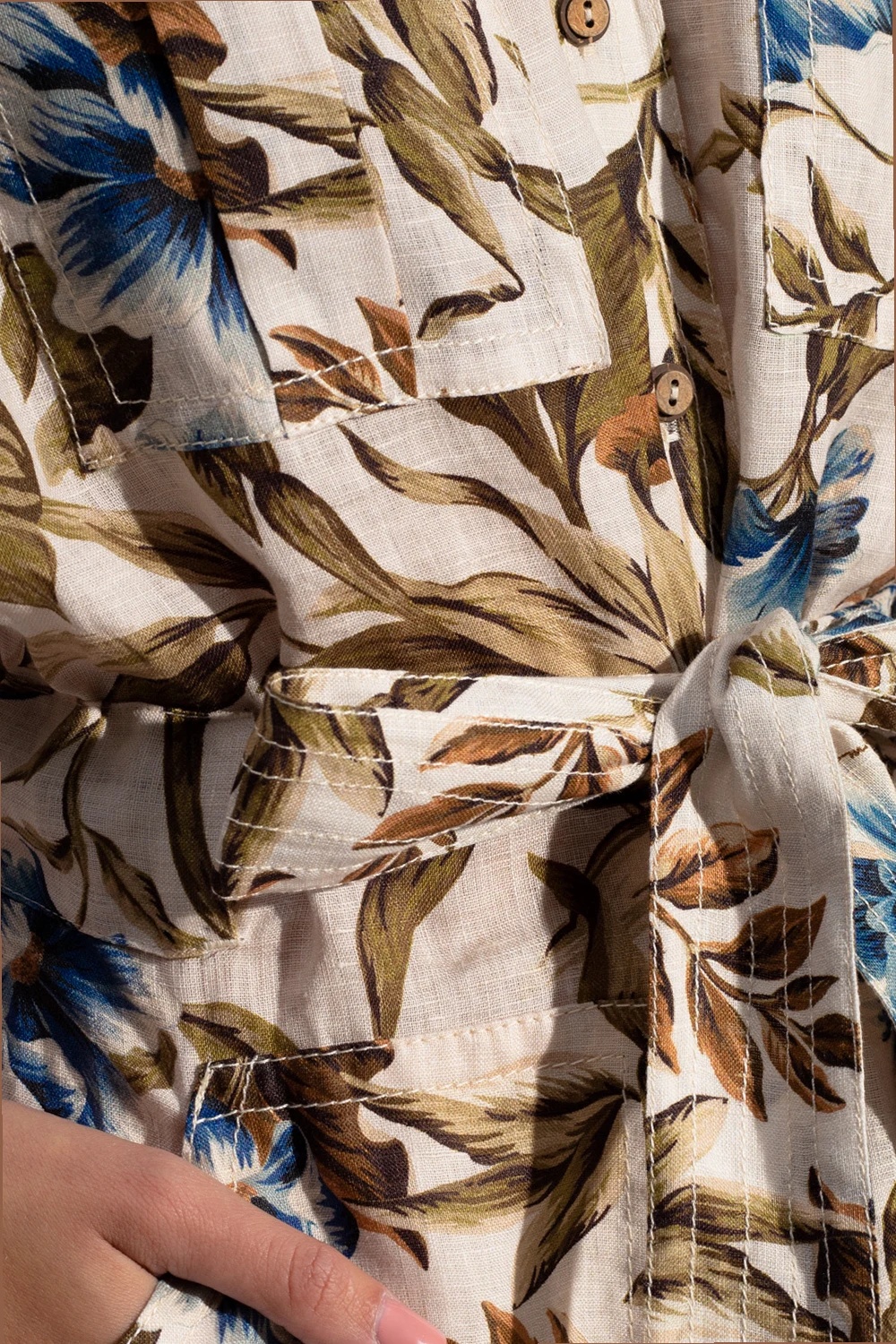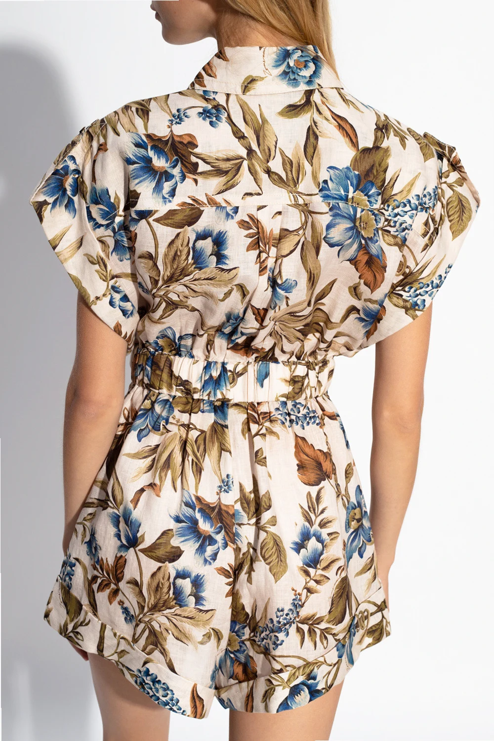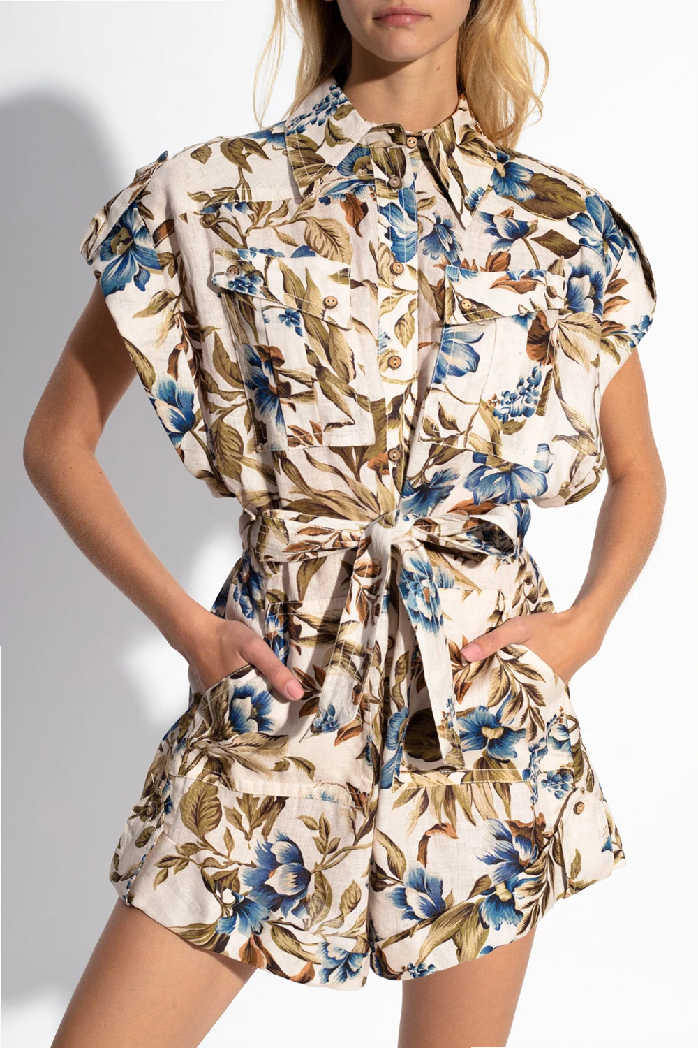 Cream jumpsuit from Zimmermann. Fastened with buttons, this garment features a floral pattern, epaulettes, two slip pockets, two buttoned flap pockets, tie belt and short legs.