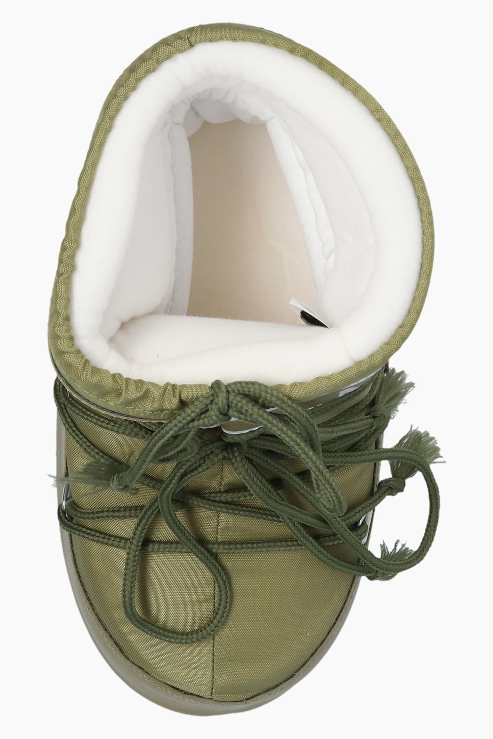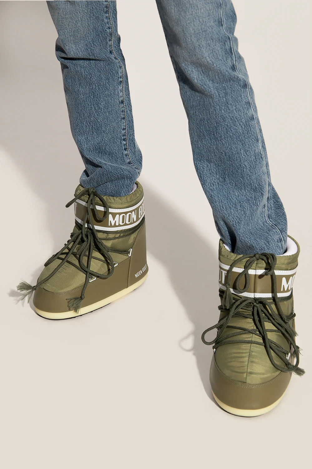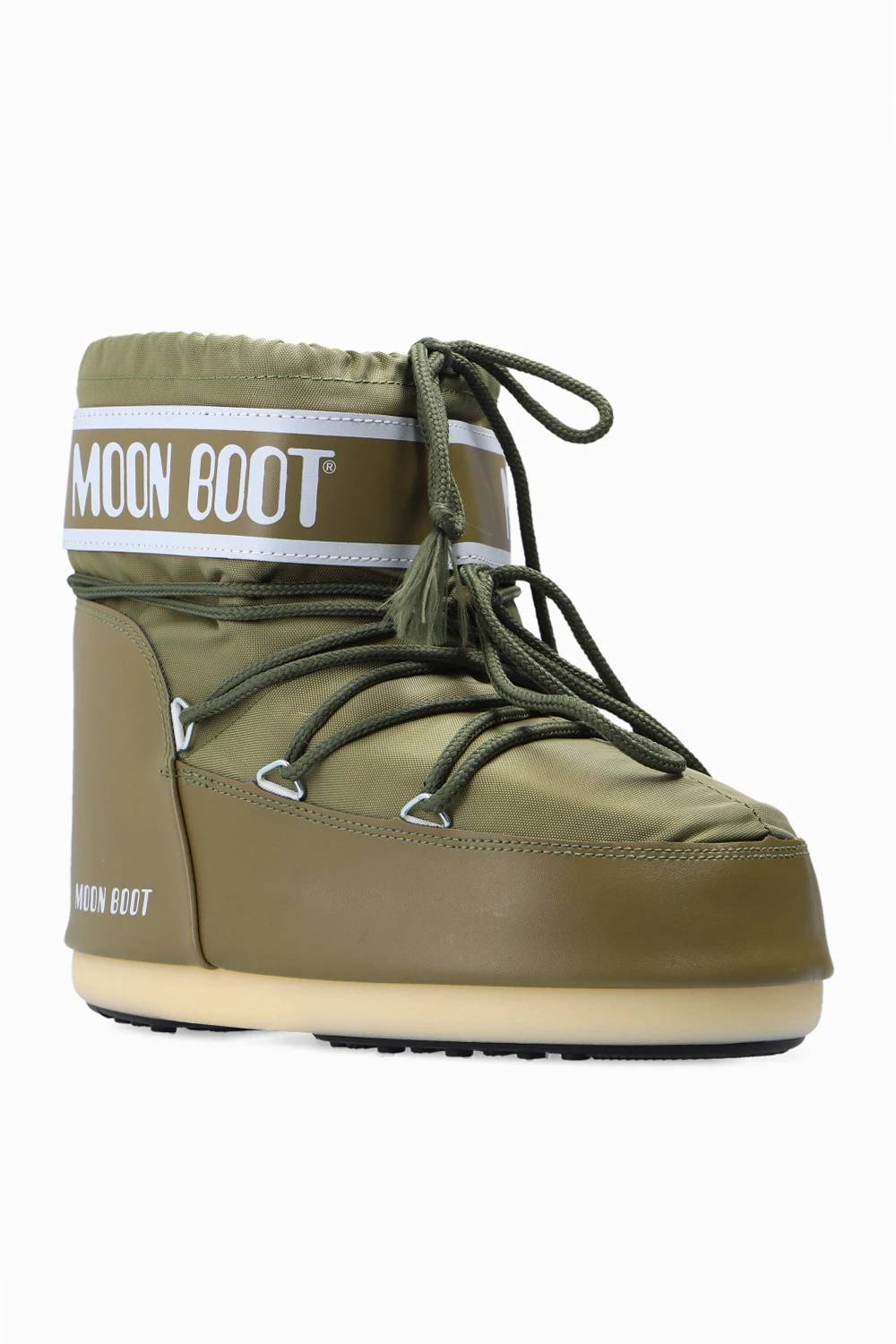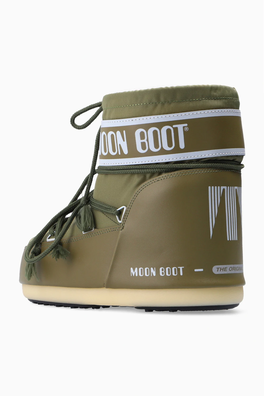 Green ‘Classic Low’ snow boots from Moon Boot. Printed with the brand's logo in white, this model sits on a black and cream rubber sole and features distinctive laces and silver-tone metal hardware. Inspired by the peculiar shape and technology of the astronauts' boots, the iconic style was designed in 1969 after the first Moon landing.