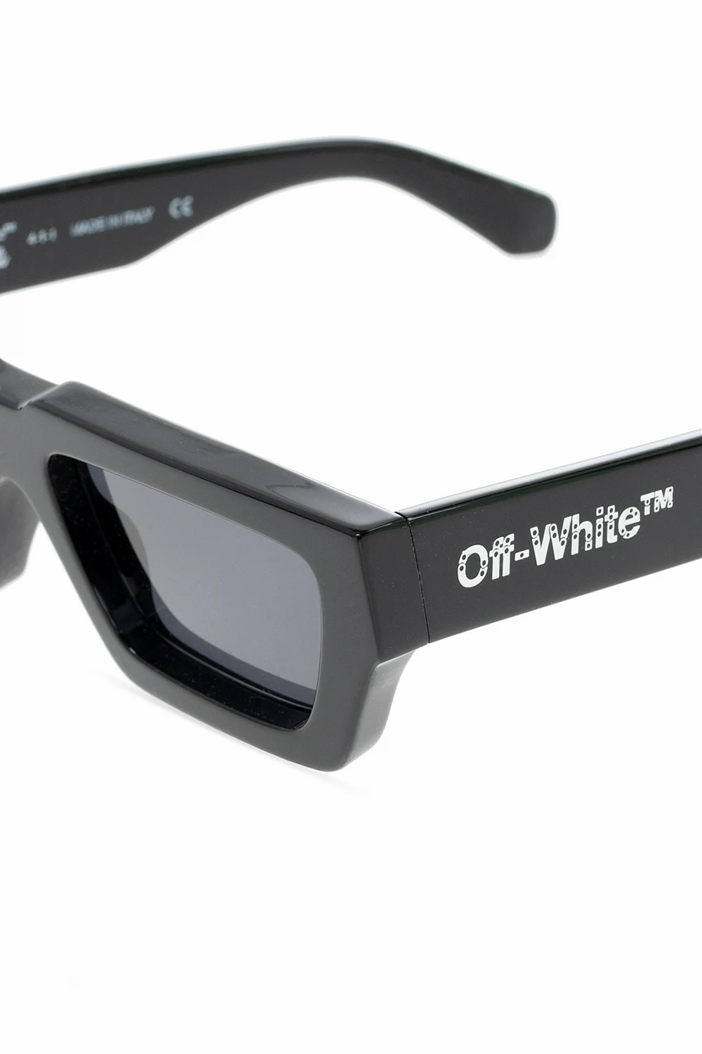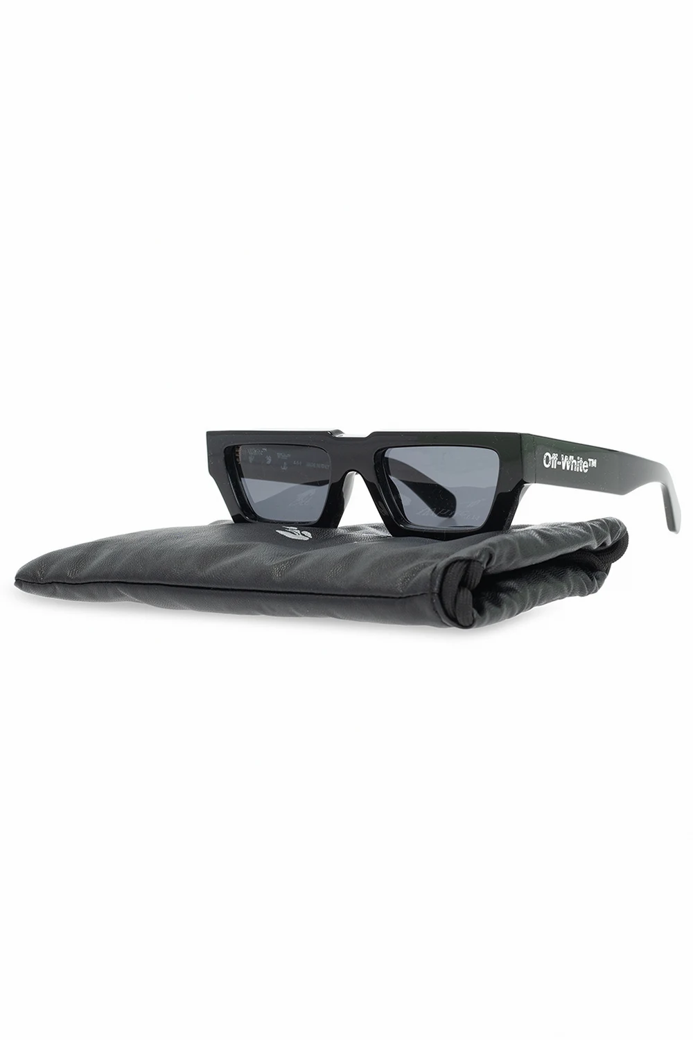 Black sunglasses from Off-White. This model features a white logo appliqué and dark grey certified lenses with UVA/UVB protection and a logo. It comes with a black case with a silver-tone logo print and a strap.