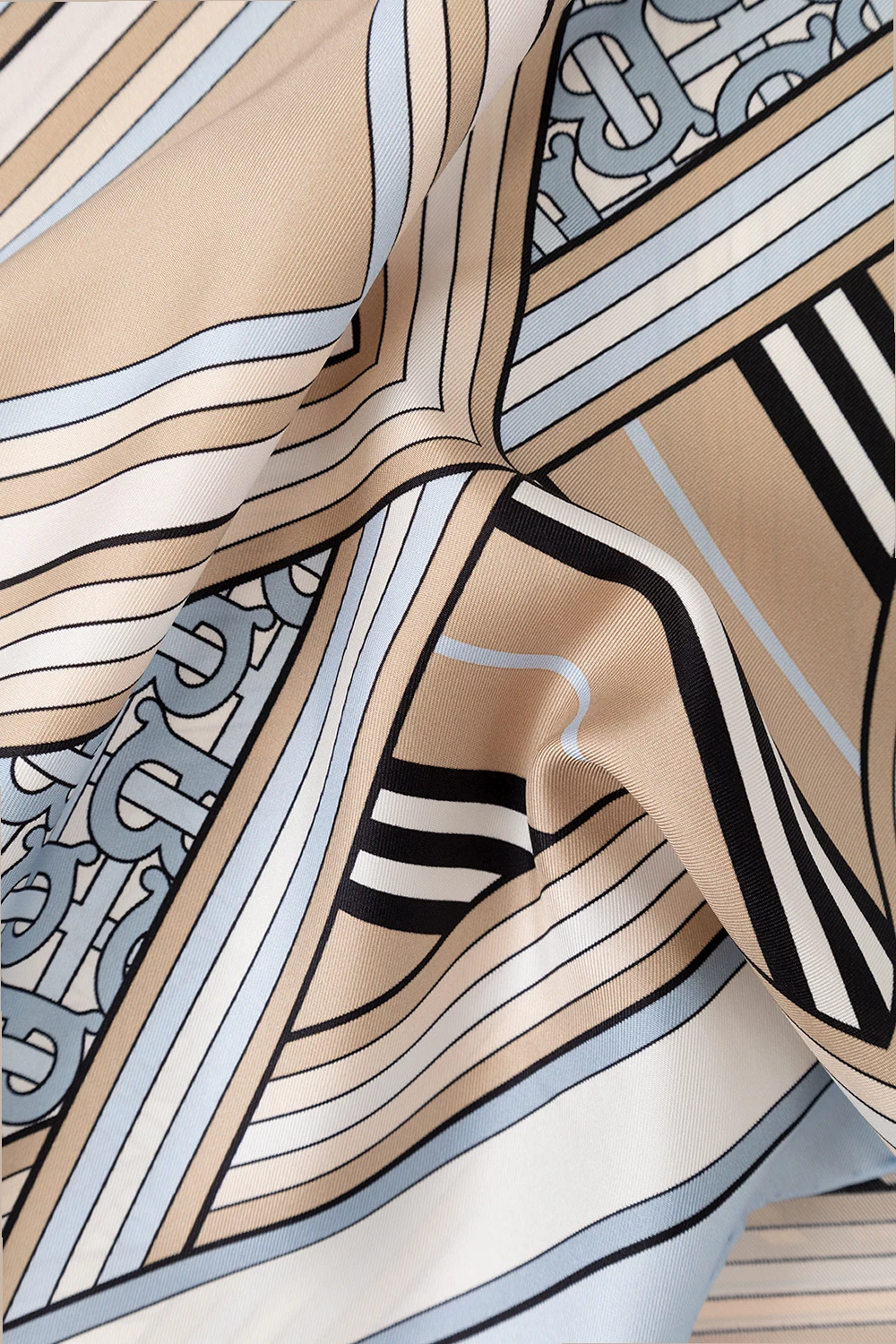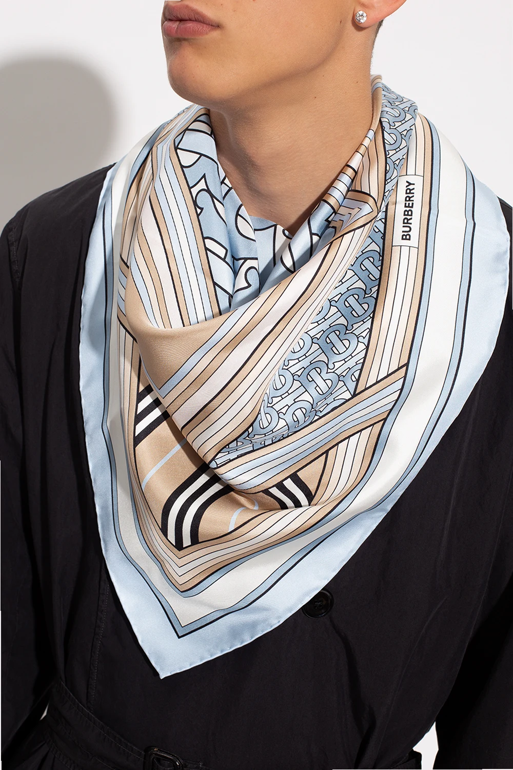Blue, cream and beige scarf from Burberry. Made of silk, this design features a geometric and monogram pattern as well as hand-crafted trimming.