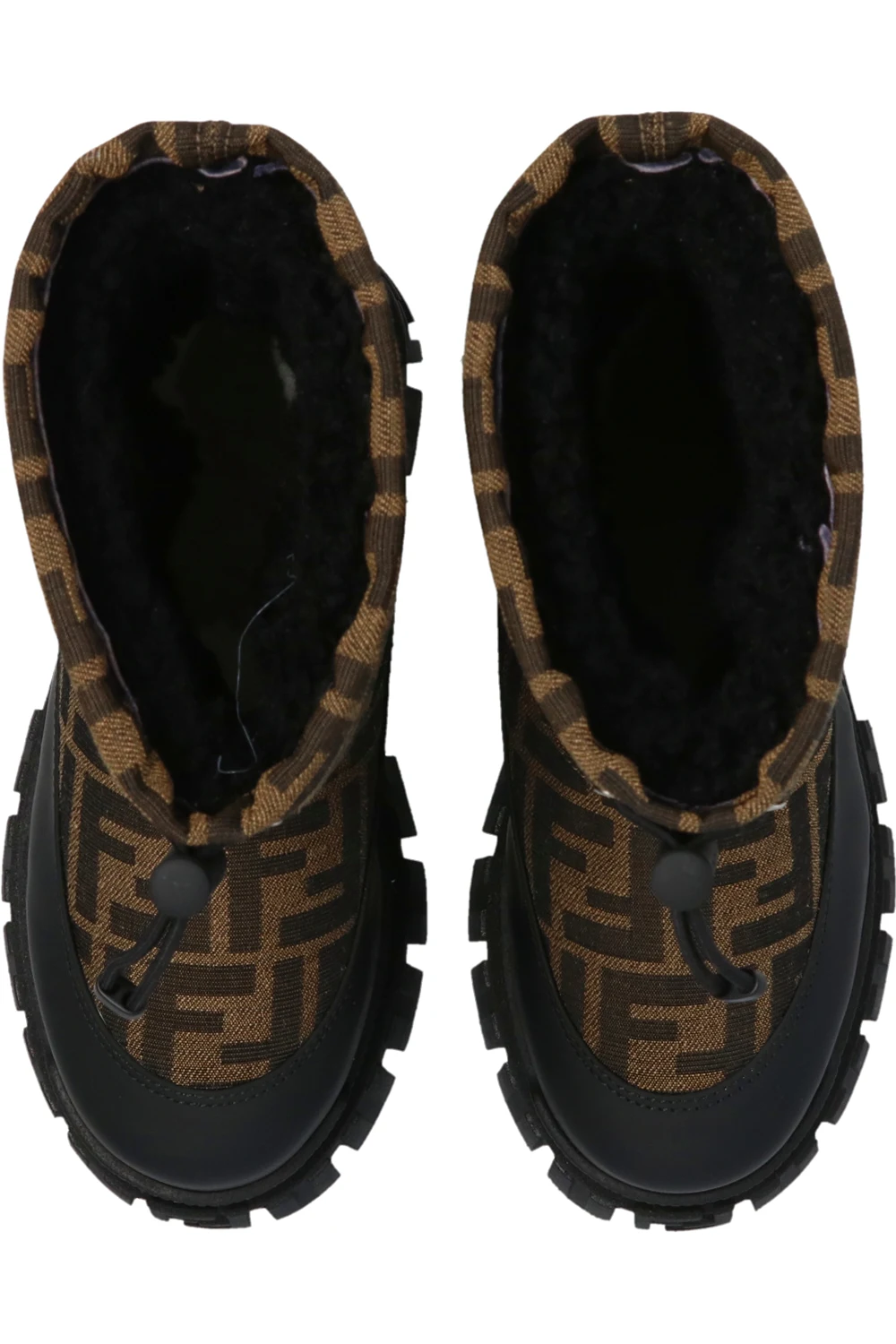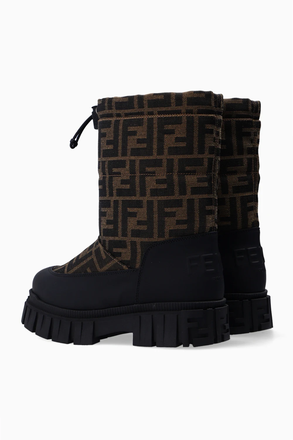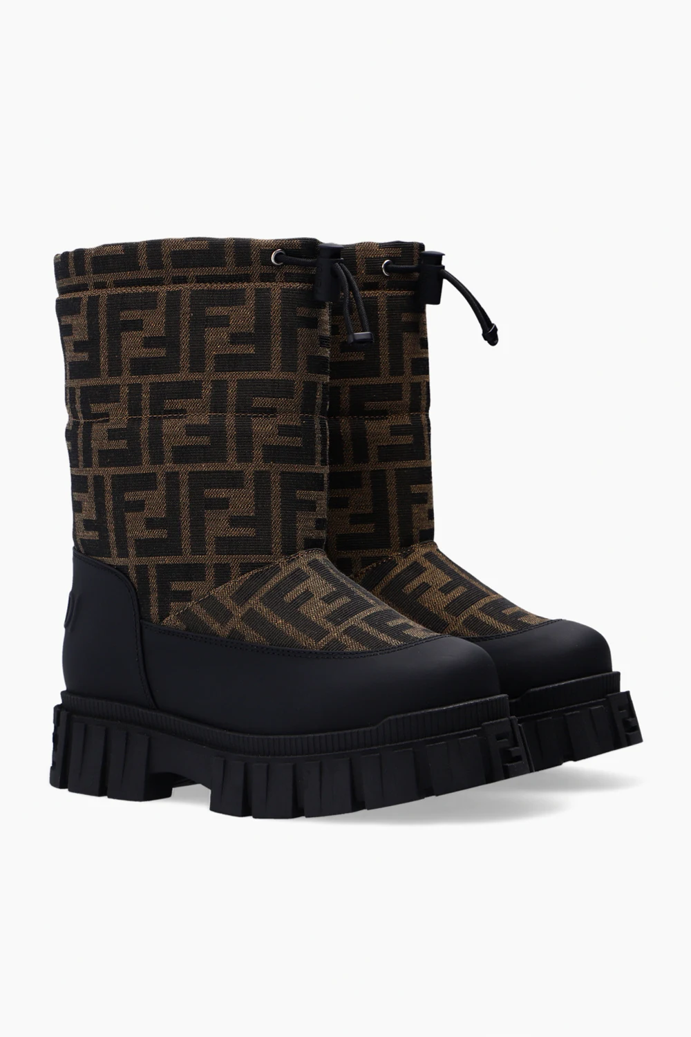 Black, beige and brown snow boots from Fendi. Enriched by the brand's logo, this model features a drawstring fastening and a black rubber sole.