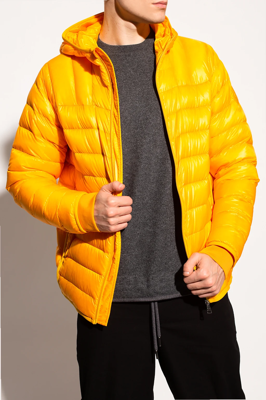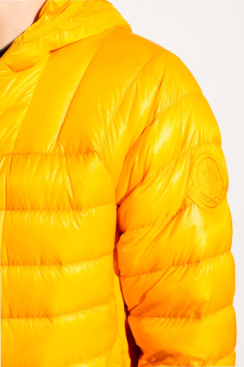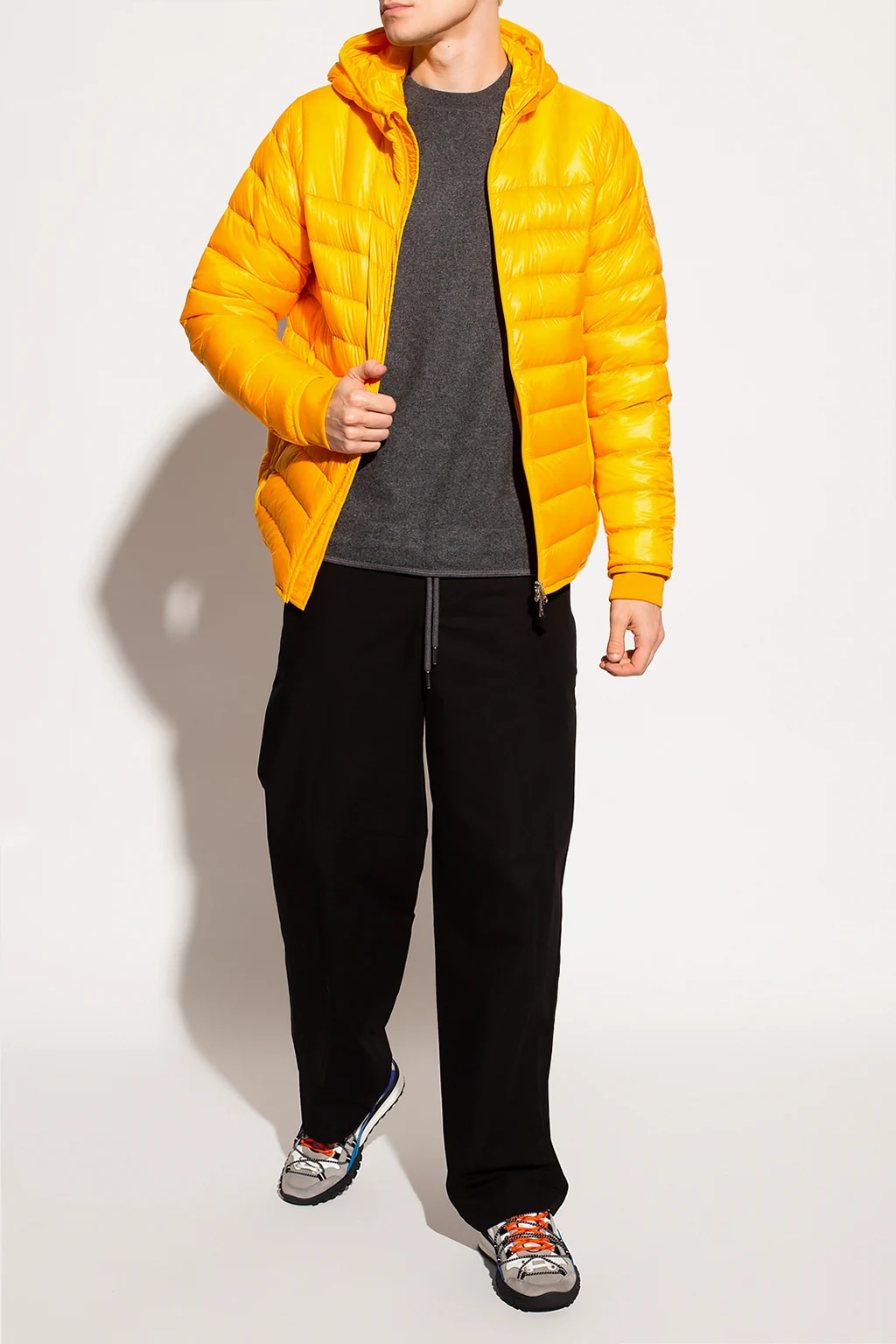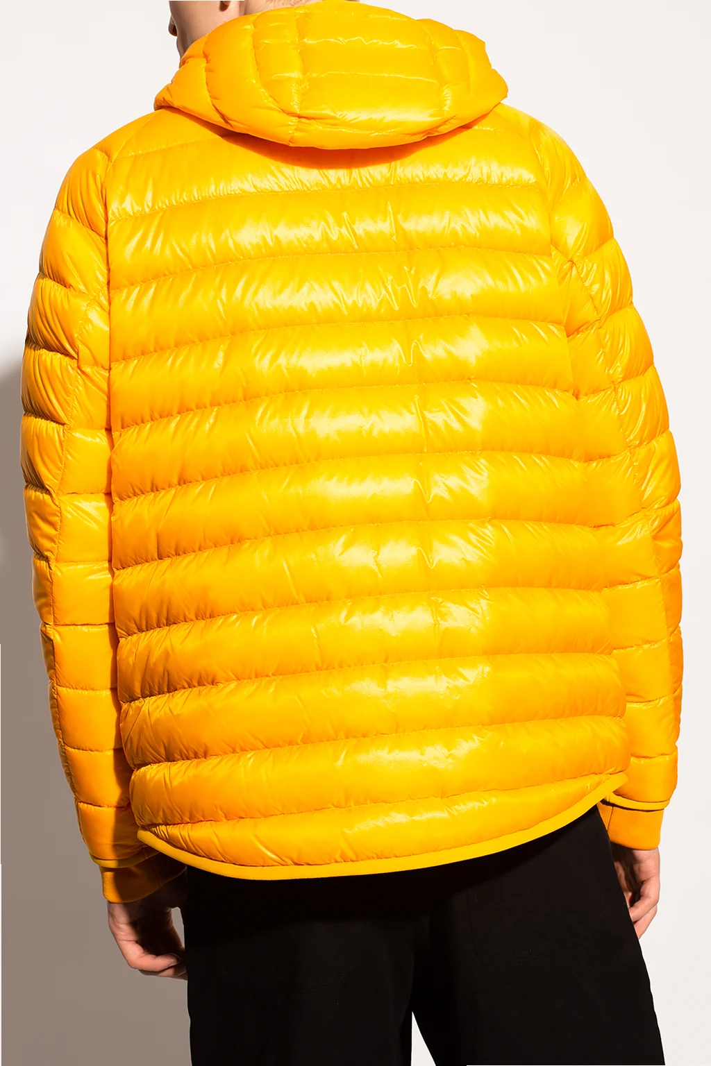 Yellow hooded quilted jacket from Moncler Genius, the ‘1952 no. 2’ collection. Fastened with a zip, this garment features a logo patch, two slip pockets, two zip pockets and ribbed trims at the hem and cuffs.