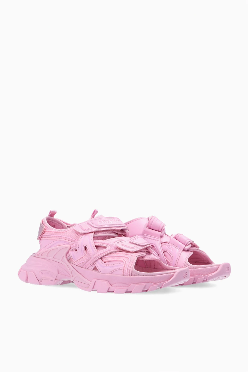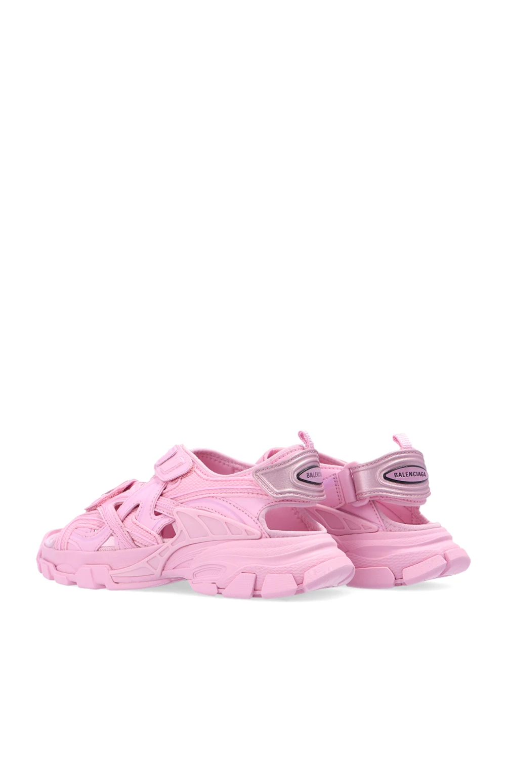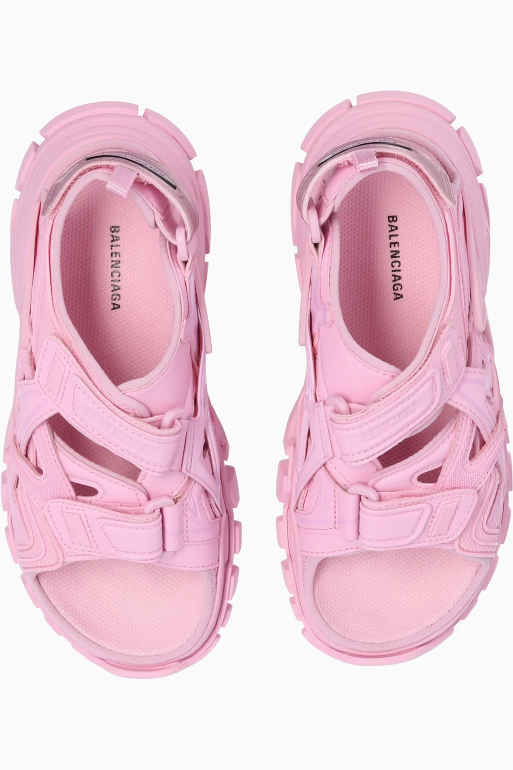 Pink ‘Track’ sandals from Balenciaga Kids. Fastened with velcro, this pair features an embossed logo, decorative cut-outs and a pink rubber sole.