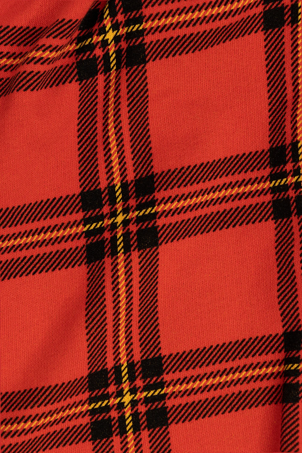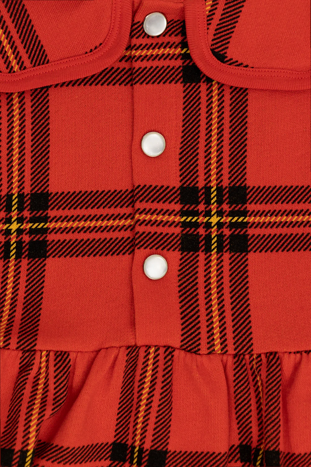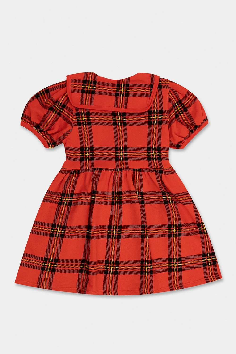 Red dress with short sleeves from Mini Rodini. Crafted from organic cotton with the GOTS certficate, this design features a black and yellow check pattern and snap-fastened collar.
