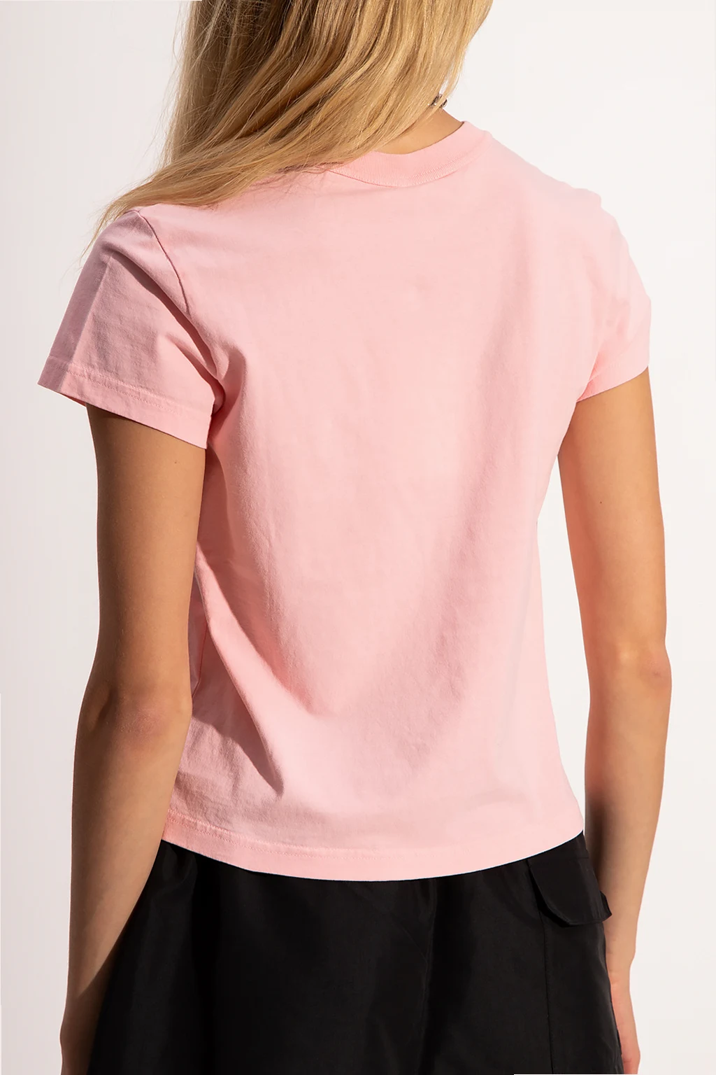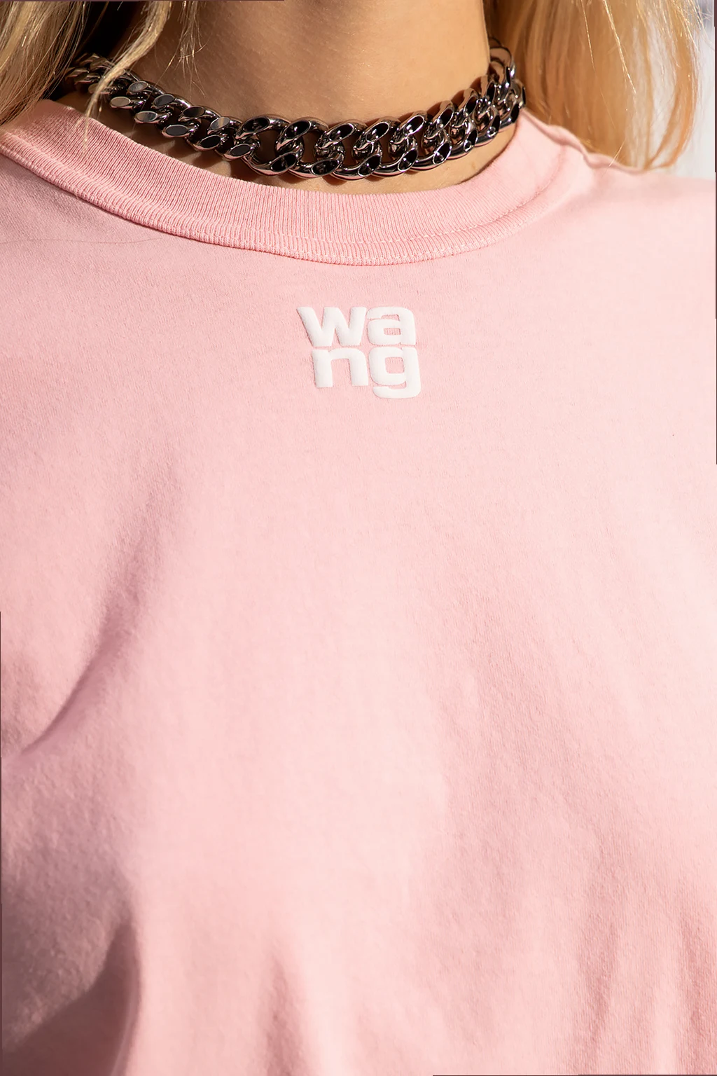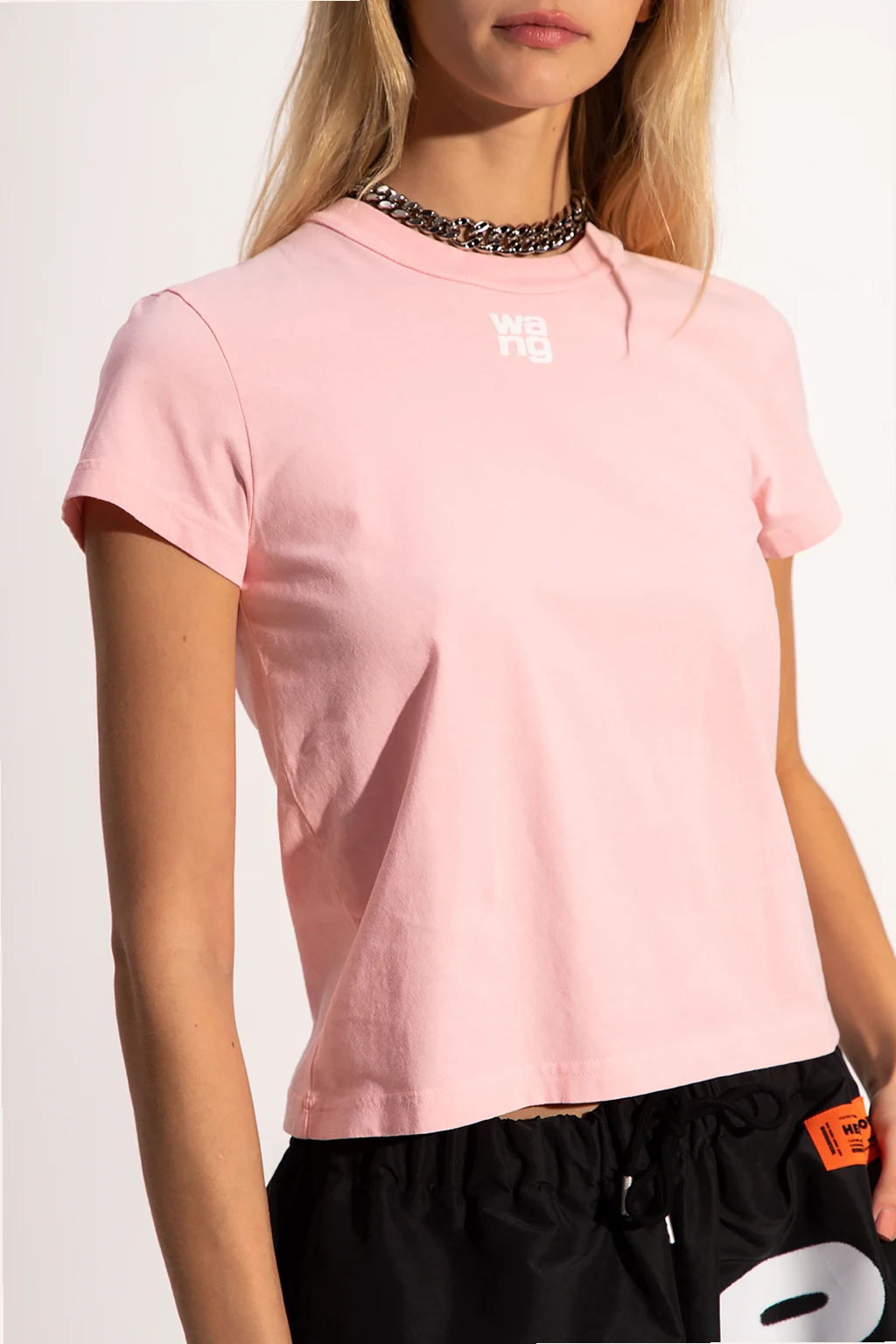 Pink crewneck T-shirt from T by Alexander Wang. Crafted from cotton, this style features an elasticated collar, short sleeves and a white graphic print with the brand's logo.