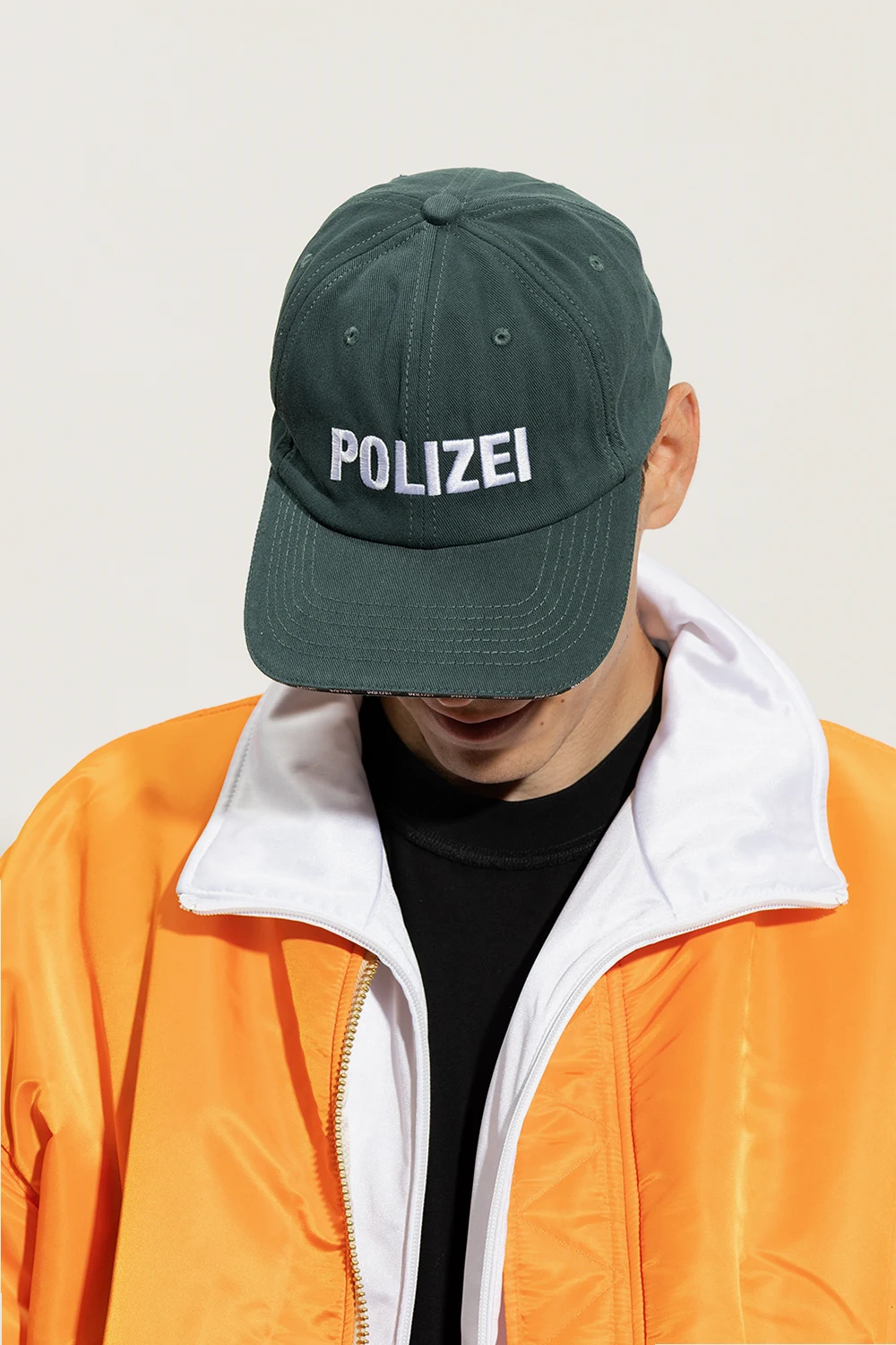 Green baseball cap from VETEMENTS. Made of cotton, this item features velcro fastening and ‘Polizei’ lettering on the front and visor.