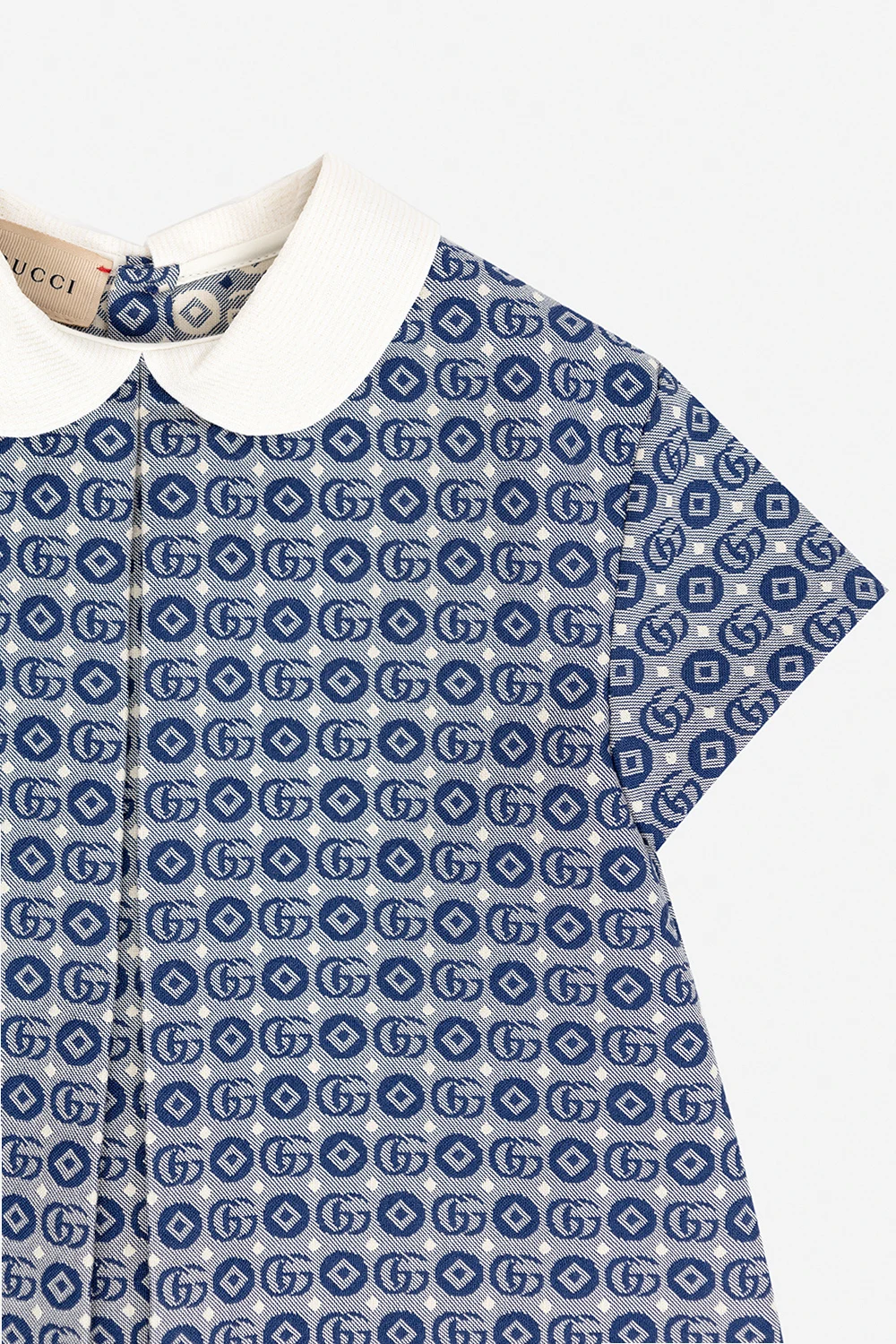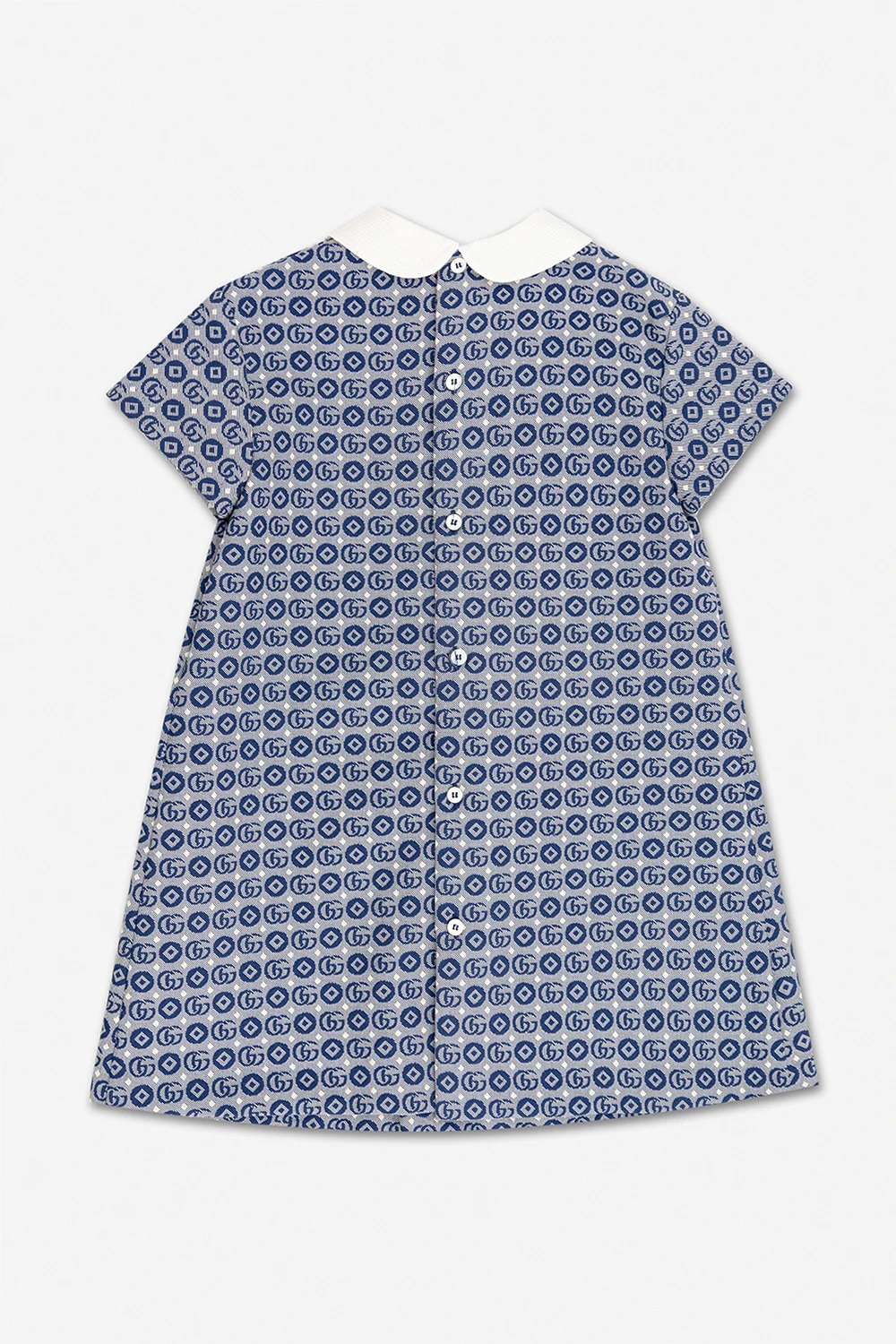 Cream and navy dress from Gucci Kids. Crafted from cotton, this garment features button fastenings, monogram pattern and short sleeves.