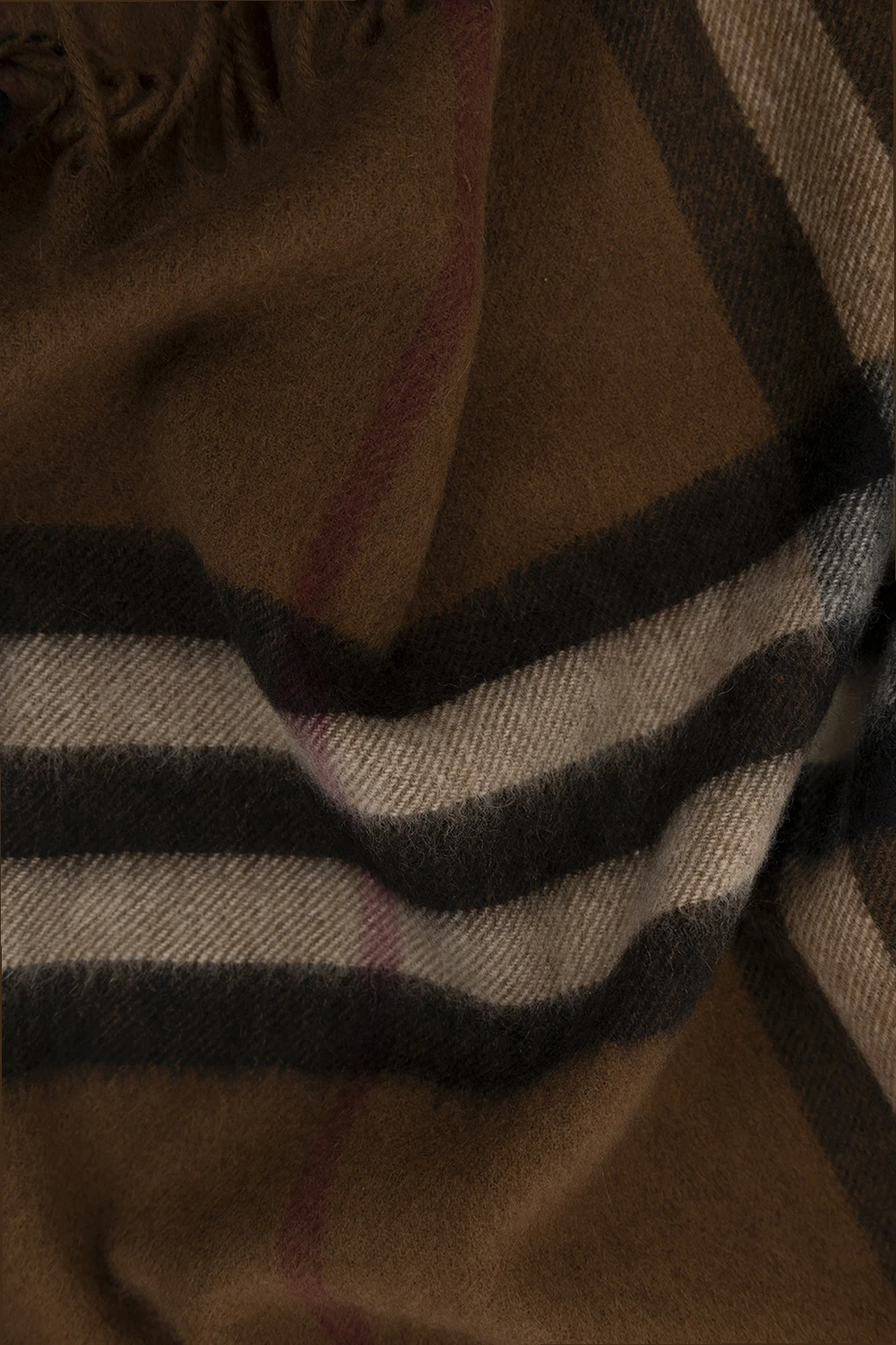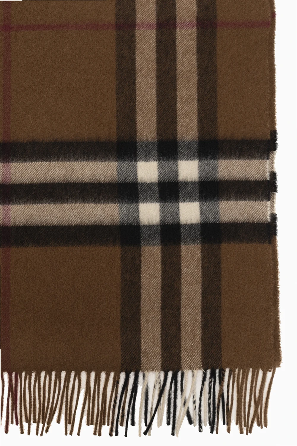 Brown scarf from Burberry. Made of cashmere, this design features fringe edges and the brand’s signature Exaggerated Check pattern.