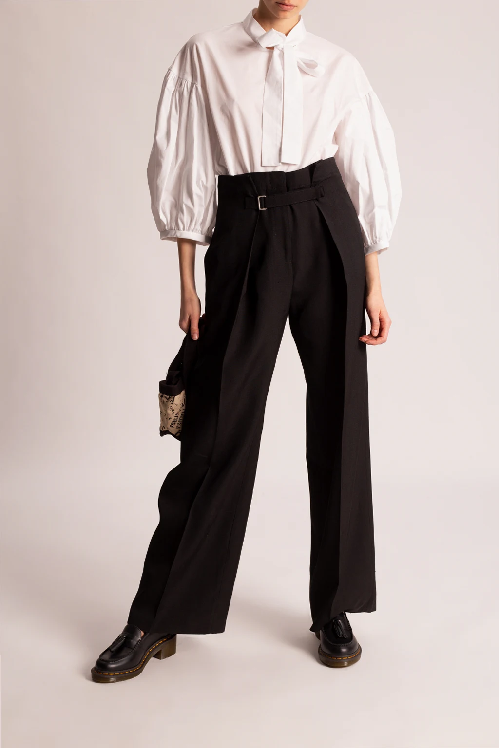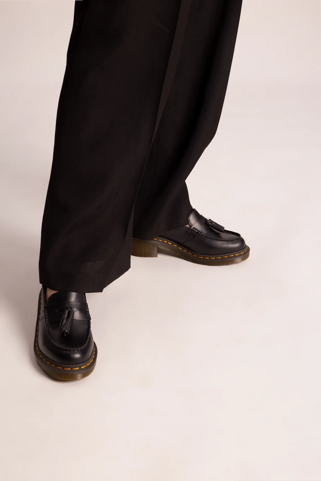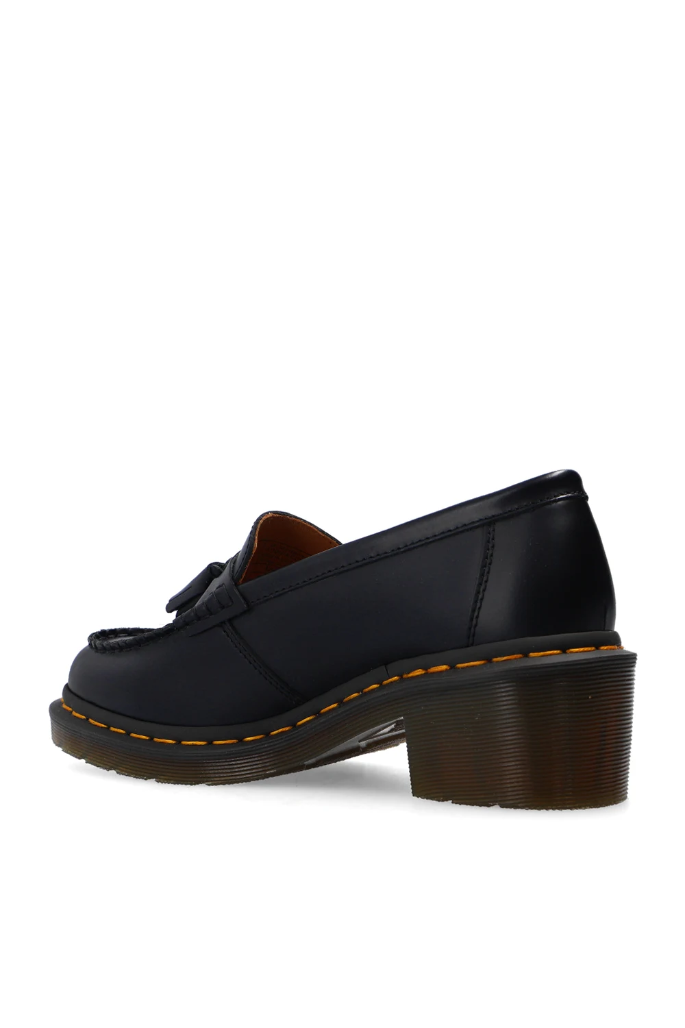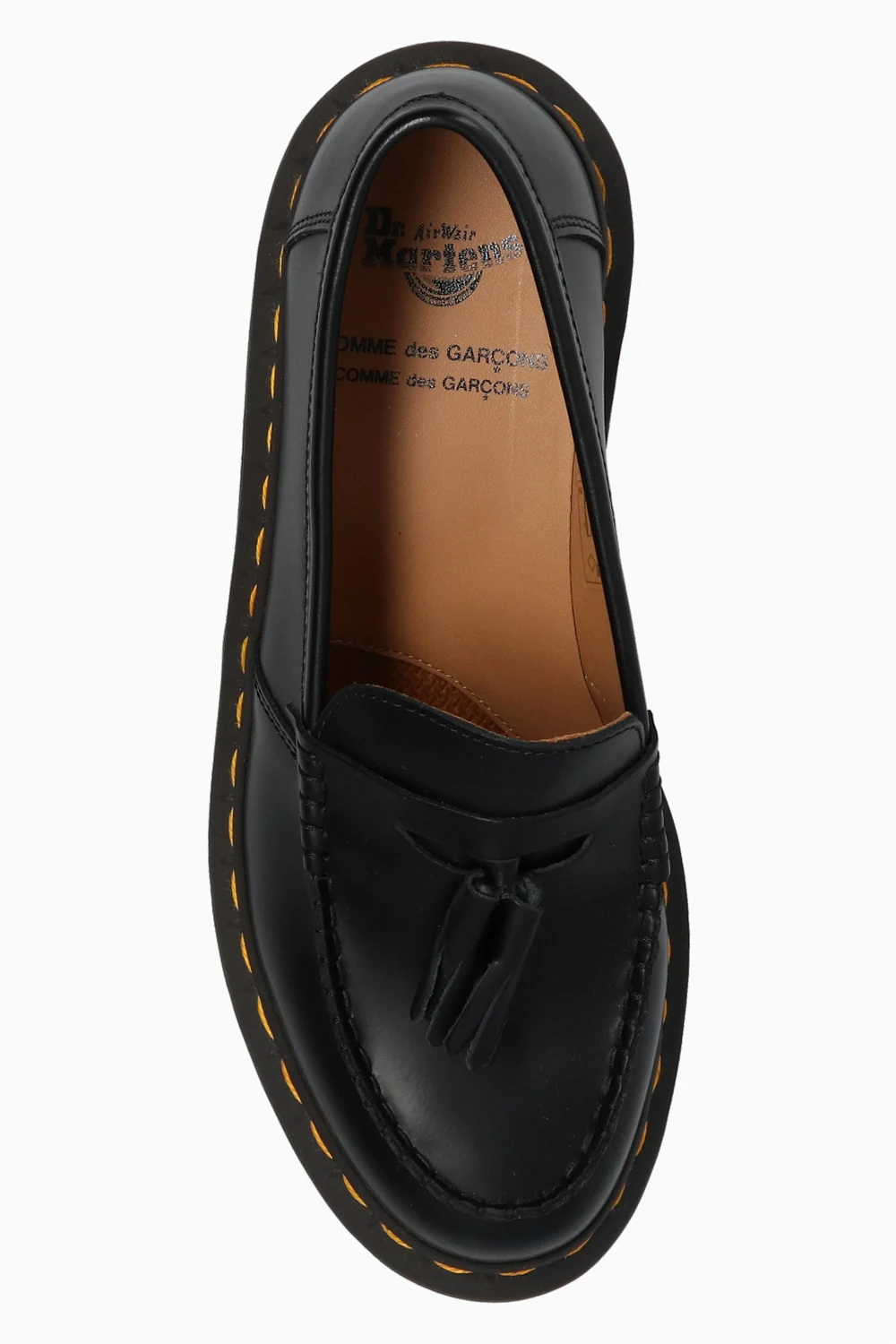 Black ‘Addina’ heelded loafers from CDG by Comme des Garçons x Dr. Martens. Crafted from leather, this pair sits on a brown rubber sole and showcases exposed yellow stitching details and decorative tassels on the front.