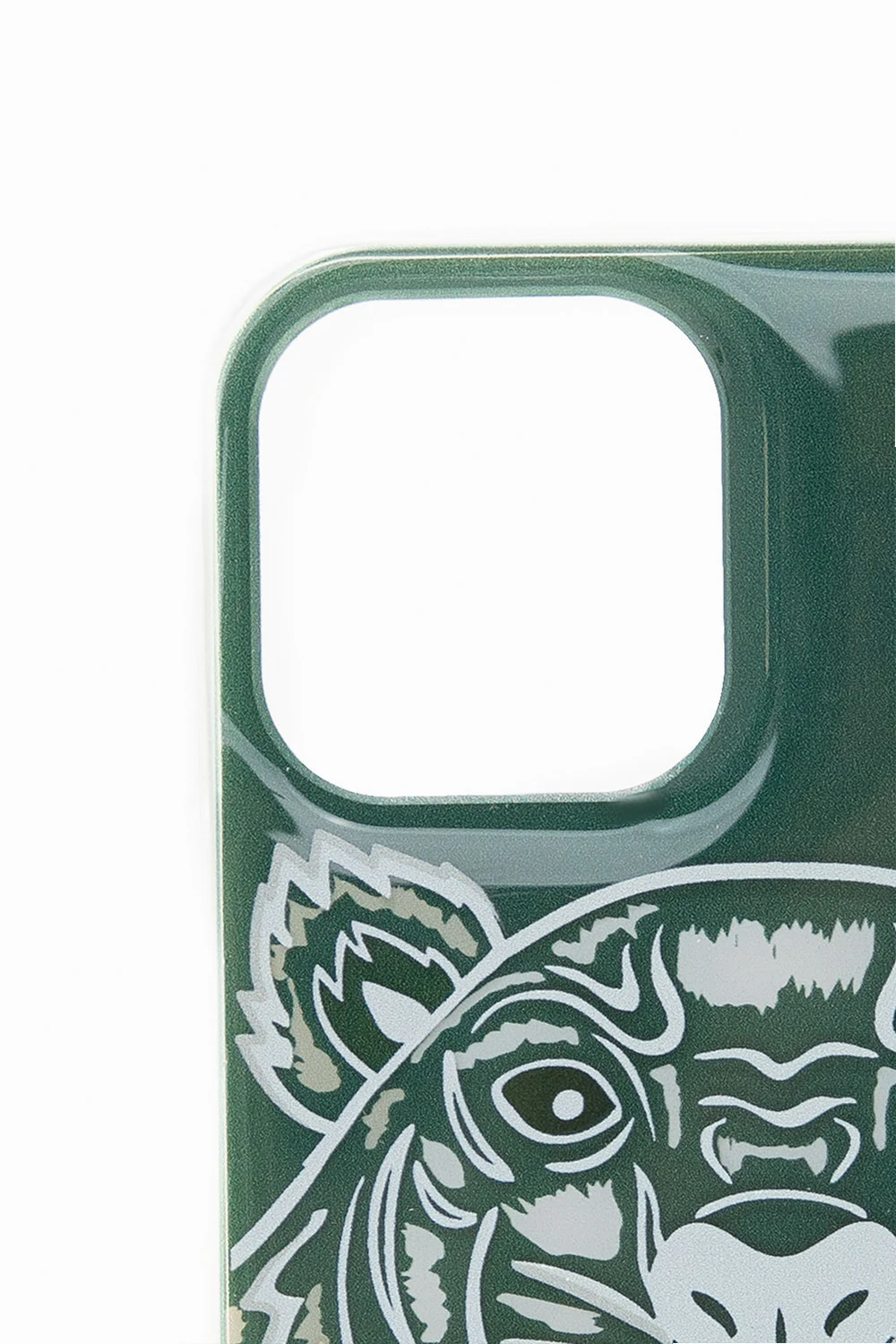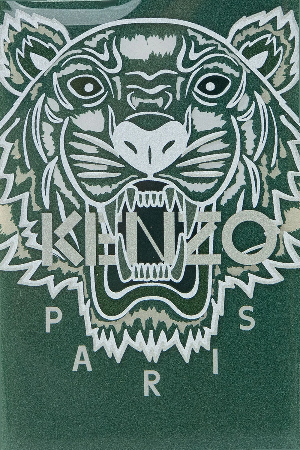 Green, transparent iPhone 11 Pro case from Kenzo featuring a tiger head print and a logo in white and grey.