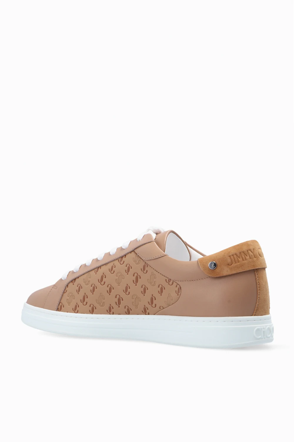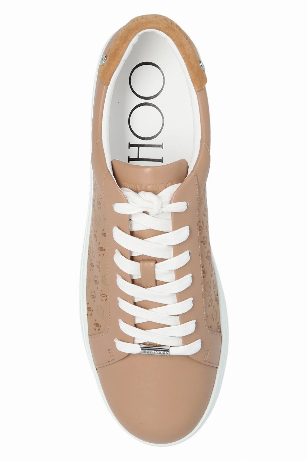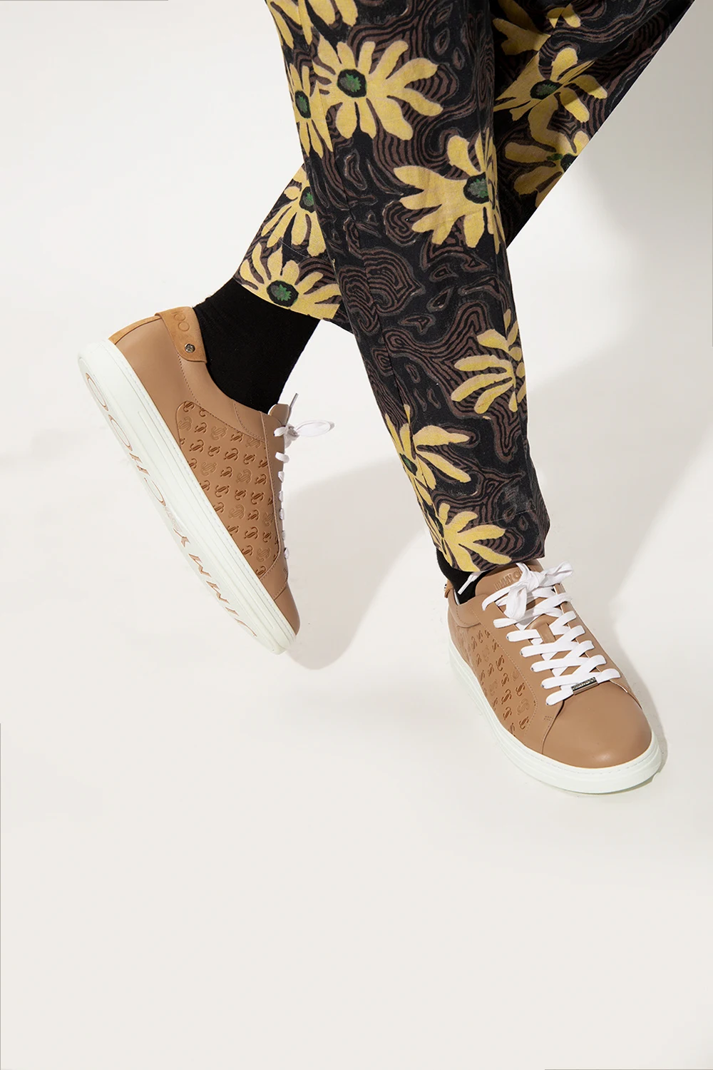 Beige ‘Rome’ sneakers from Jimmy Choo. Crafted from leather, this lace-up model features monogrammed canvas panelling, an embossed logo, logo applications, a suede heel counter and a white rubber sole.