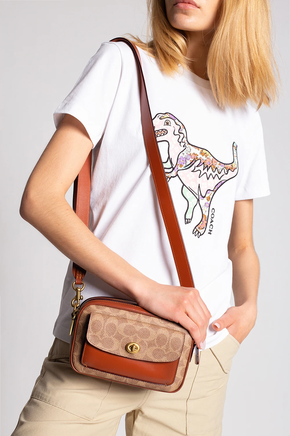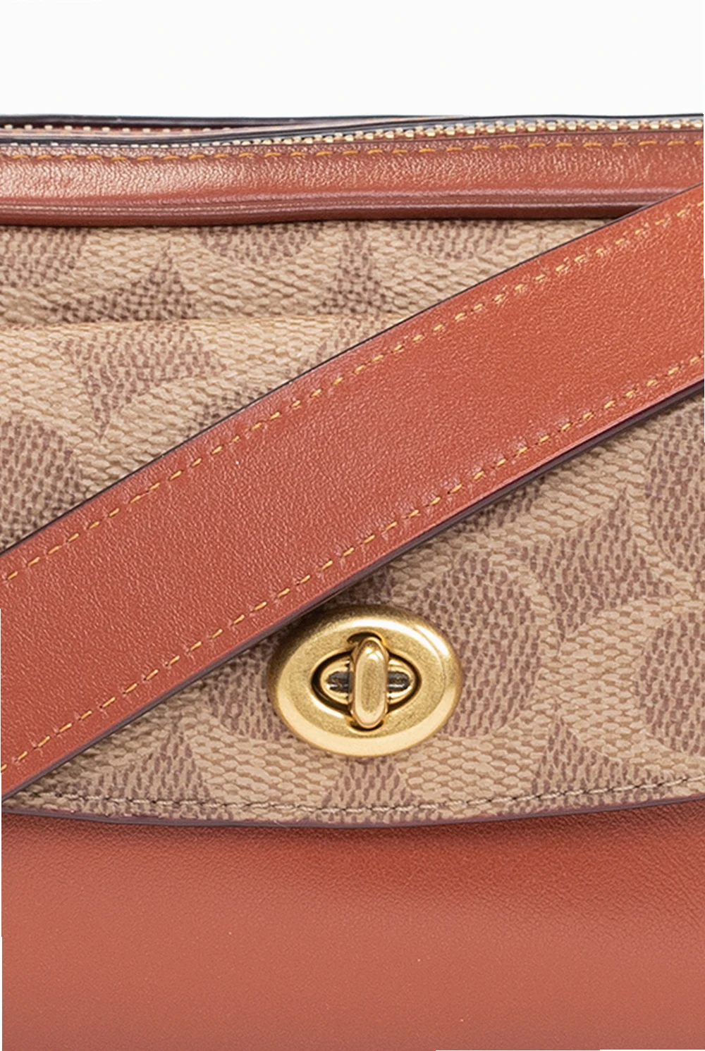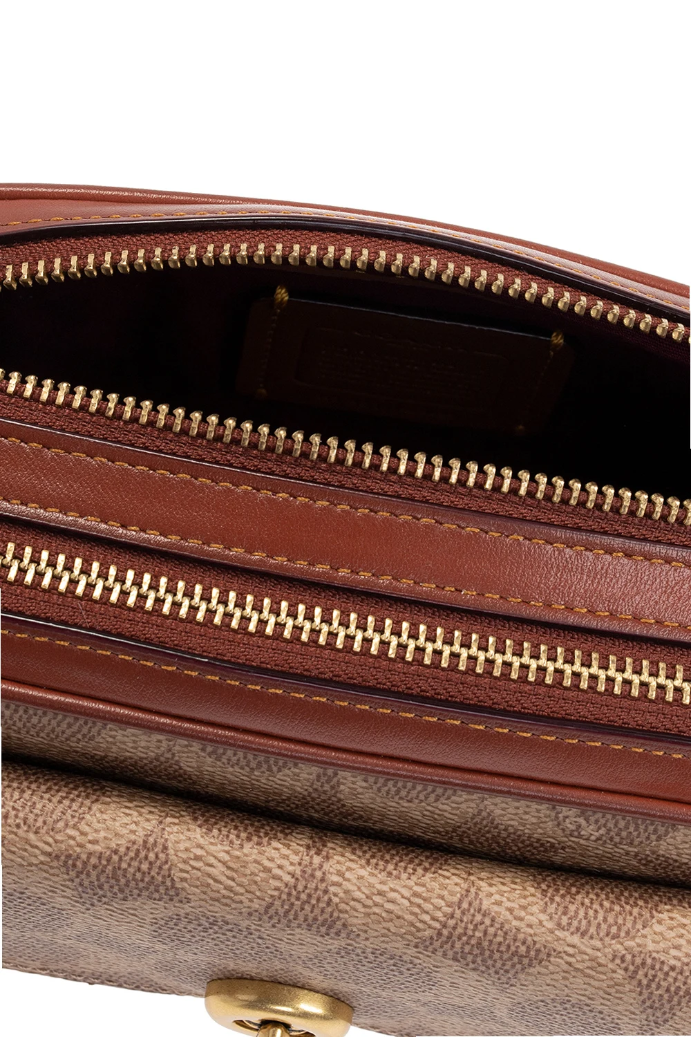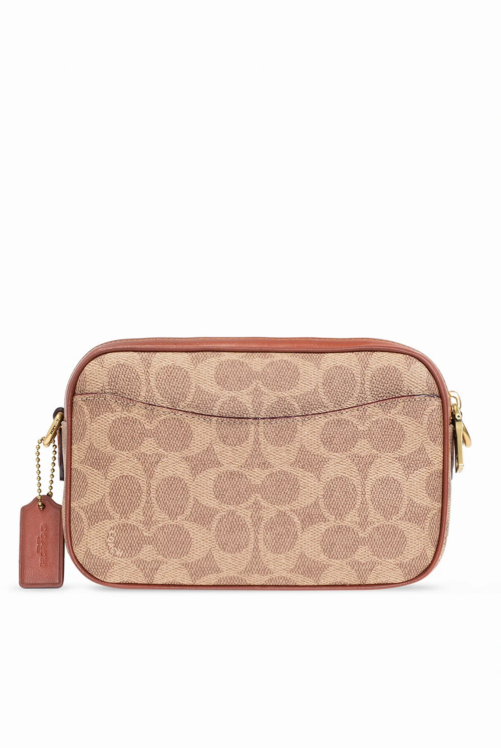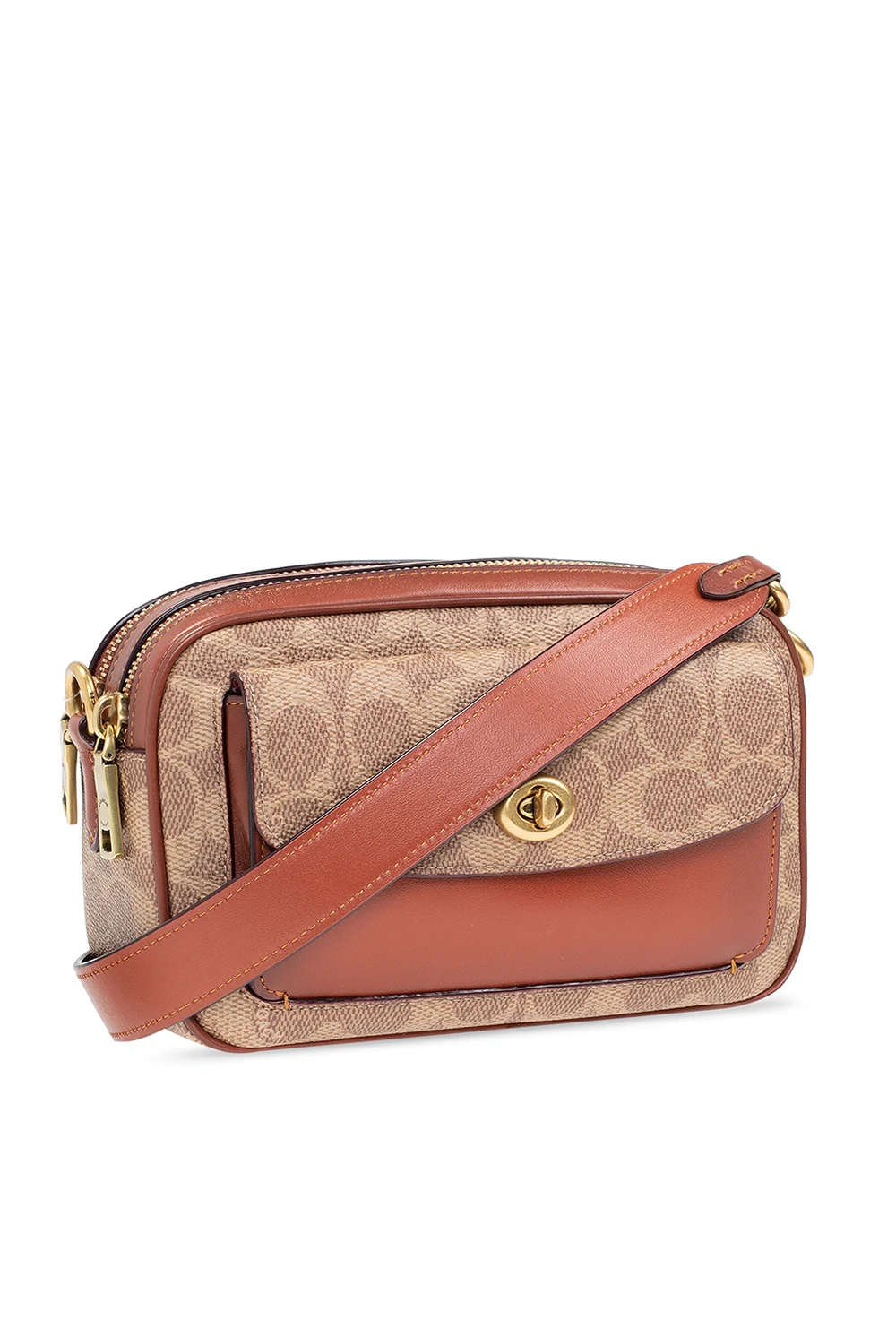 Brown and beige 'Willow Camera' shoulder bag from Coach. Crafted from the brand's signature jacquard and calf leather, this design secures with zips and features a flapped pocket with a decorative closure on the front, a slip pocket at the back, a detachable and adjustable shoulder strap, gold-tone metal hardware, an attached charm with an embossed logo and a maroon-clad interior with two separate compartments and one slip pocket.