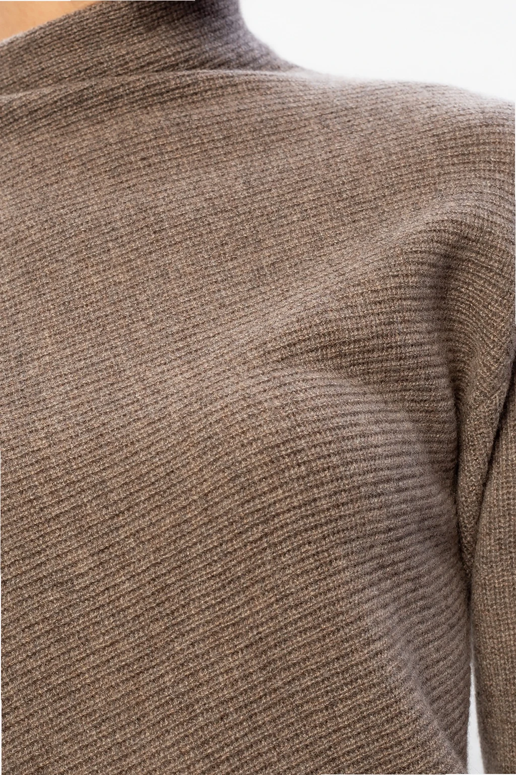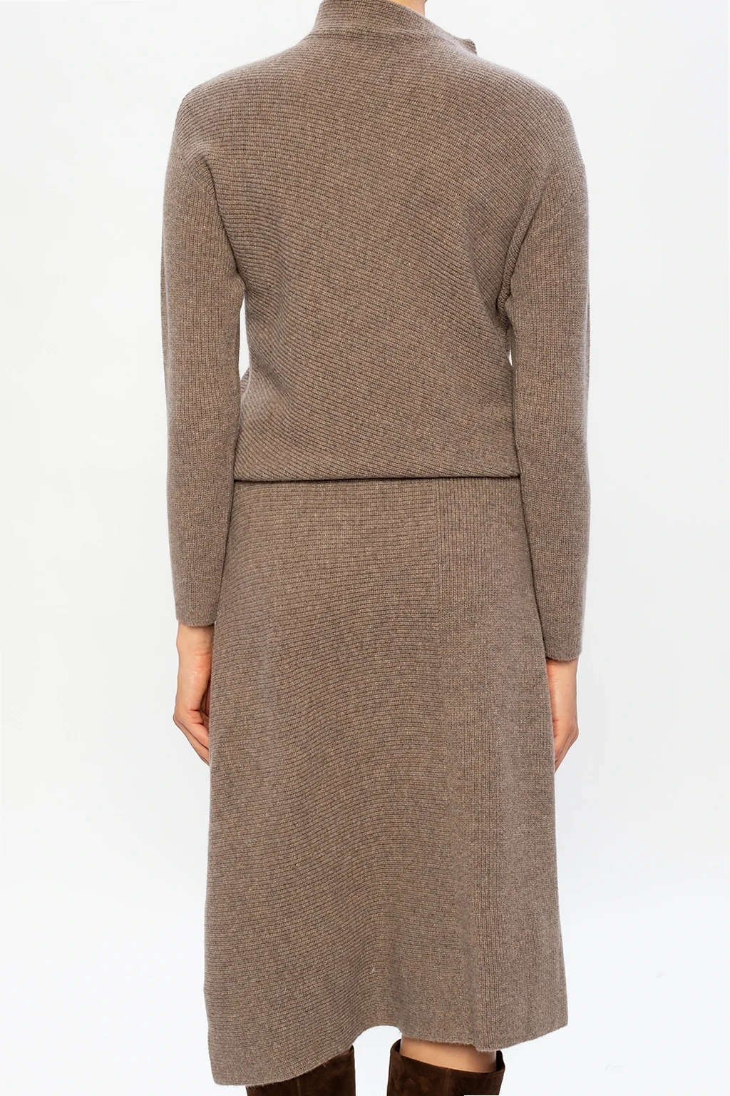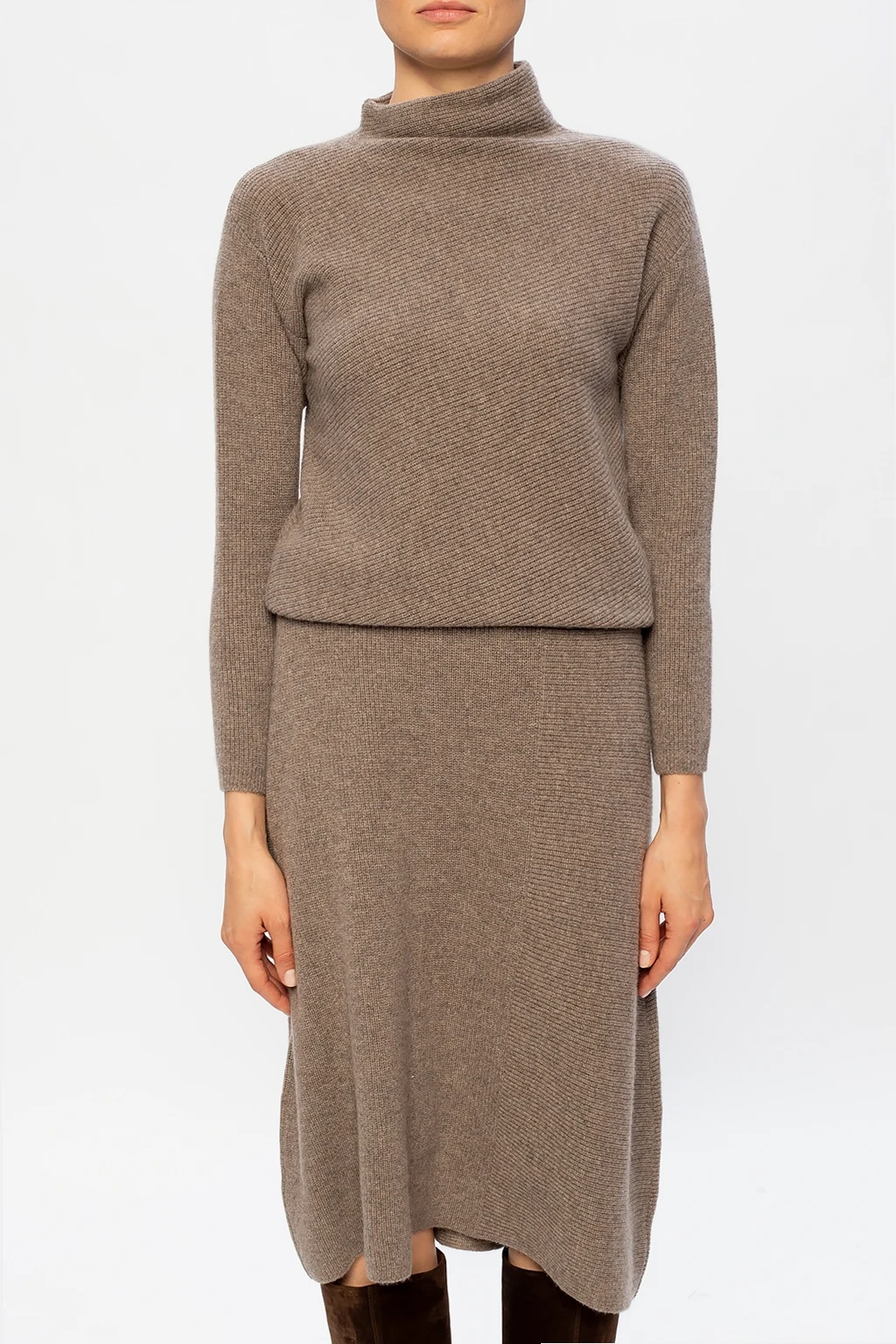 Brown dress from Agnona. Knitted from cashmere with a ribbed structure, this piece is complete with a snug roll neck and long sleeves.