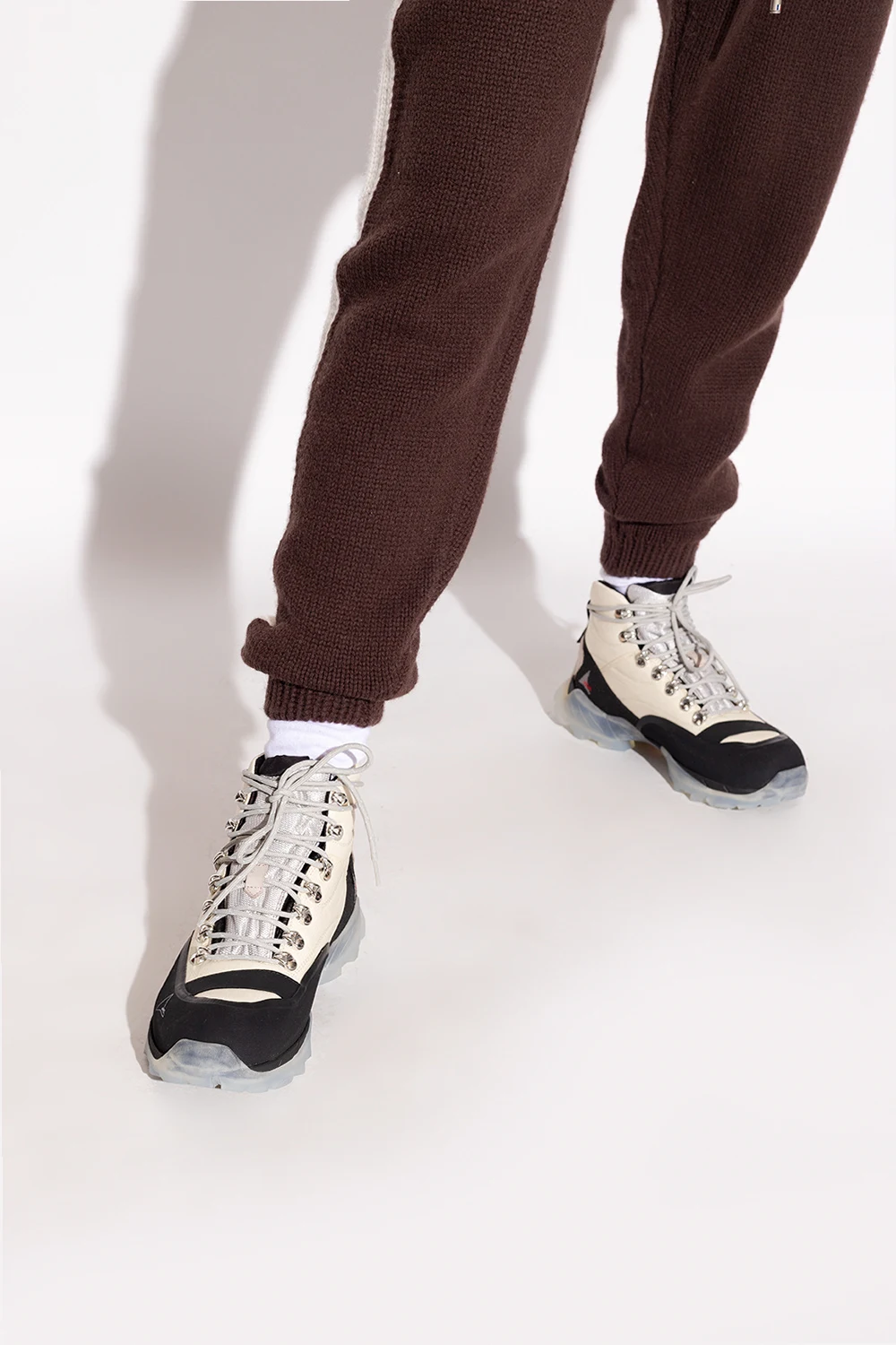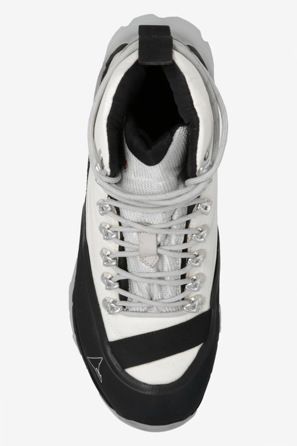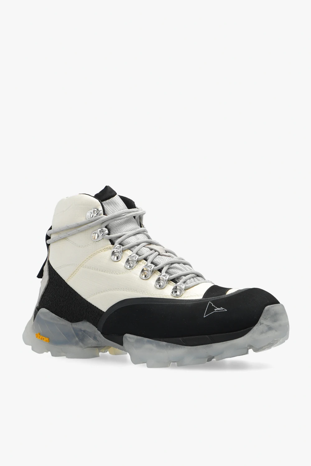 Cream, black and grey ‘Andreas’ trekking boots from Roa. Crafted from leather and fabric, this lace-up model showcases the brand's logo, rubber trimmings and a transparent Vibram®Megagrip tread pattern sole which ensures maximum grip on the most uneven surfaces.