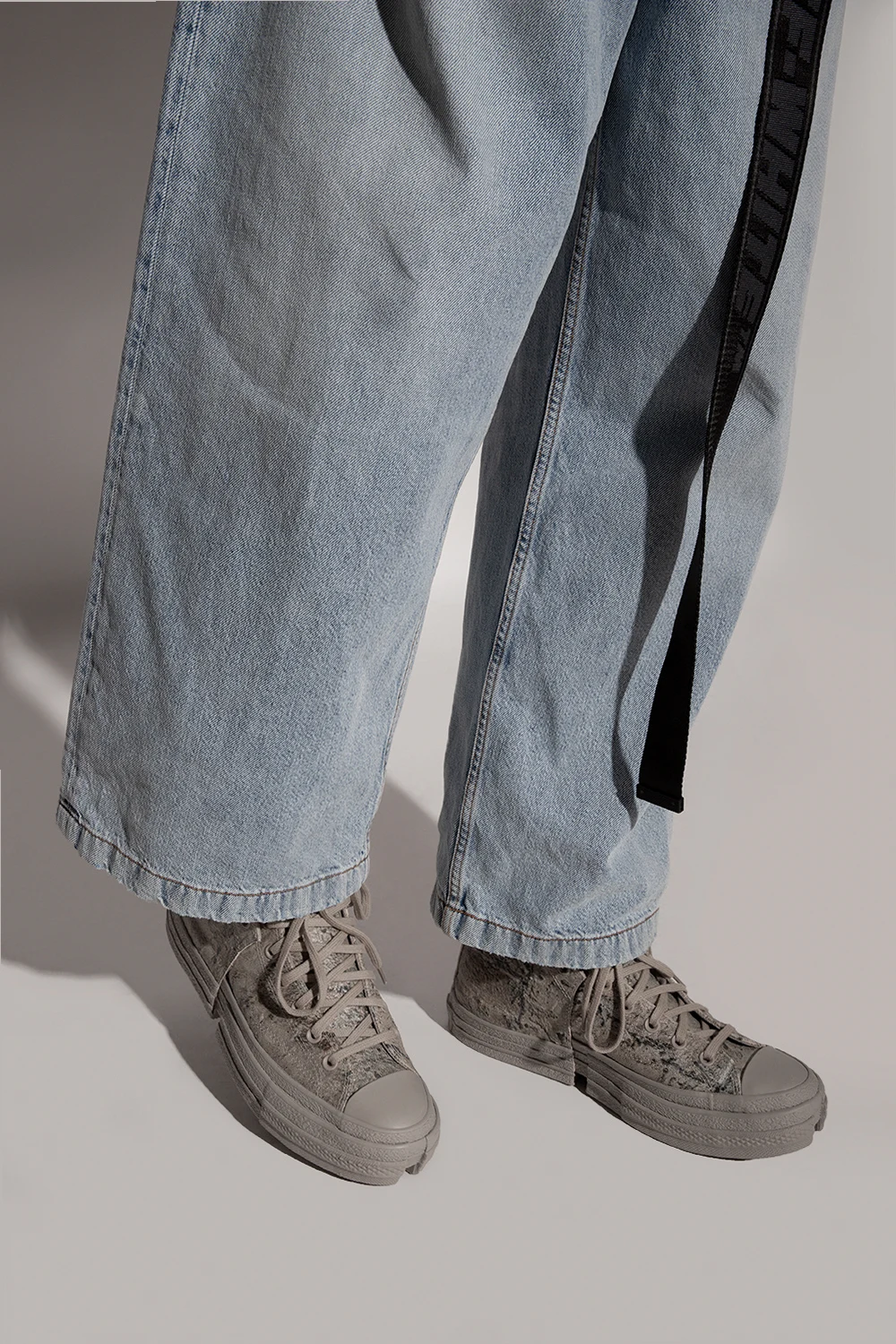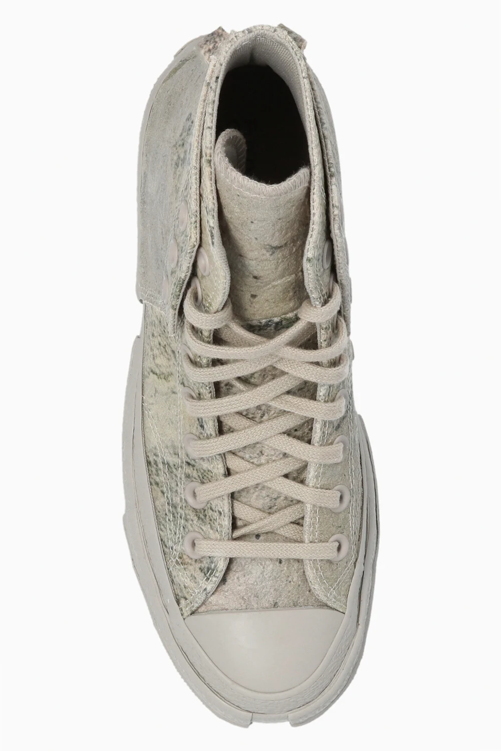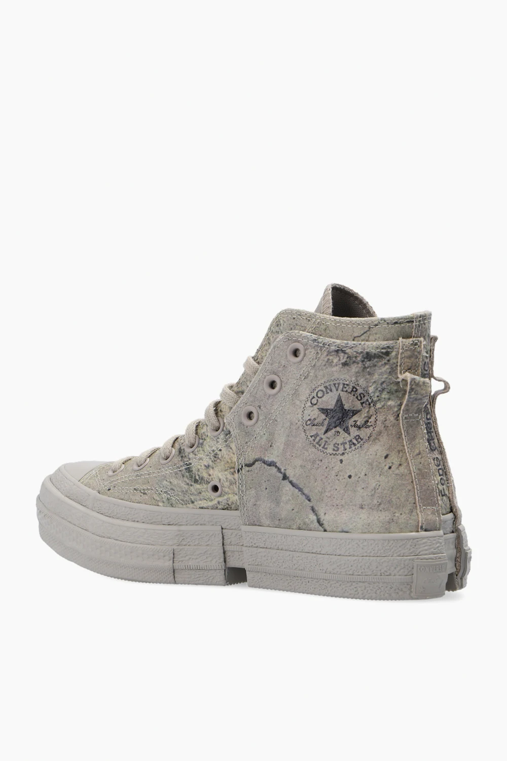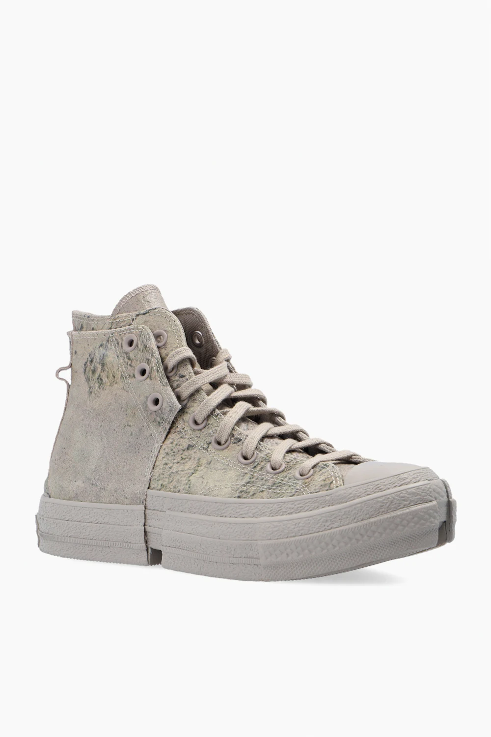 Grey and green ‘Chuck 70’ high-top sneakers from Converse x Feng Chen Wang. Crafted from textured leather, this lace-up pair features a black logo print and double sole with cutouts made of grey rubber.