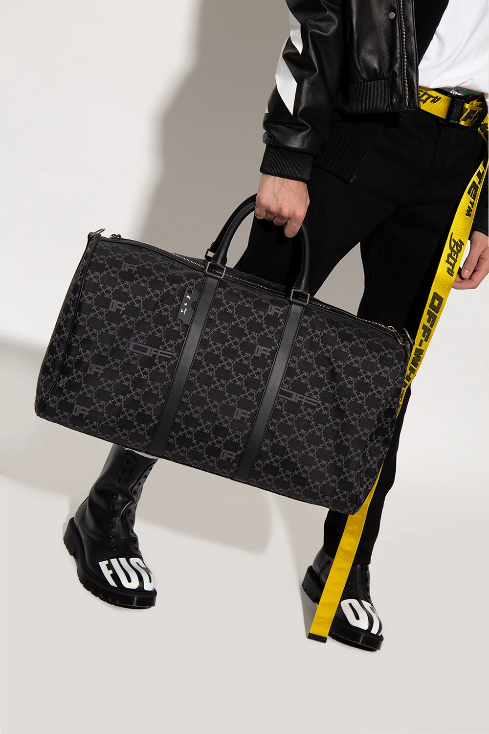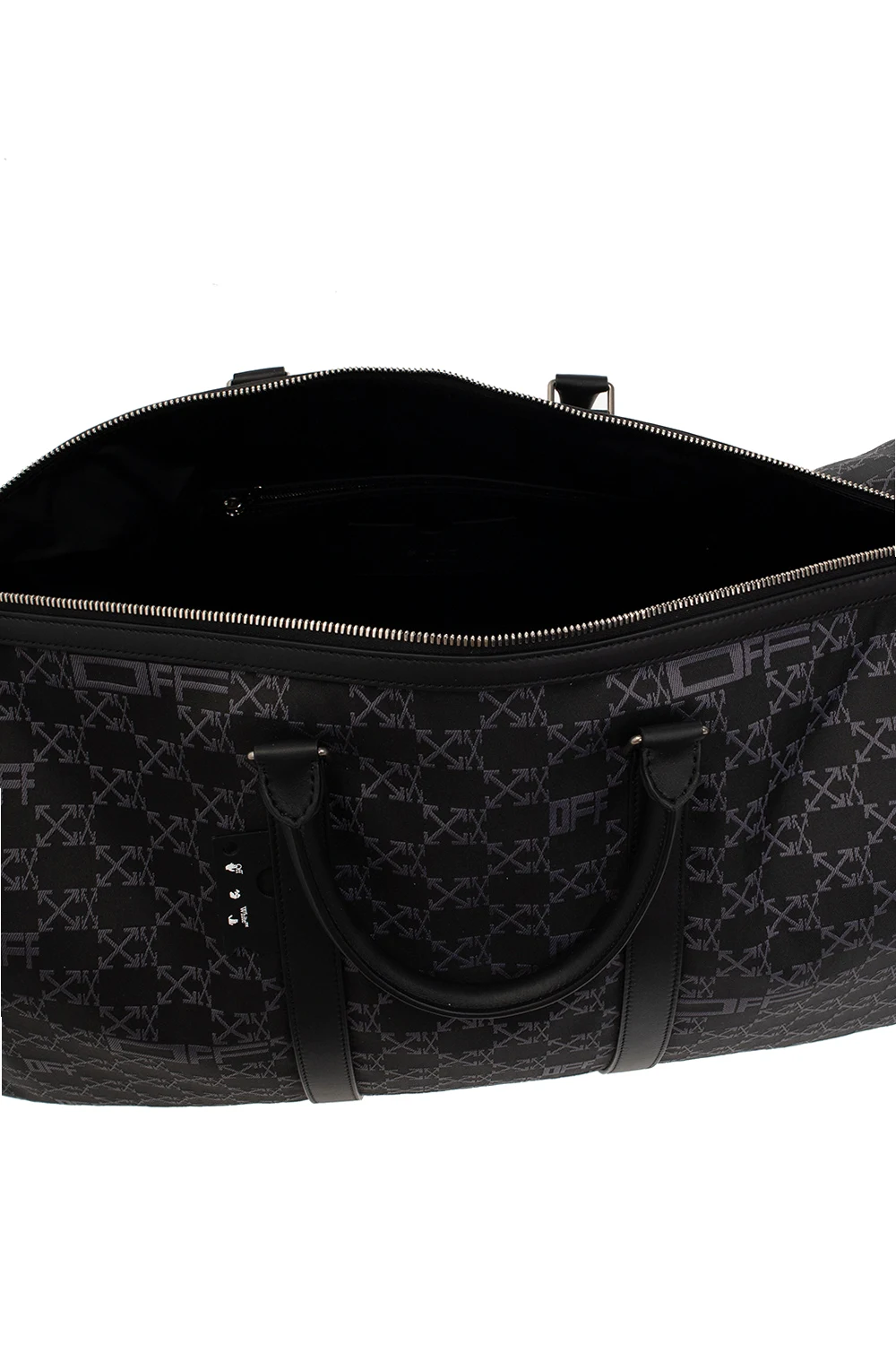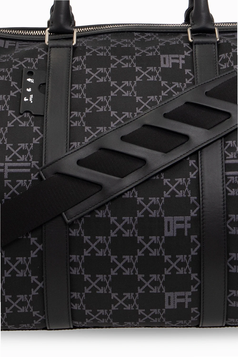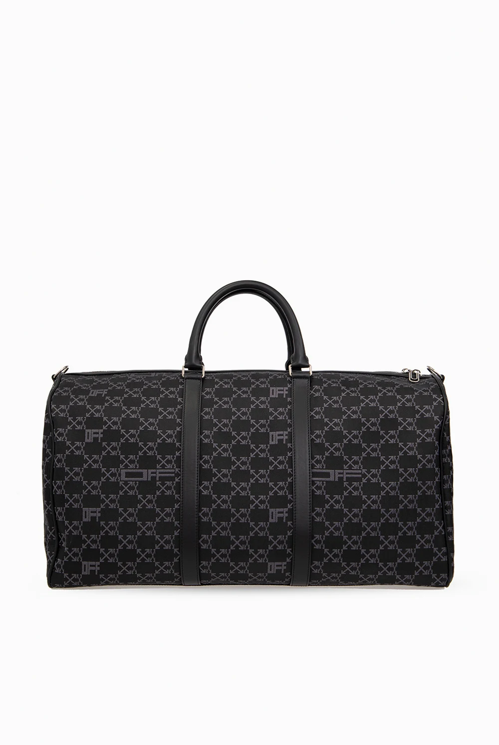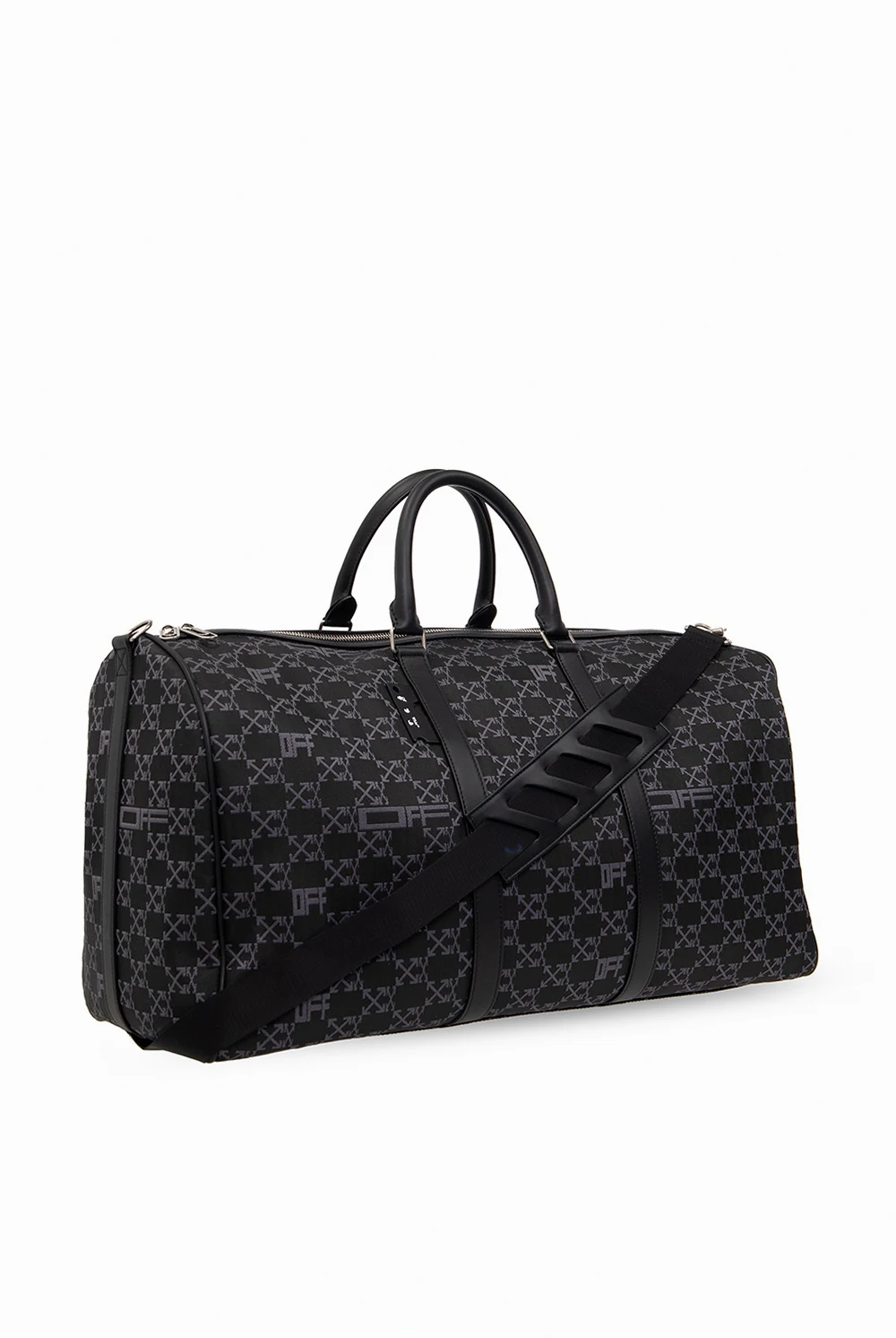 Black holdall bag from Off-White. Made of fabric embroidered with an Arrows monogram in dark grey, this model features a two-way zip with the label’s signature paper lip charms, two half-round handles, detachable and adjustable shoulder strap, silver-tone metal hardware and one internal compartment with one zip pocket and one card slot.