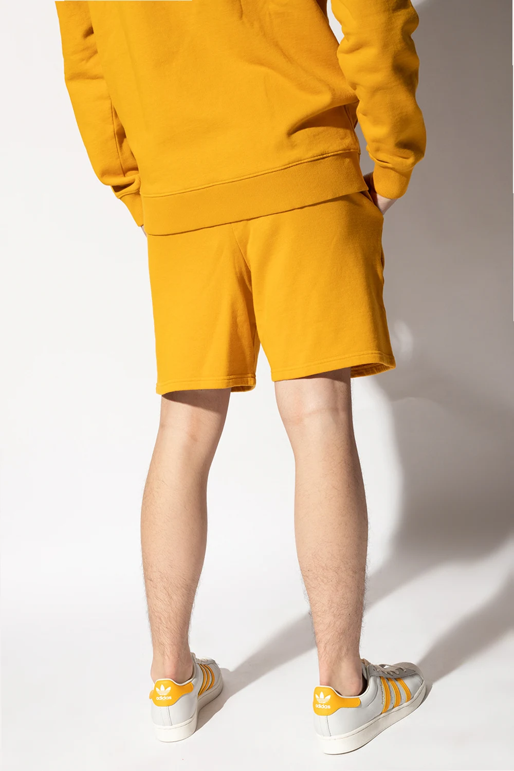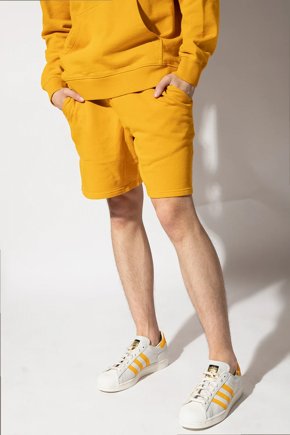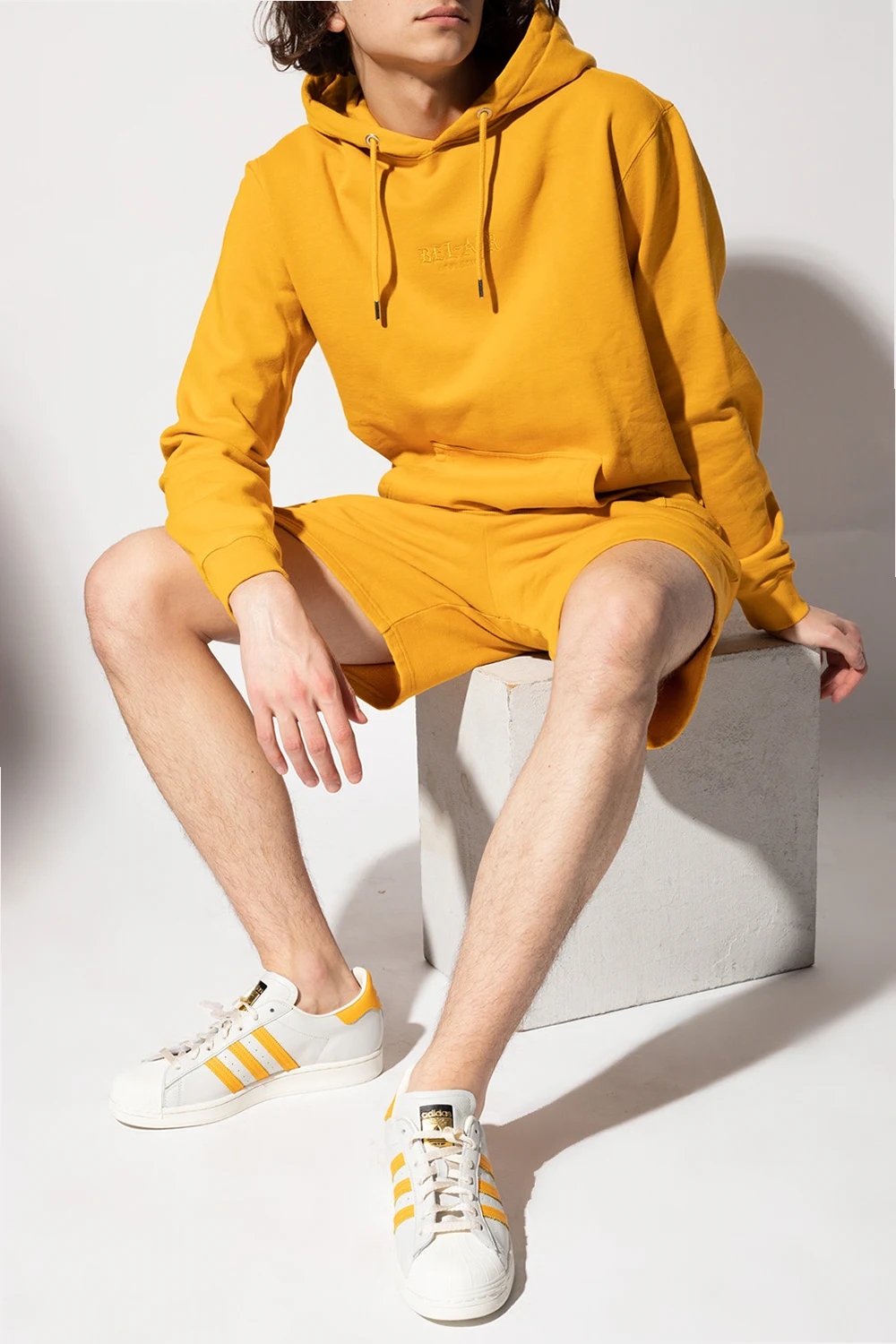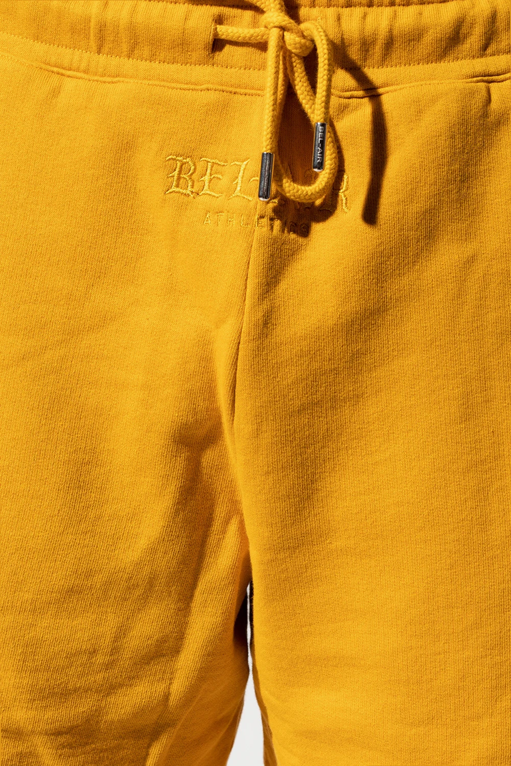 Yellow shorts from Bel-Air Athletics. Crafted from cotton, this design features a drawstring waist, logo embroidery, gathers and two front pockets.