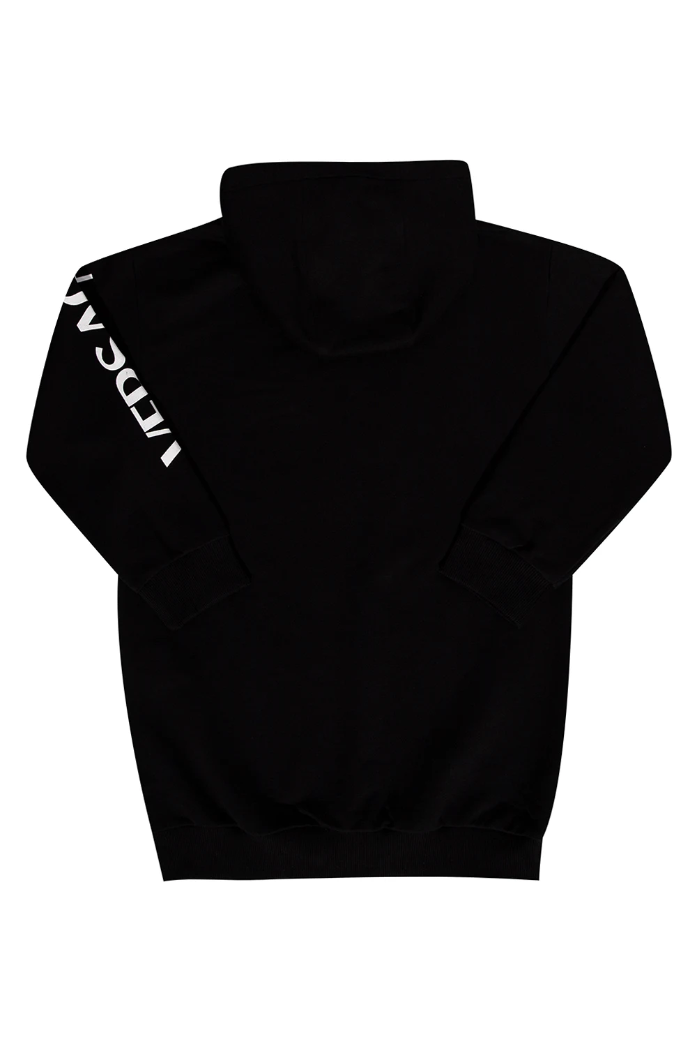 Black hooded dress from Versace Kid. Made of cotton, this design features a multicolored Smiley Medusa print, white logo on the sleeve and ribbed trims at the neck, hem and cuffs.