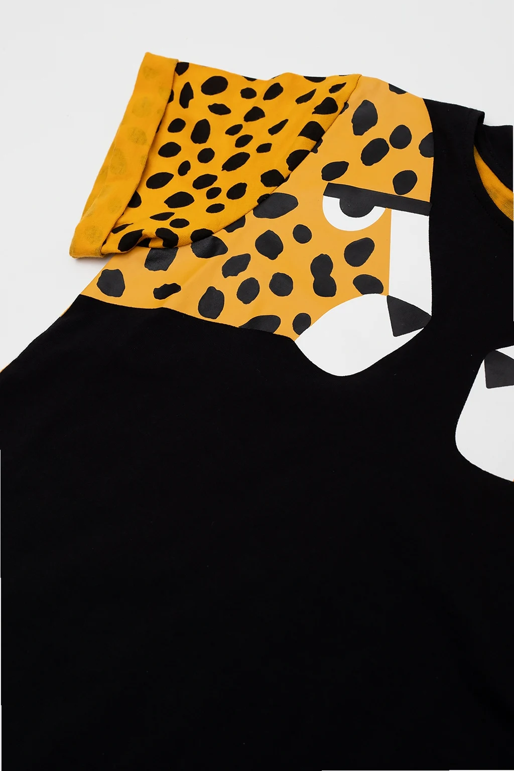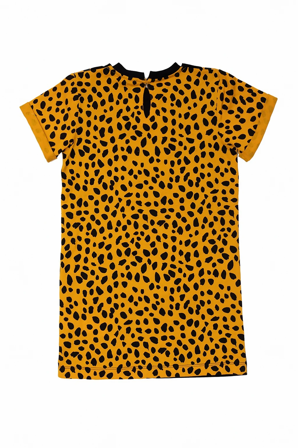 Black dress from Stella McCartney Kids. Illustrated with a yellow, black and white animal print, this cotton-crafted item features a back button fastening, an elasticated round neck and short, rolled-up sleeves.