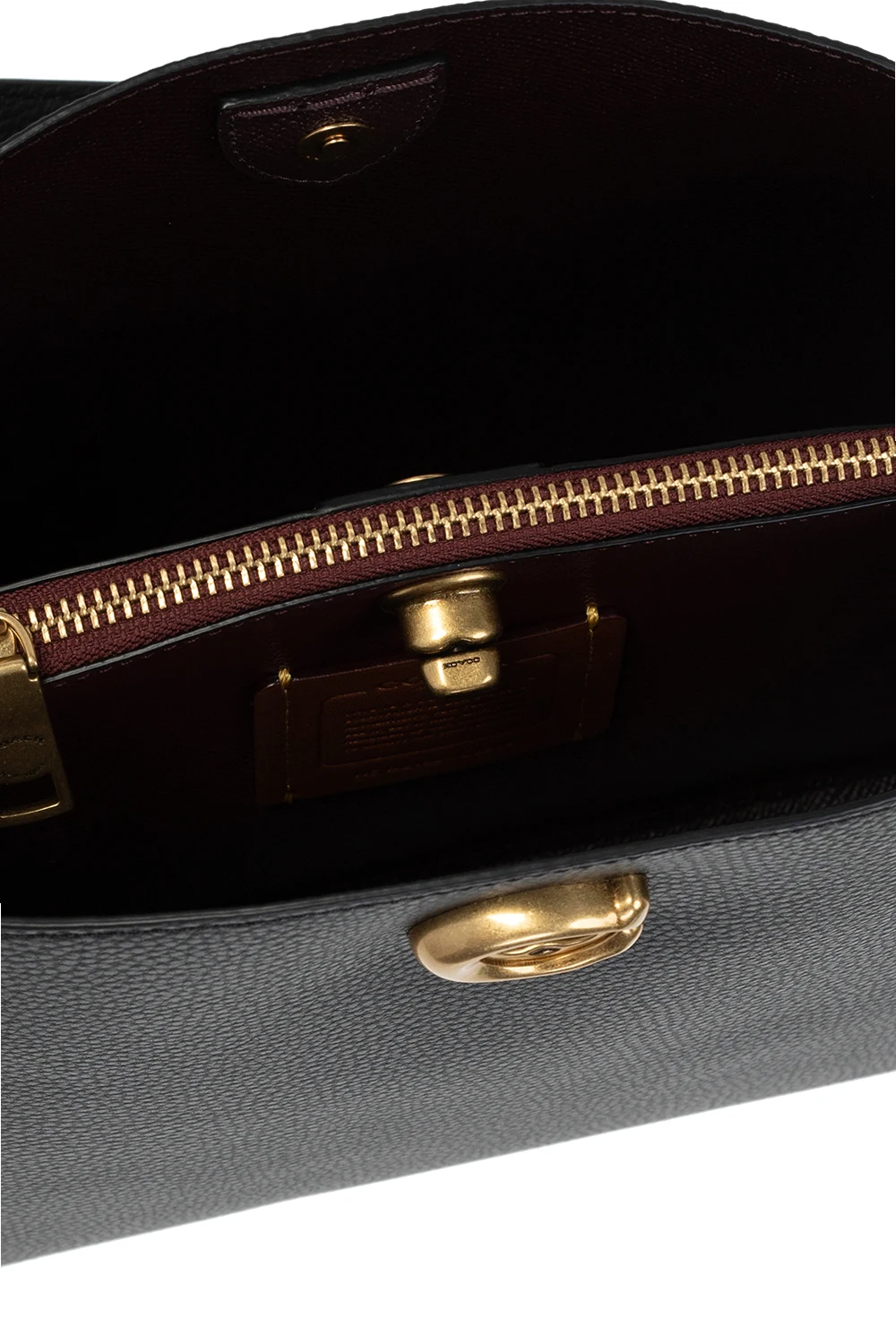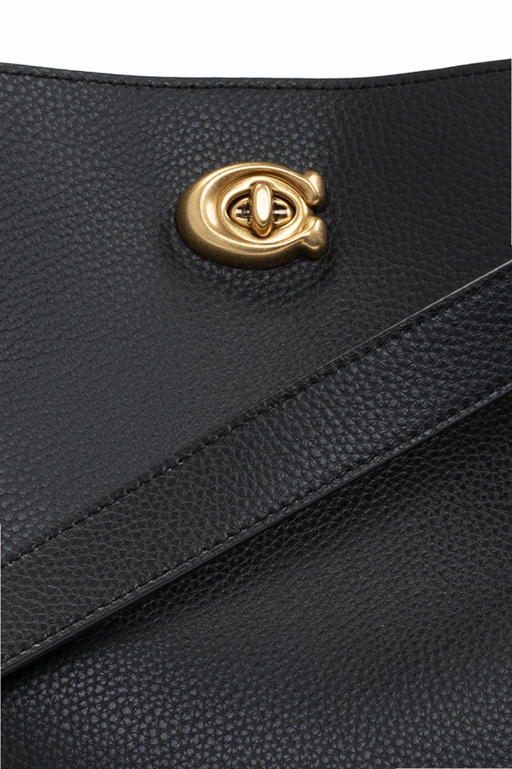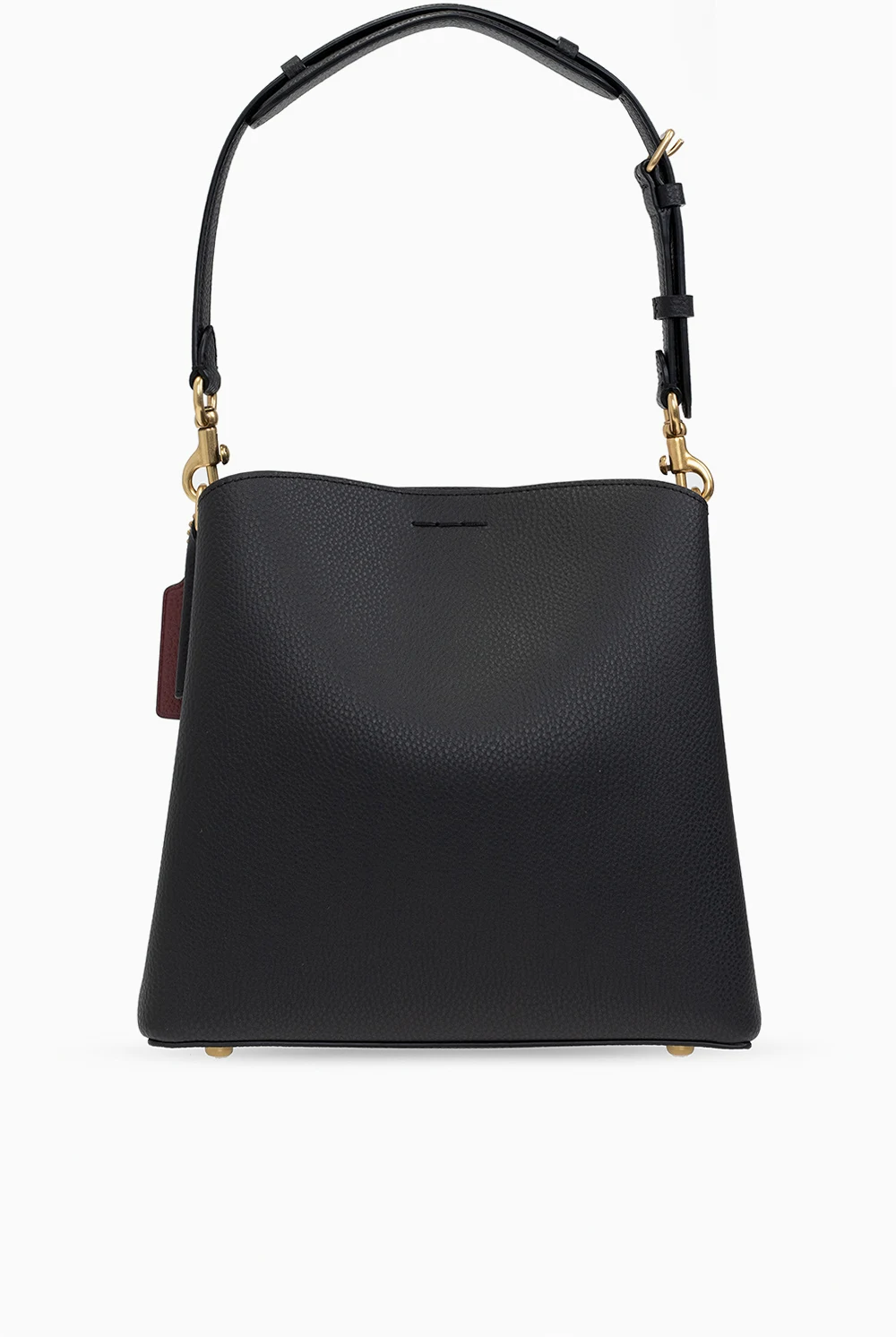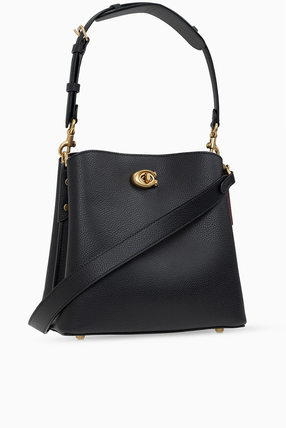 Black 'Willow' shoulder bag from Coach. Crafted from leather, this design secures with a magnetic fastener and showcases a logo appliqué, an adjustable shoulder strap, gold-tone metal hardware and an interior with two compartments and one zip pocket.