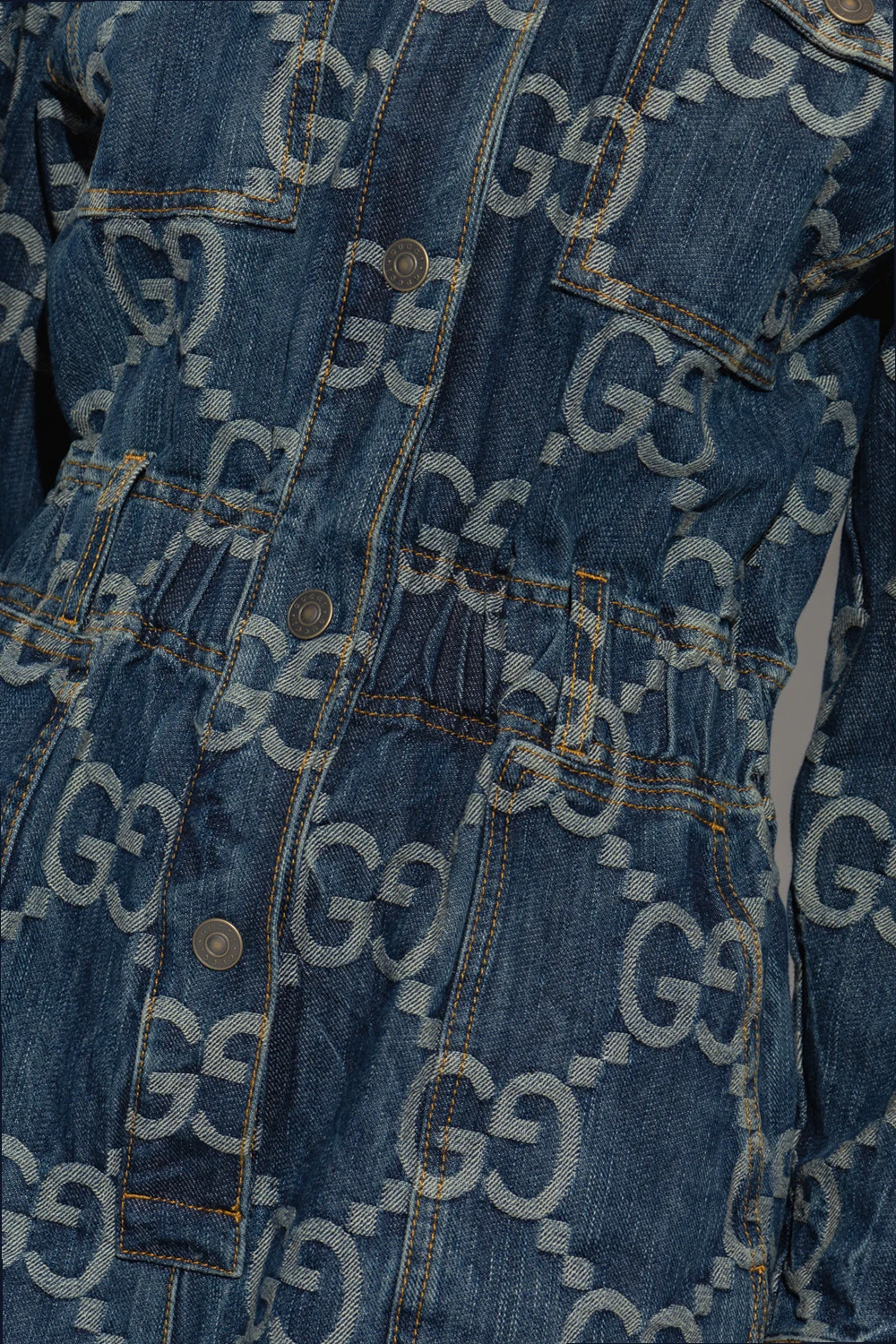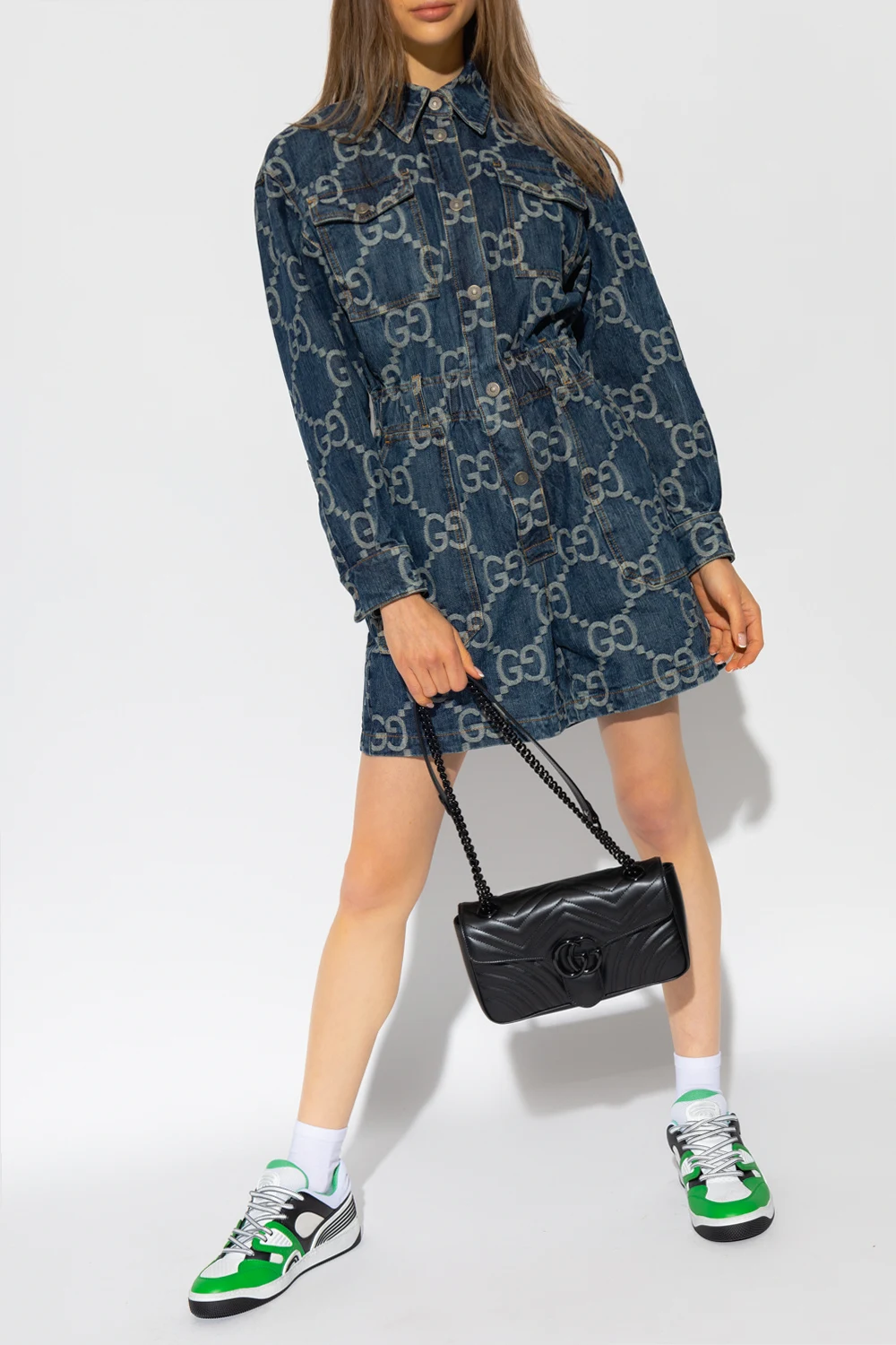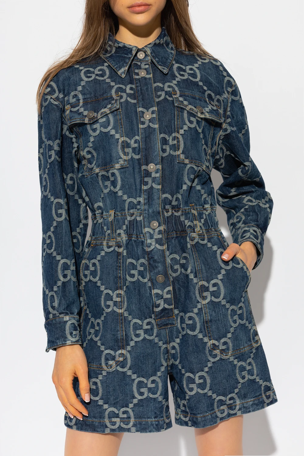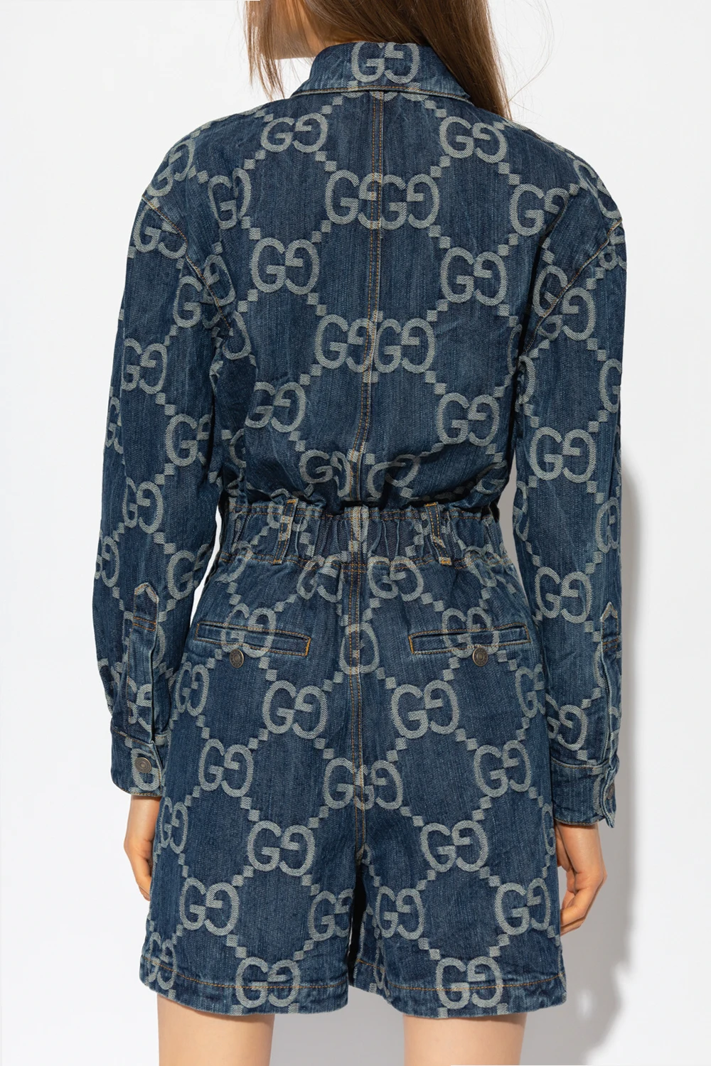 Dark blue denim jumpsuit from Gucci. Fastened with snaps, this garment features an elasticated waist, embroidered monogram pattern, two flap pockets, two slip pockets, long sleeves and short legs.