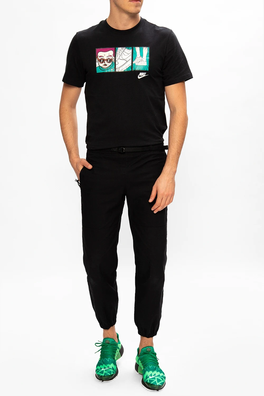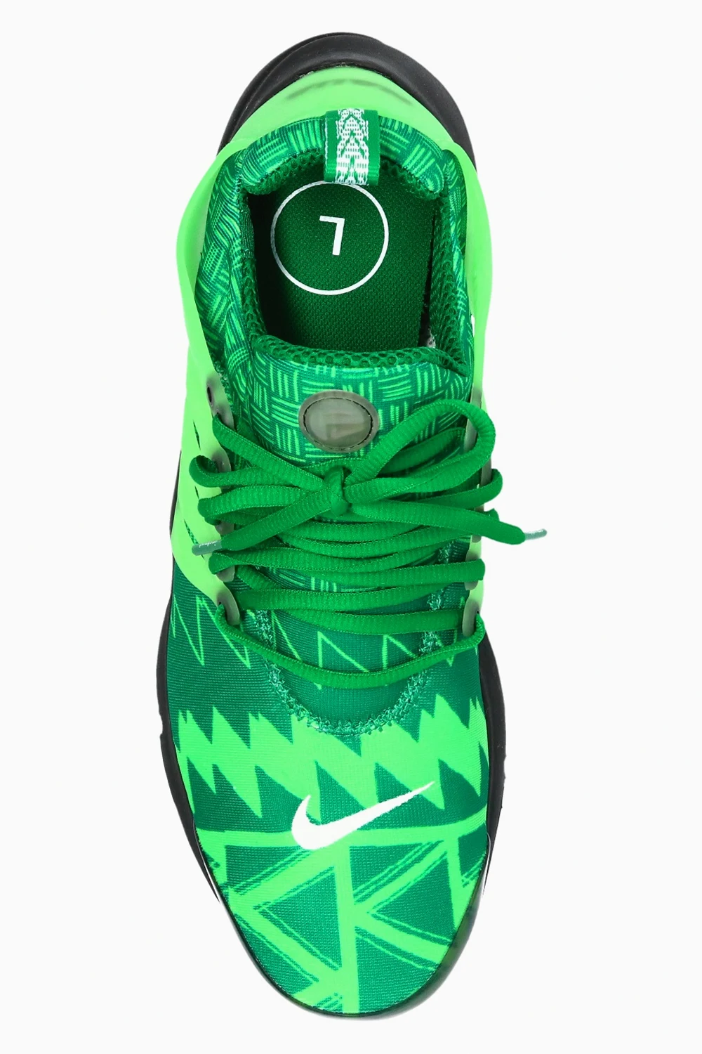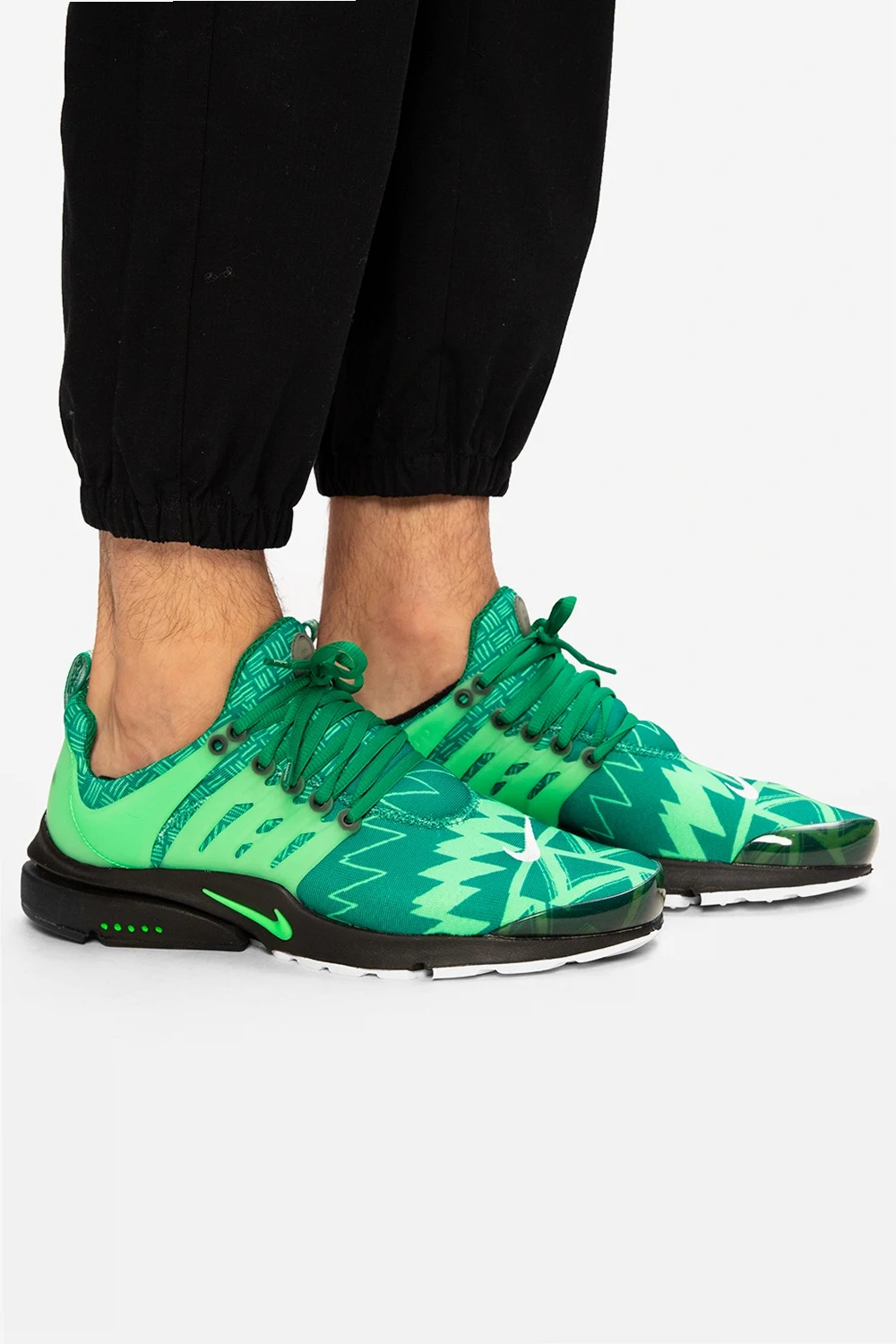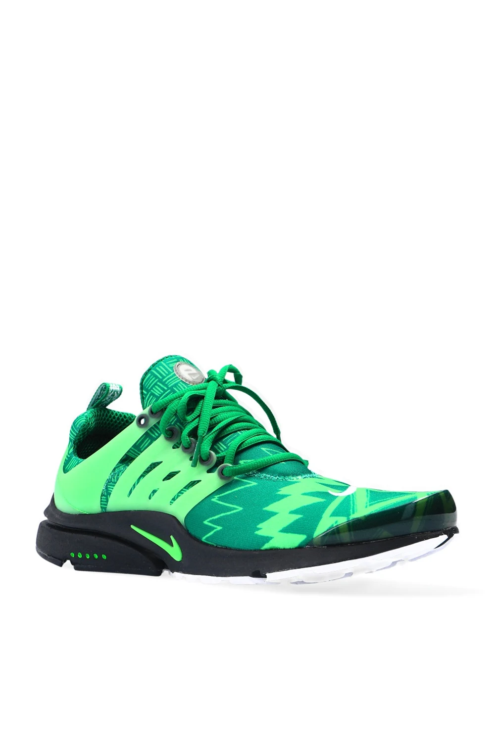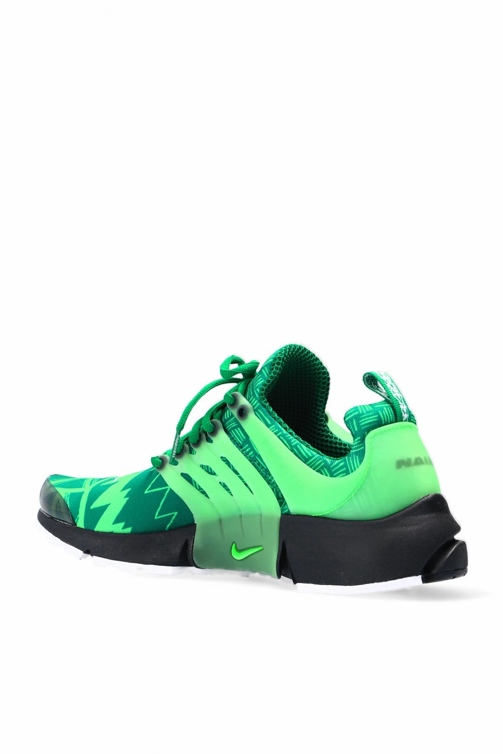 Green ‘Air Presto’ lace-up sneakers from Nike, ‘Alpha Project’ collection. Set on a white and black rubber sole with logo, this lace-up design features a stretch mesh upper, which adapts to the wearer's feet, pattern print and white Swoosh logo embroidery. The ‘Naija’ color scheme is inspired by Nigeria's soccer kits. Signalled by five dots on the outsole, the ‘Alpha Project’ collection includes models tested by world-class athletes like Andre Agassi or Cristiano Ronaldo to meet the toughest standards of professional sports.
