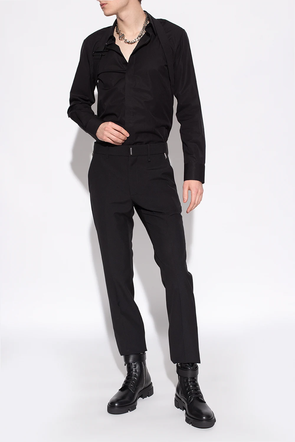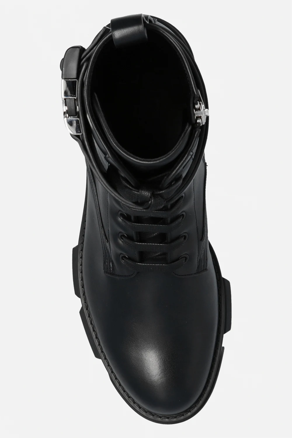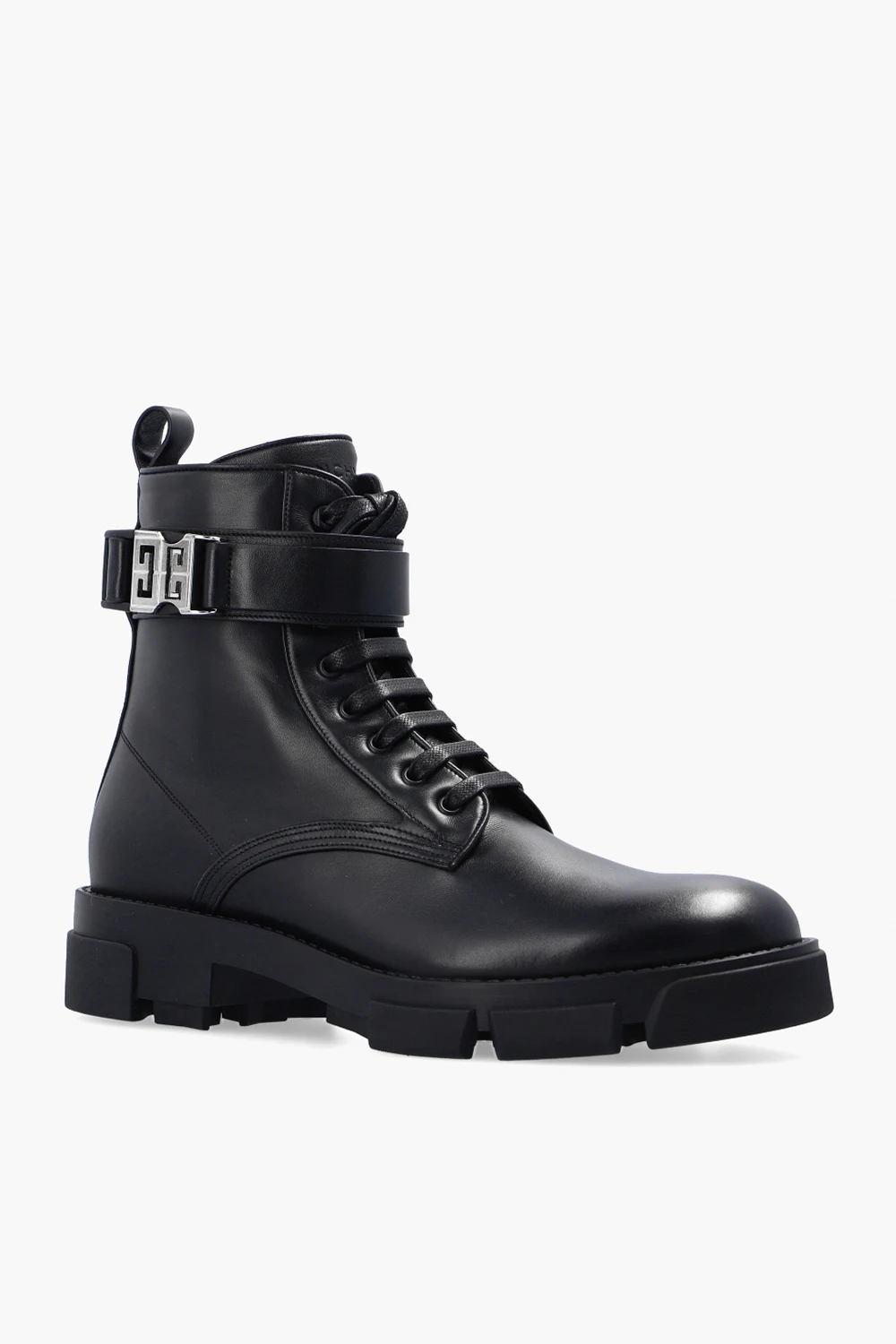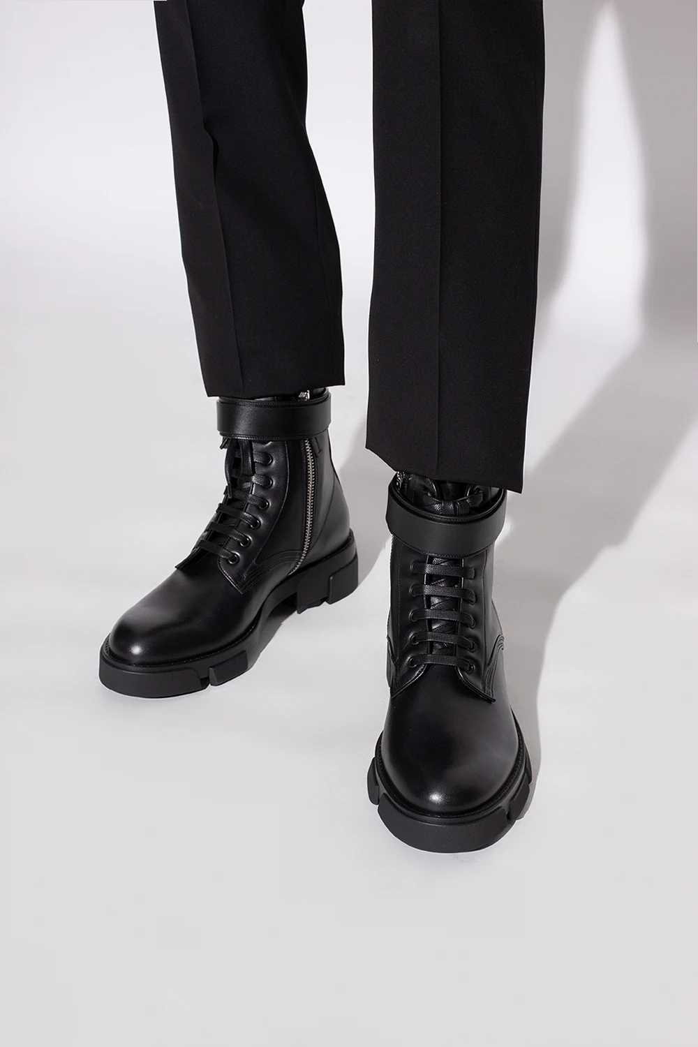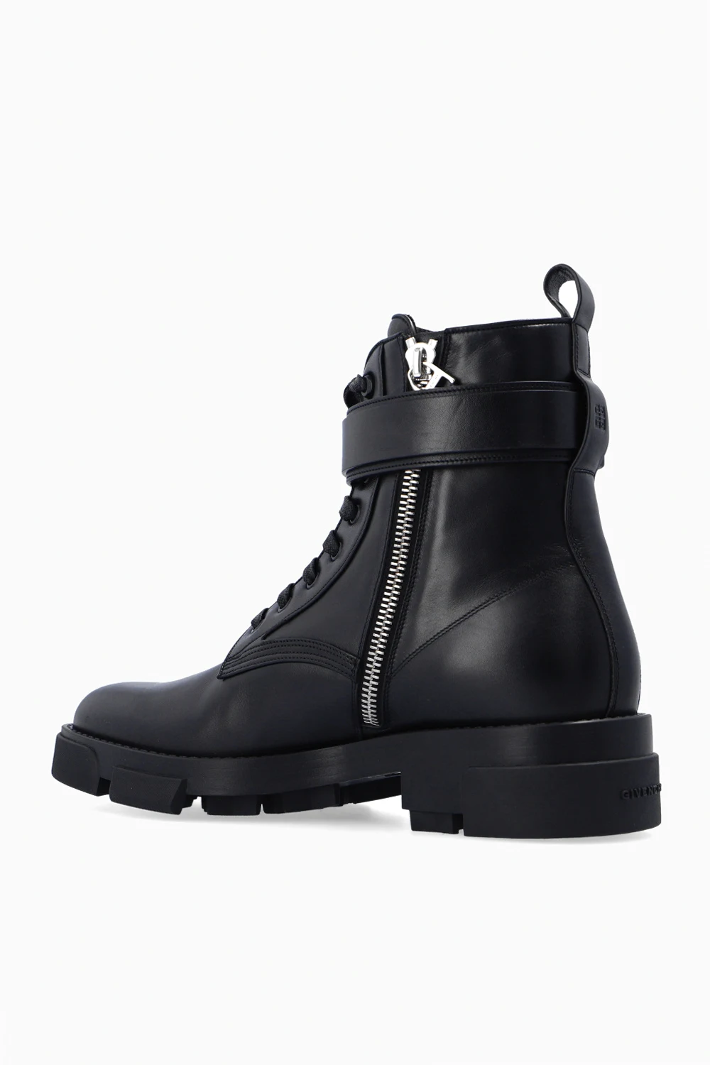 Black ankle boots from Givenchy. Crafted from calf leather, this lace-up model features a side zipper with a snap closure, an almond-shaped toe, an embossed logo and a black rubber sole.
