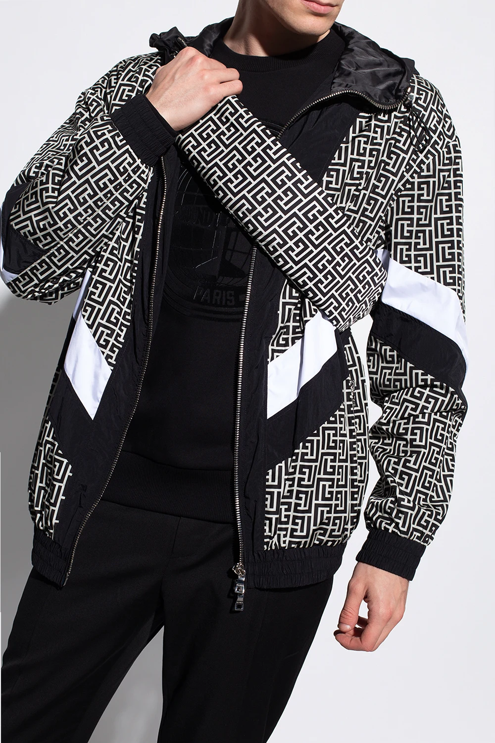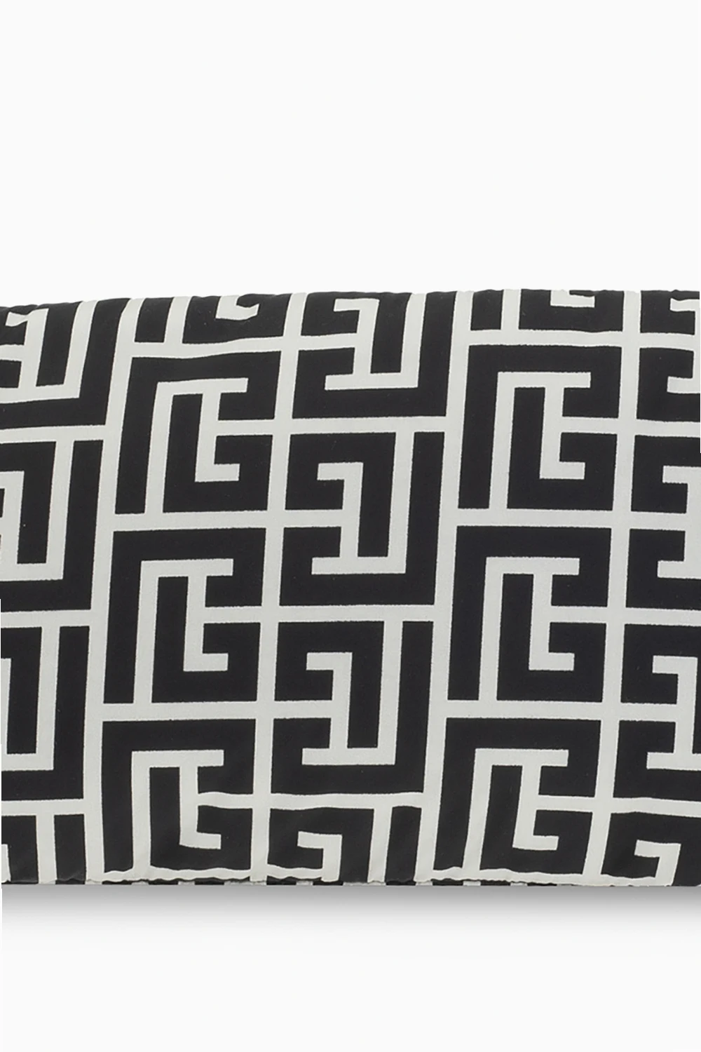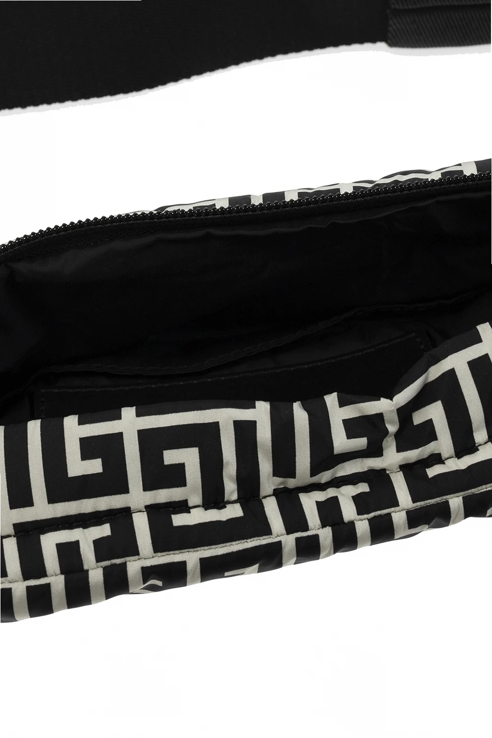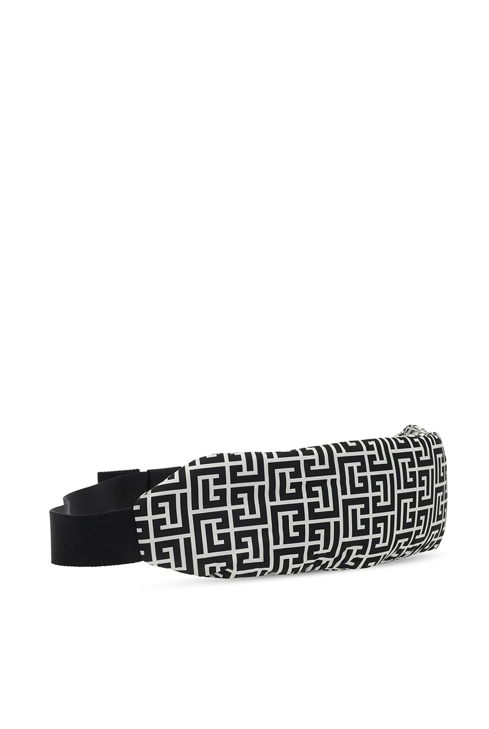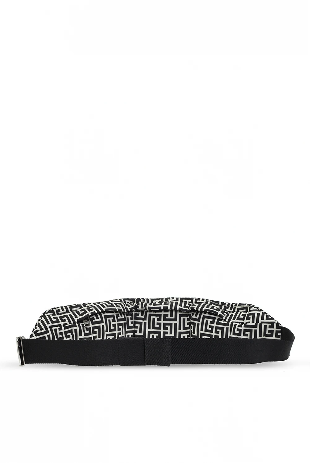 Black and cream belt bag from Balmain. Fastened with a zip, this garment features a printed logo pattern, adjustable strap in silver-tone and one internal compartment.