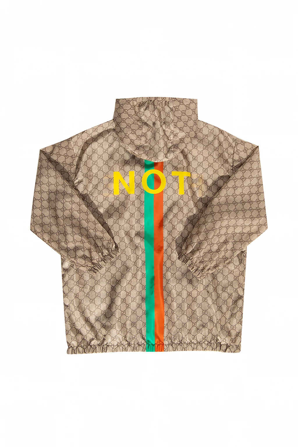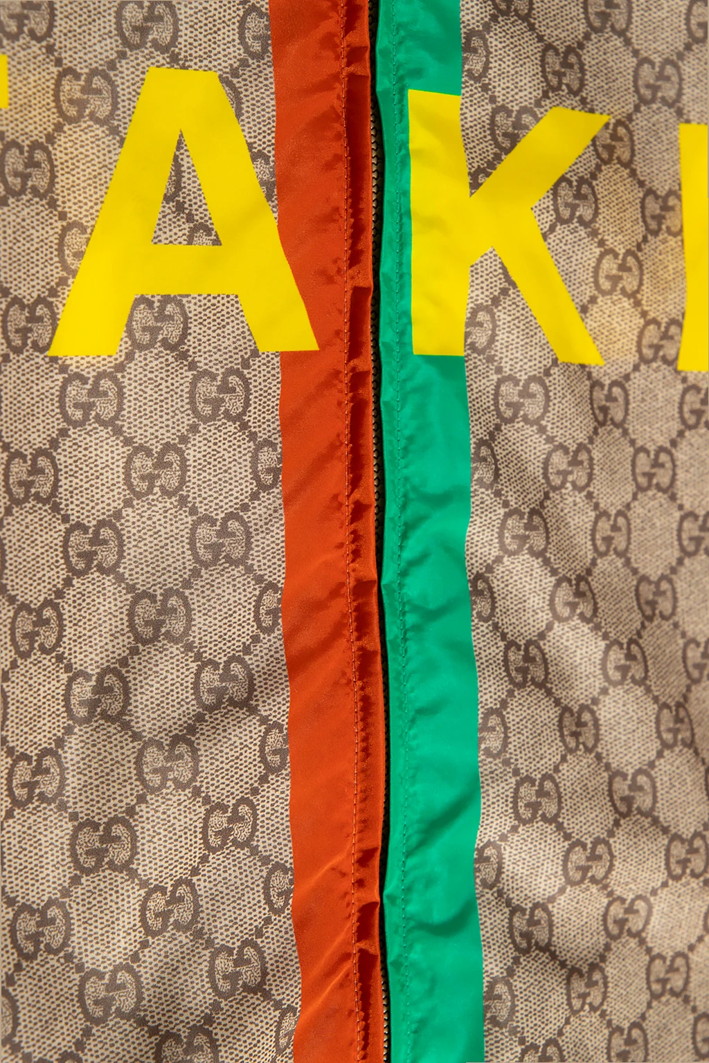 Beige hooded jacket from Gucci. Fastened with a zip, this design is complete with a ribbed hem, printed logo pattern in brown, two slip pockets and a print in yellow, green and red.