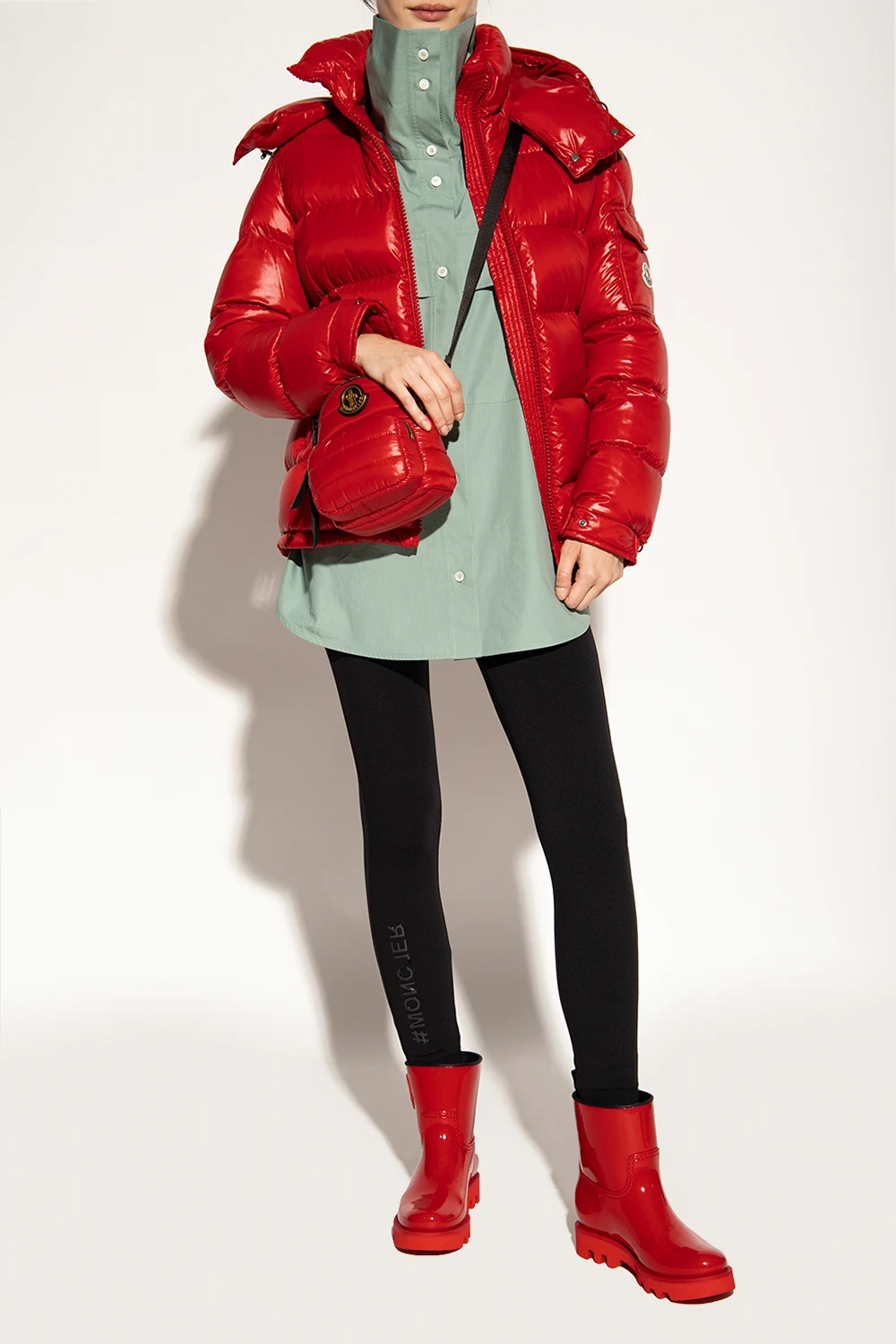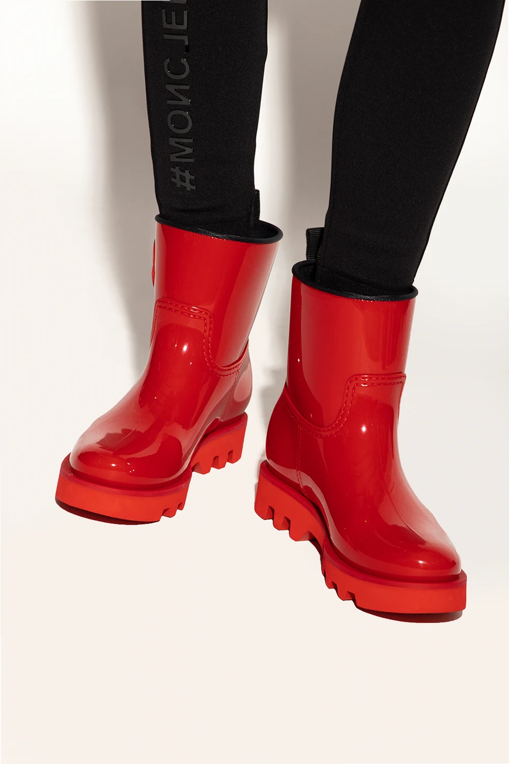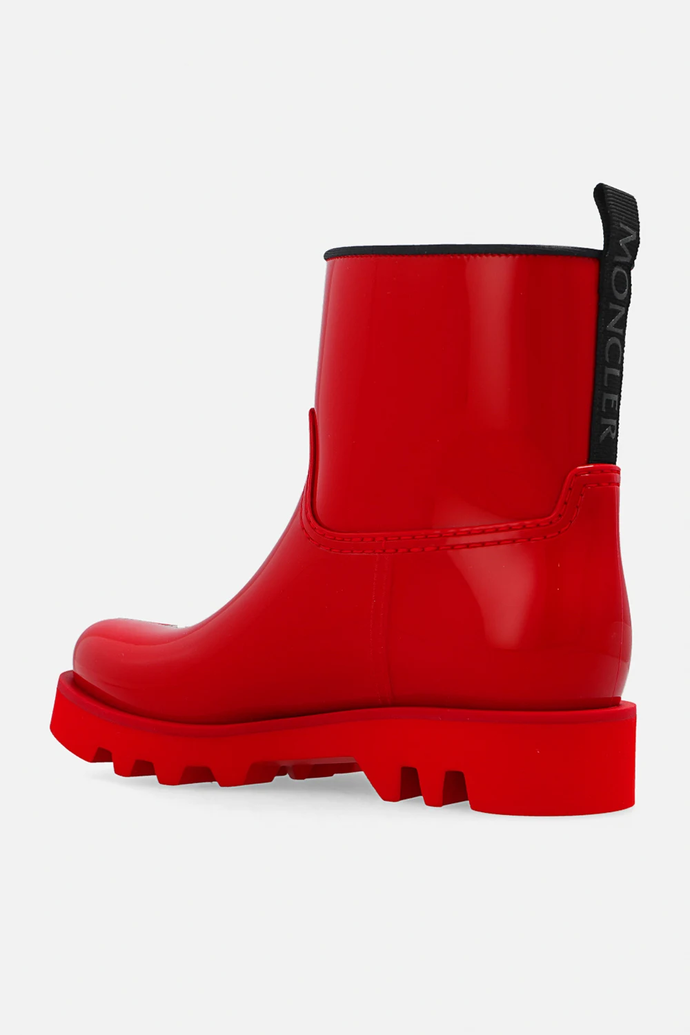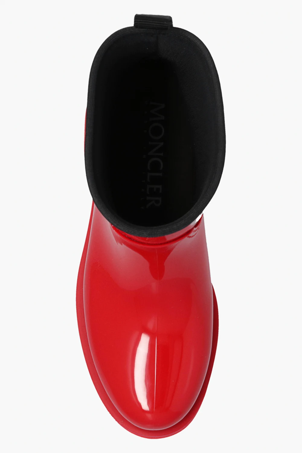 Red ‘Ginette’ rain boots from Moncler. Made of glossy rubber, this slip-on pair features a logo patch and black grosgrain pull strap at the back.