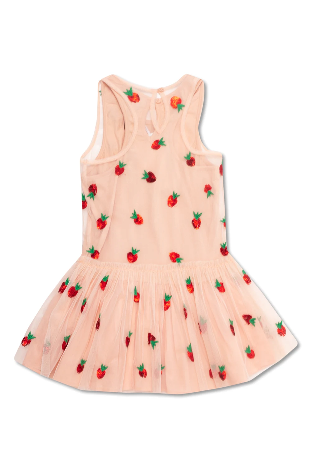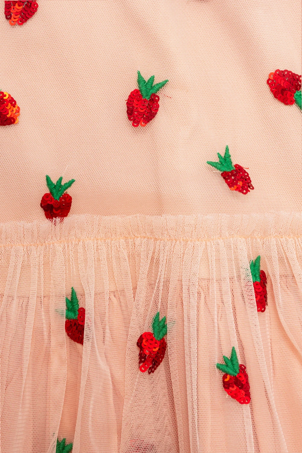 Pink sleeveless tulle dress from Stella McCartney Kids. Crafted from recycled material, this style features a relaxed-fitting silhouette with a dropped waist, a back button closure, ruffle detailing at the hem and sequinned fruit appliqués in red and green.