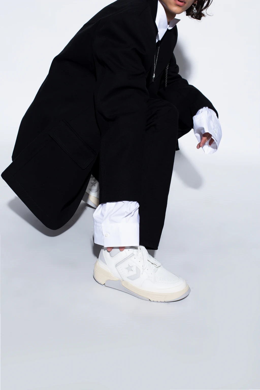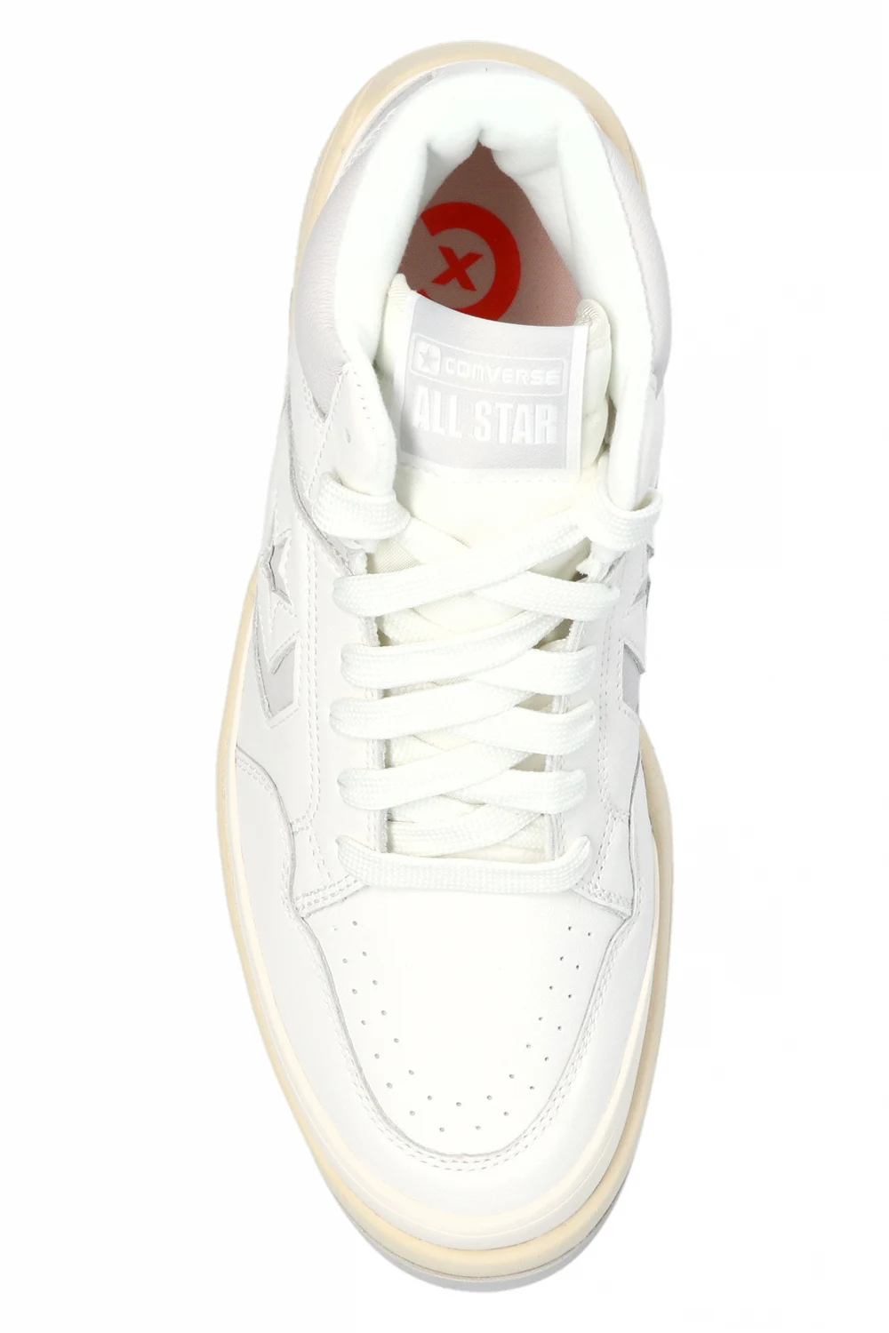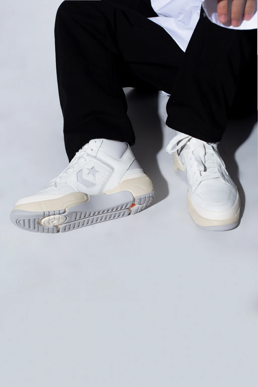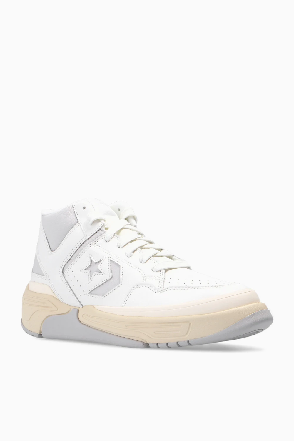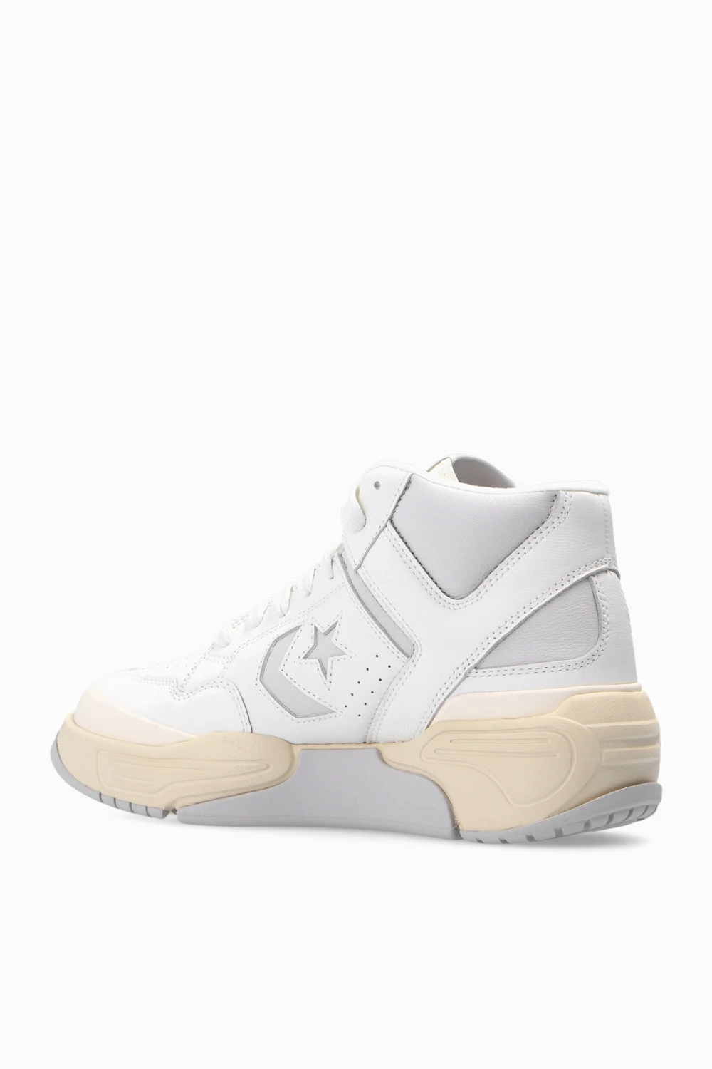 White and light grey ‘Weapon CX Mid’ high-top sneakers from Converse. Crafted from leather, this lace-up pair features a tongue patch with a logo, perforations and rubber sole in light grey and cream.