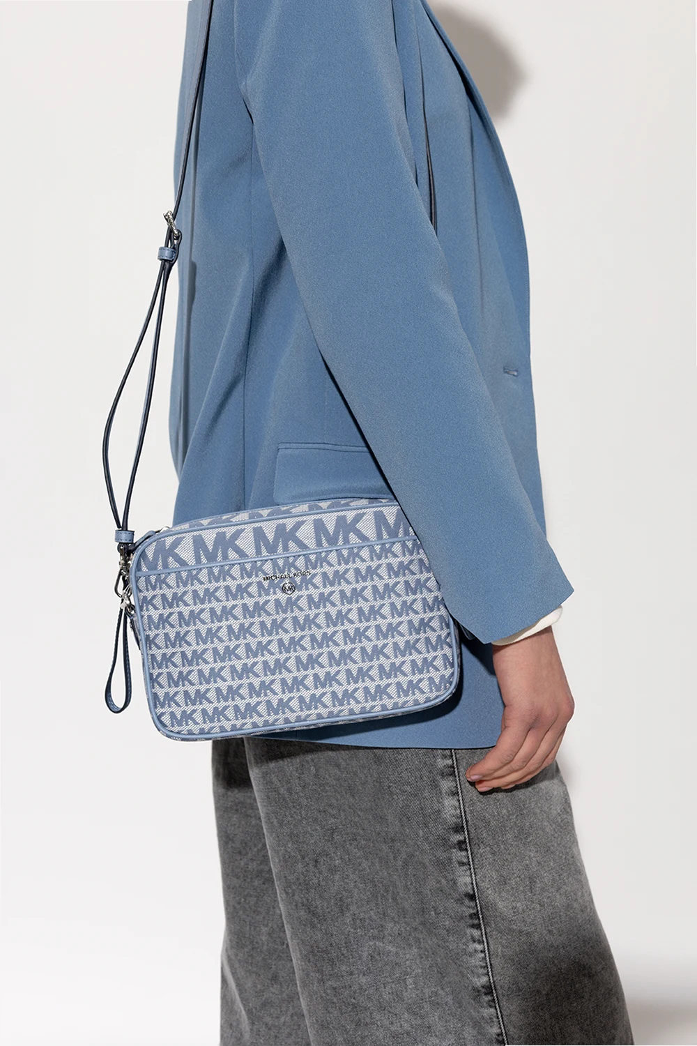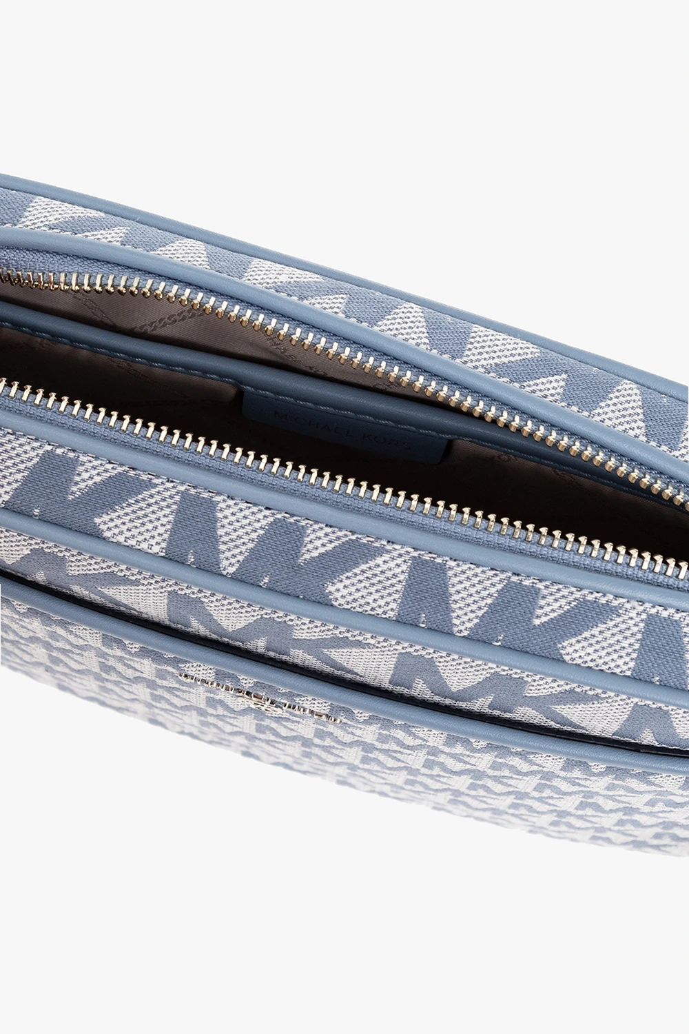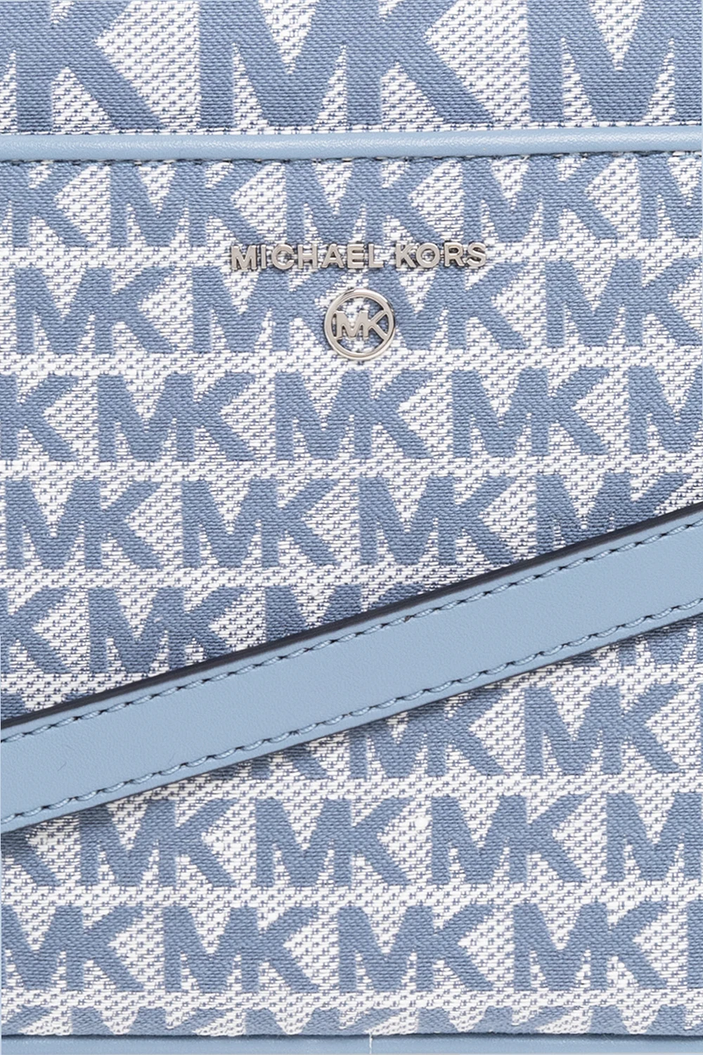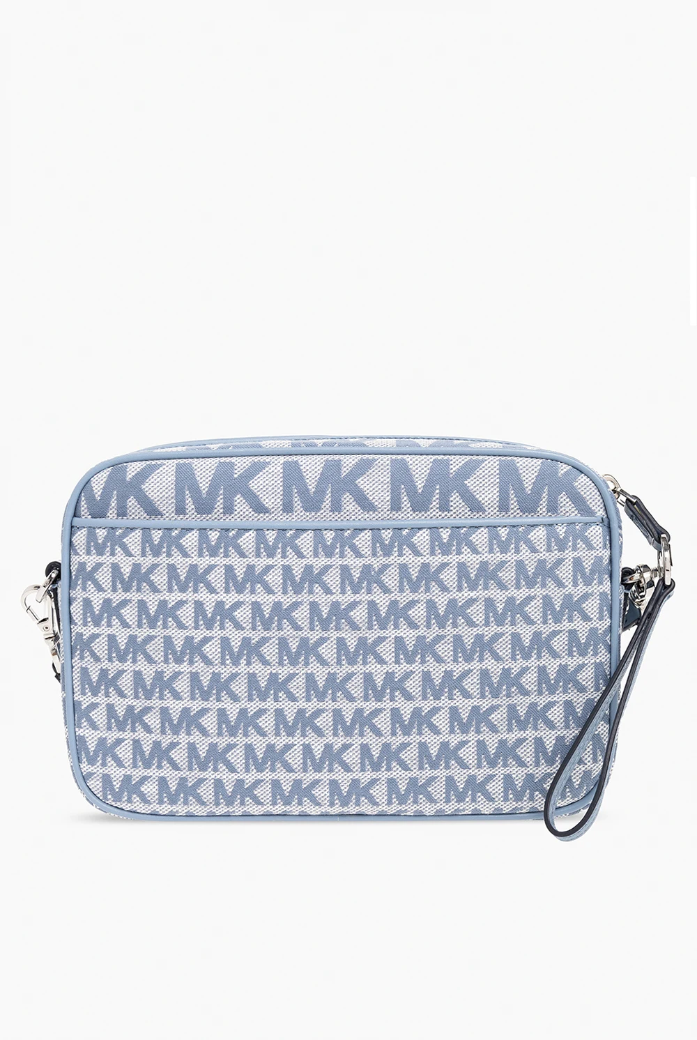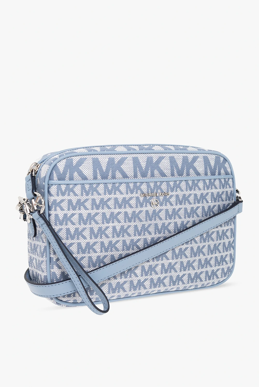 Blue and white 'Jet Set Charm’ shoulder bag from Michael Michael Kors. Made from monogrammed canvas and trimmed with faux leather, this design secures with a zipper and features a slip pocket accompanied by a logo plaque on the front, a back slip pocket, a long and adjustable strap, silver-tone metal hardware and one internal compartment with one slip pocket and six card slots.
