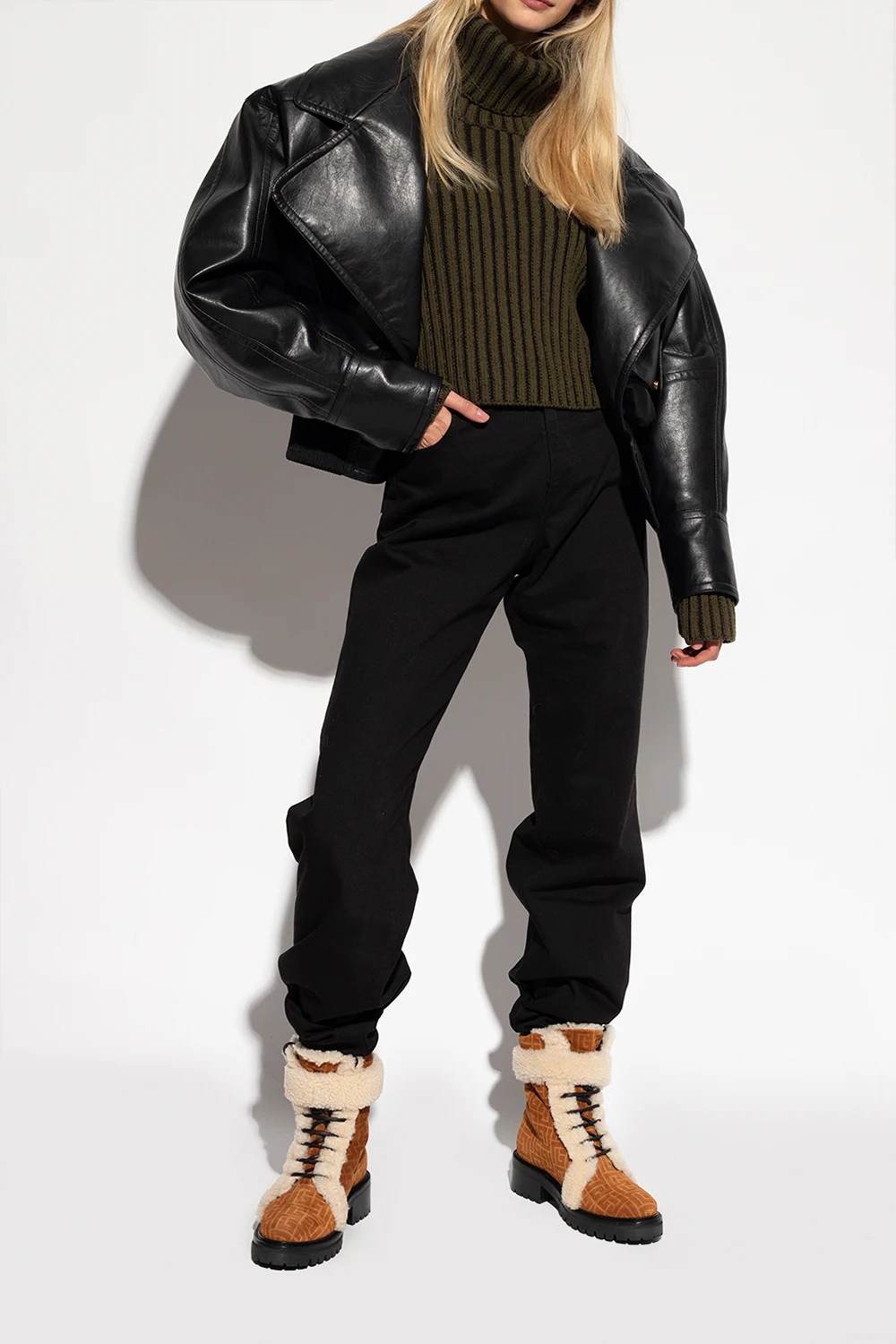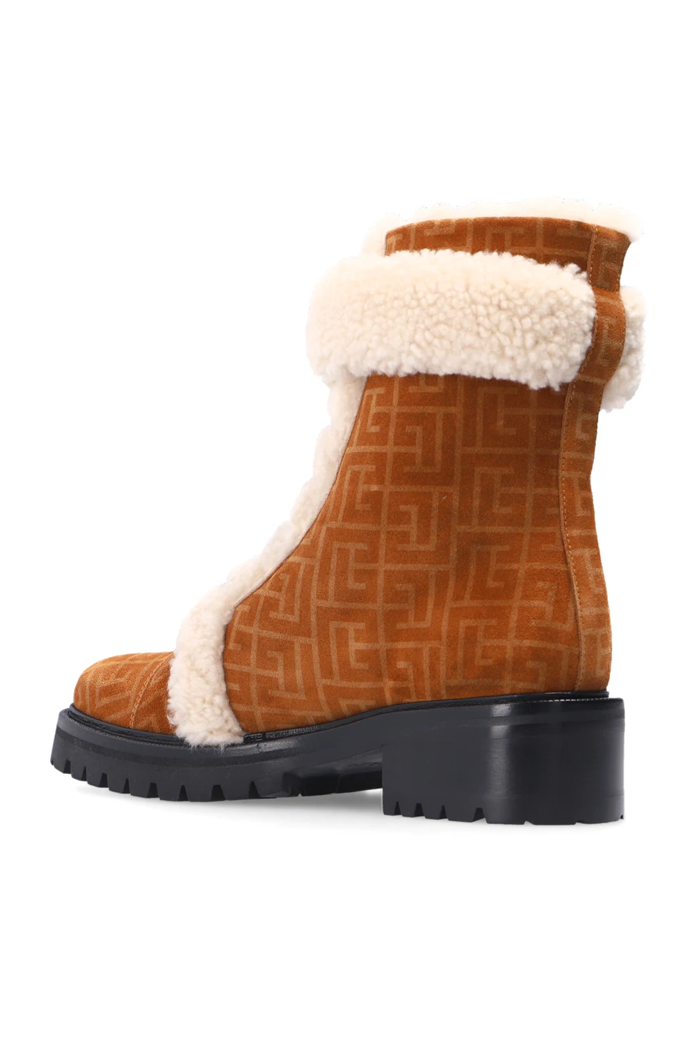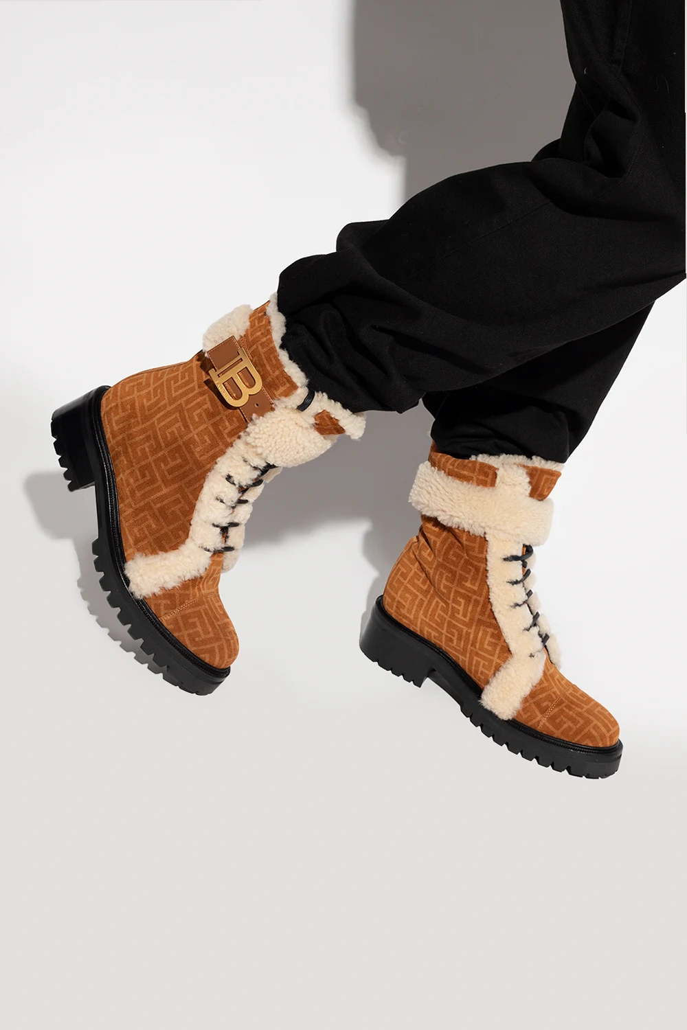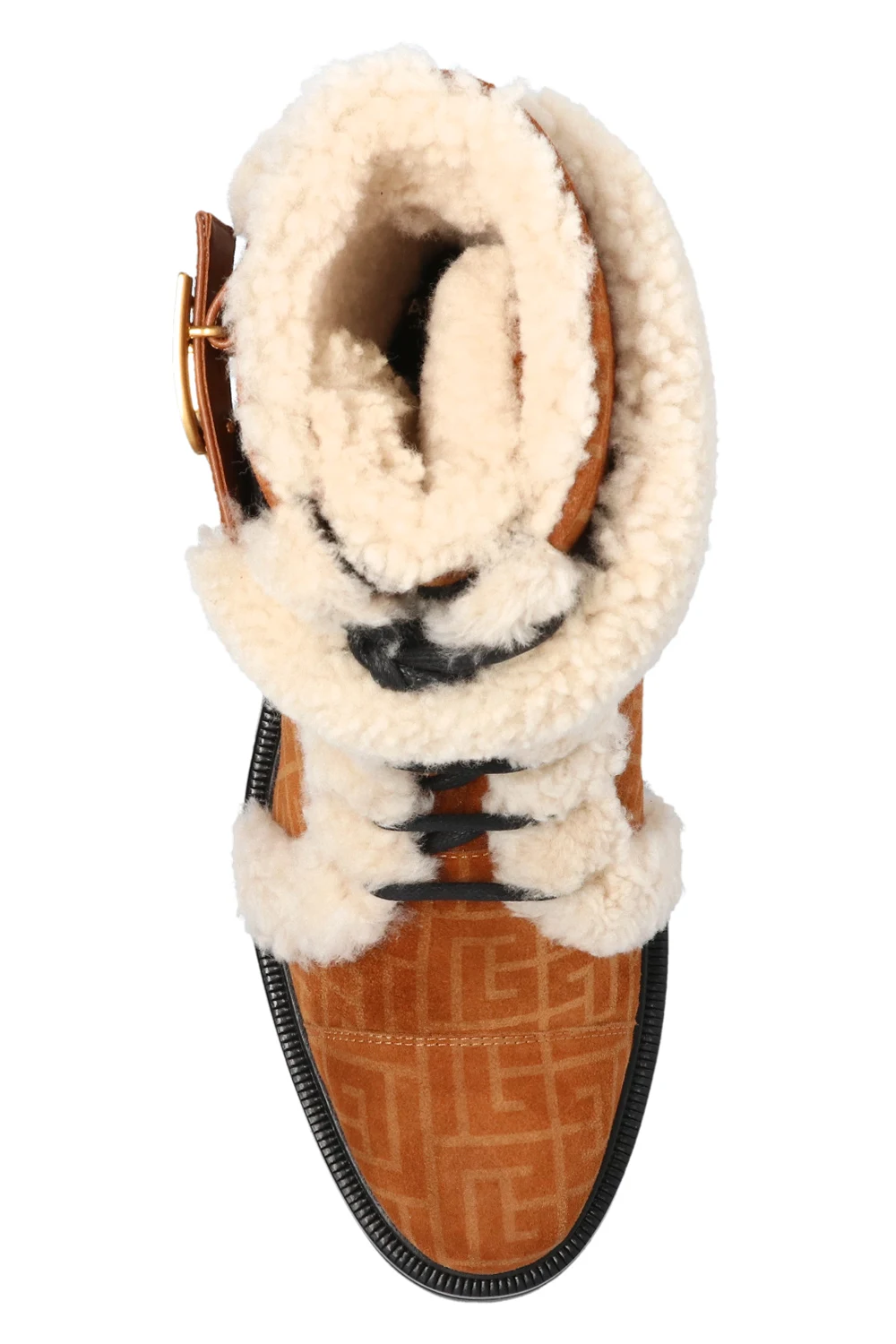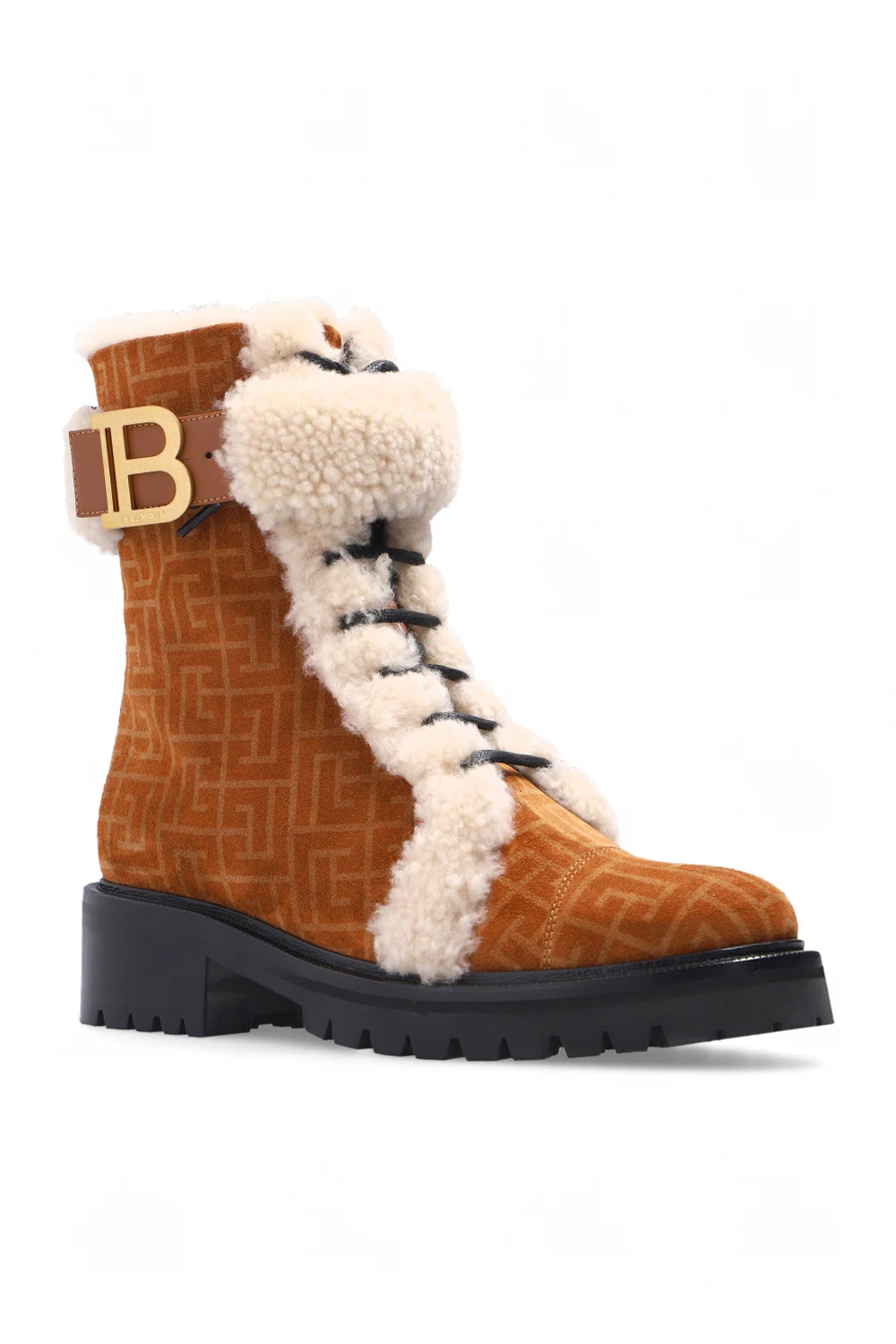 Brown and cream ankle boots from Balmain. Crafted from leather, this lace-up model sits on a black rubber sole and showcases a pointed toe silhouette, a fur trim and a ‘B’ monogram pattern.