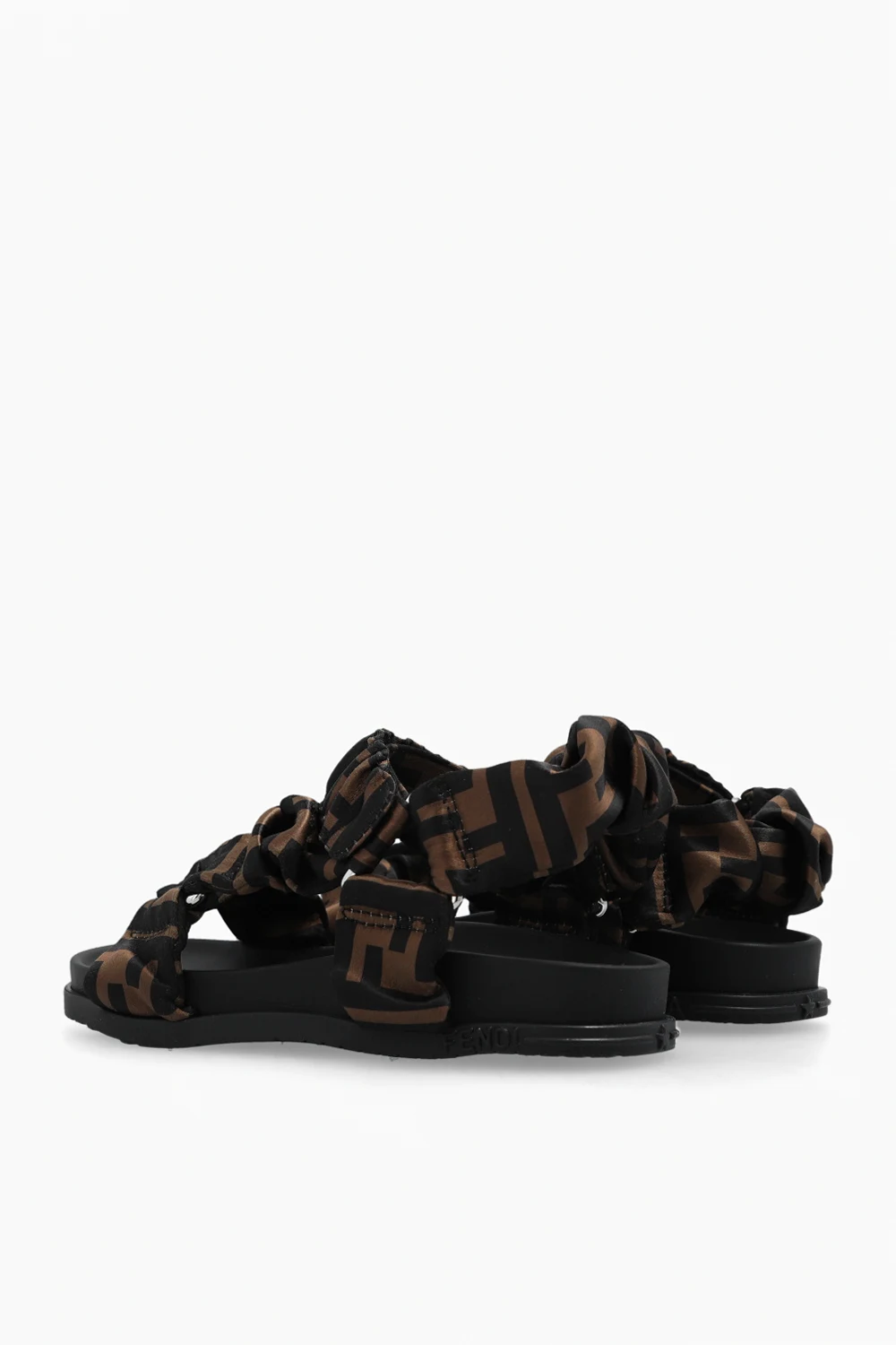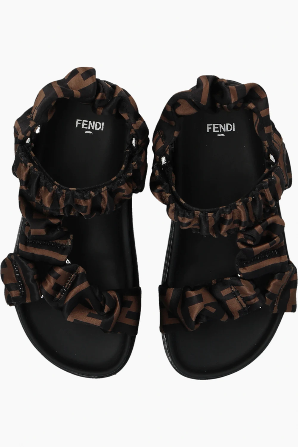 Black and brown sandals from Fendi Kids. Crafted from fabric and trimmed with leather, this model sits on a black rubber sole and showcases a monogram pattern and a velcro closure.