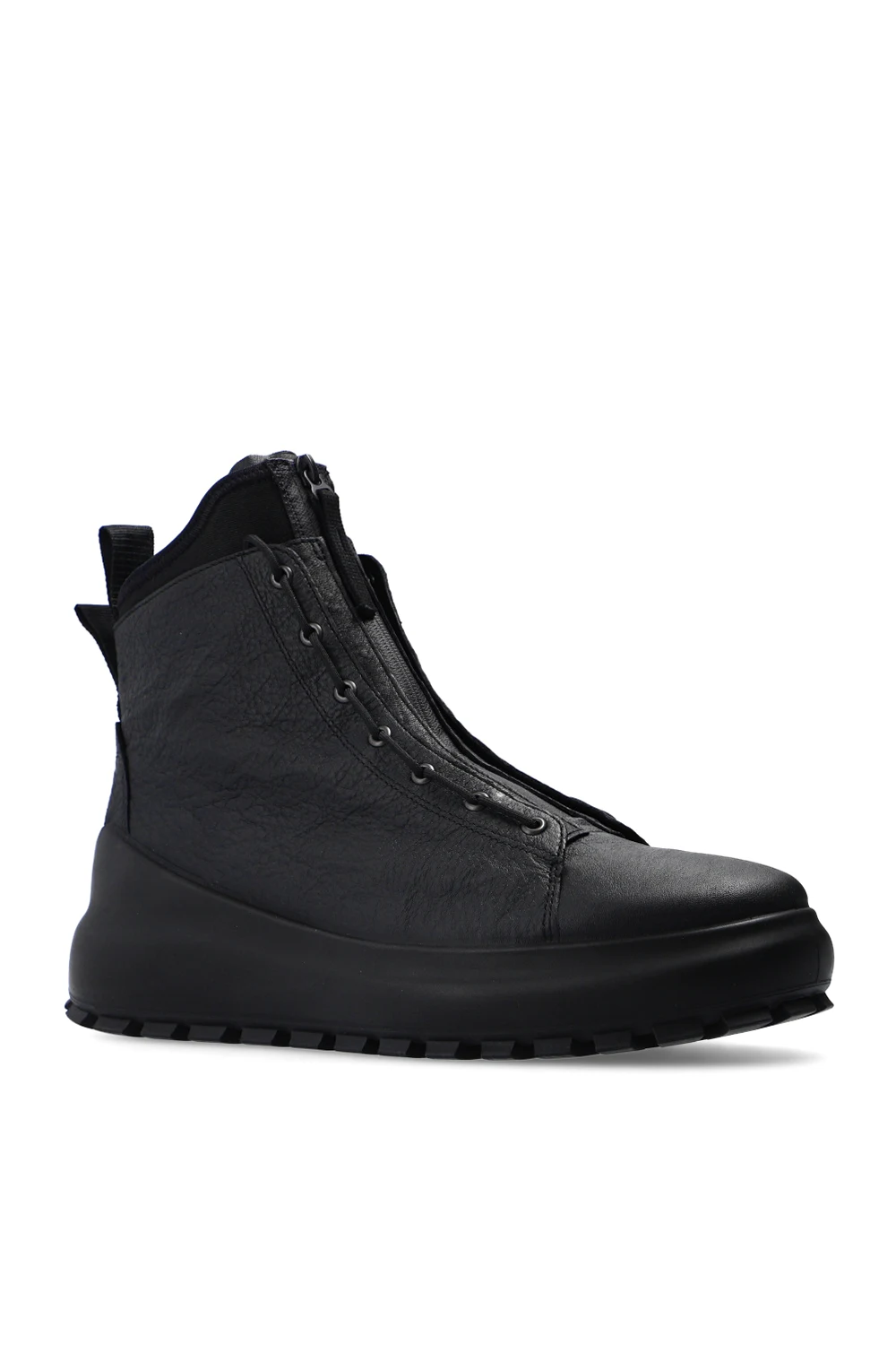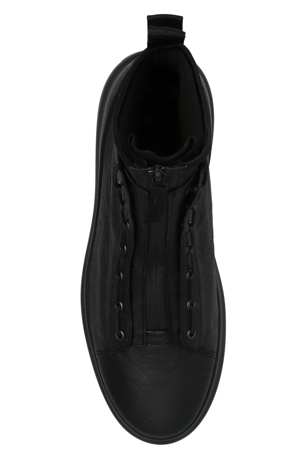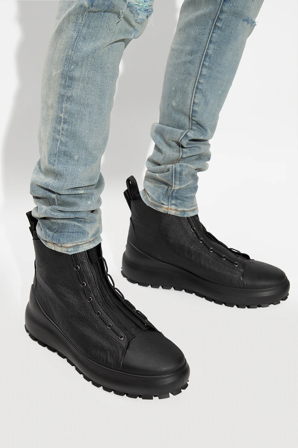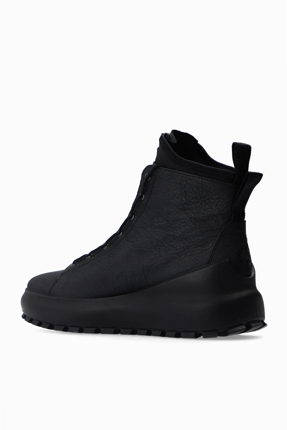 Black ankle boots from Stone Island. Crafted from leather, this lace-up pair features a zip closure, double pull strap and rubber logo appliqué at the back as well as a black rubber sole.