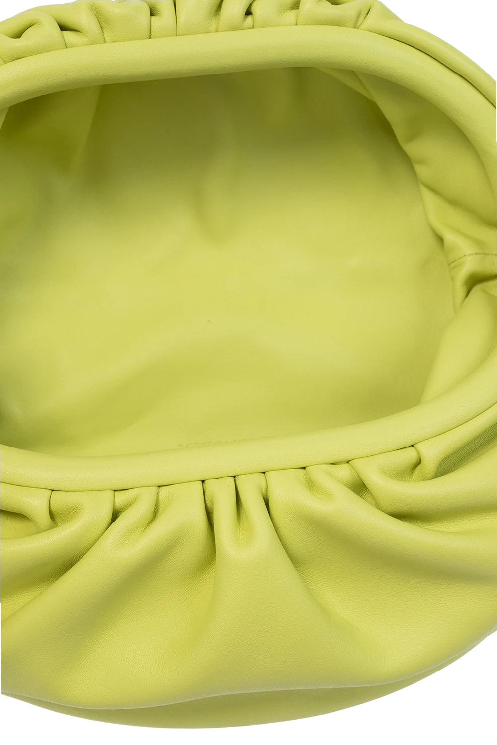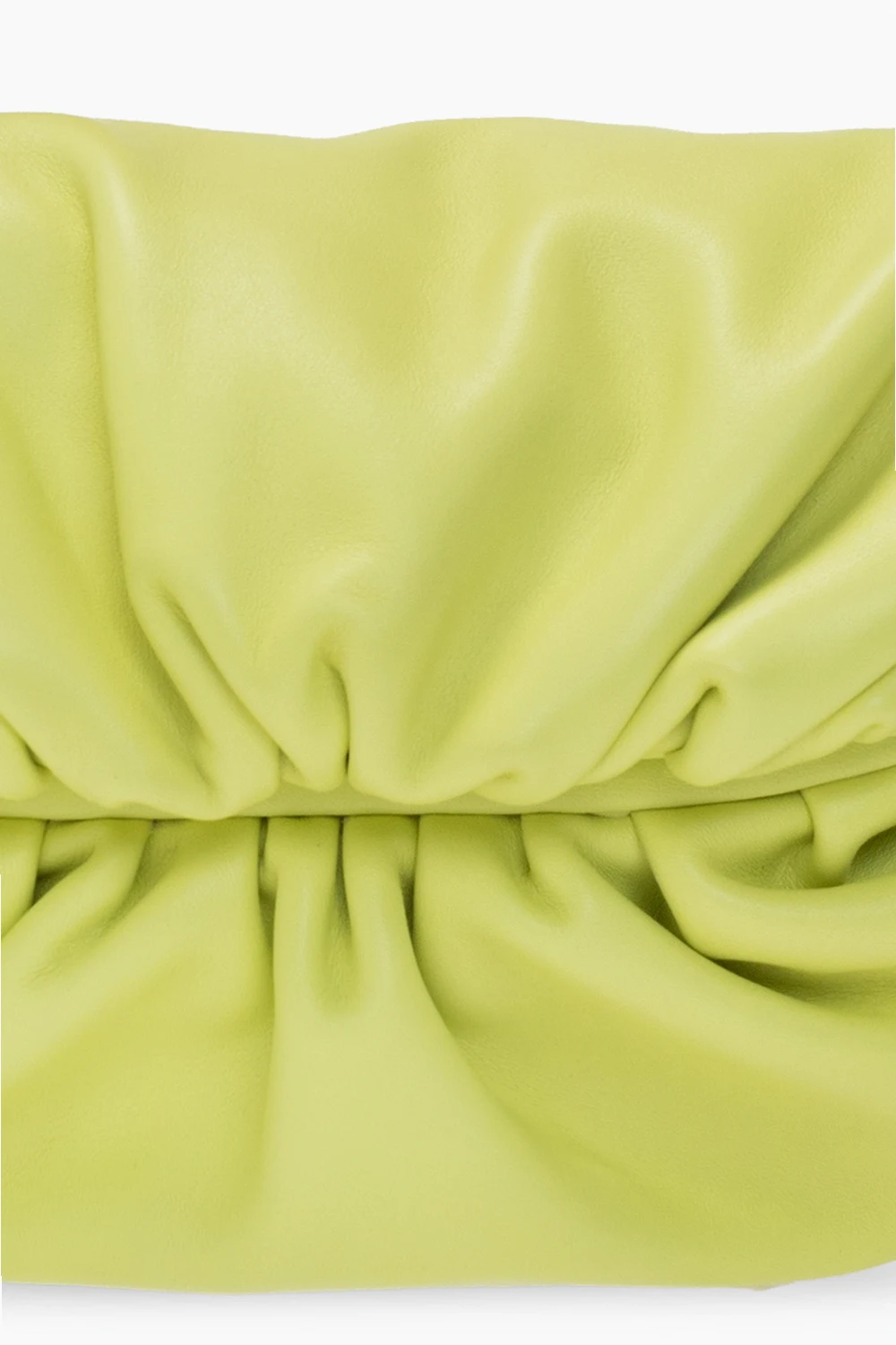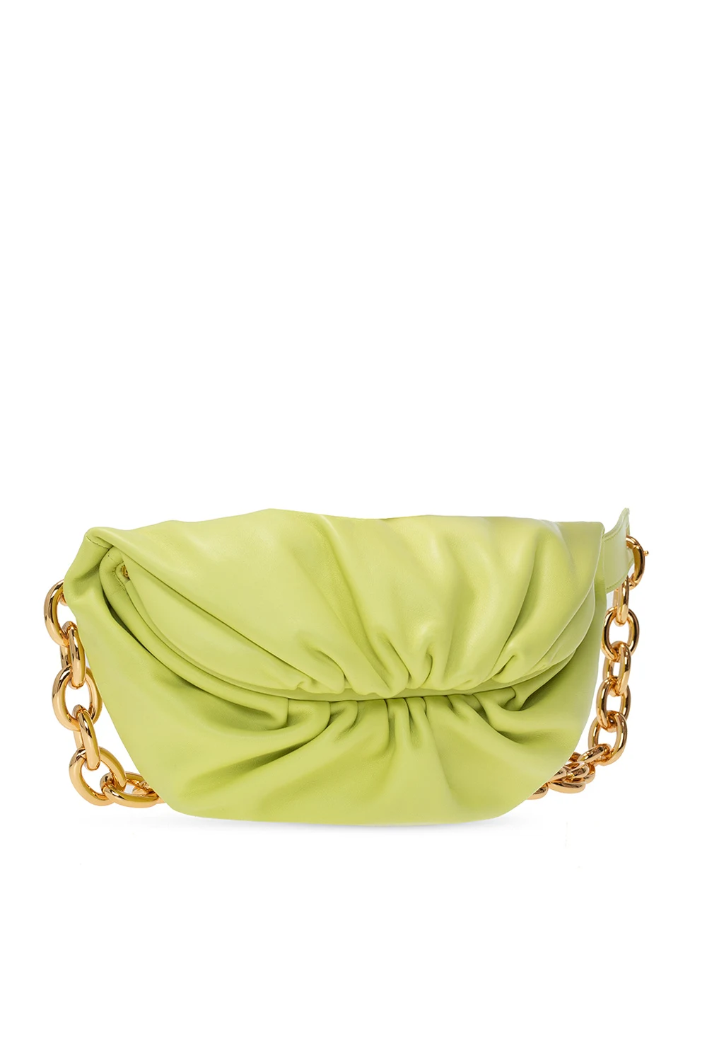 Light green belt bag from Bottega Veneta. Size medium. Crafted from calf leather, this design features a magnetic snap, gathers, chain strap, gold-tone metal hardware and one internal compartment.