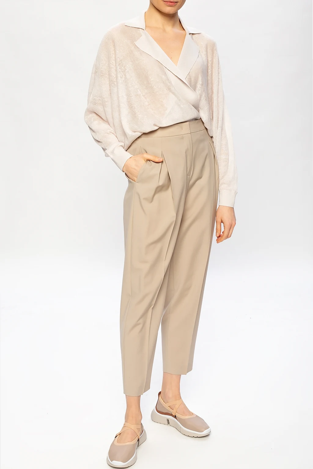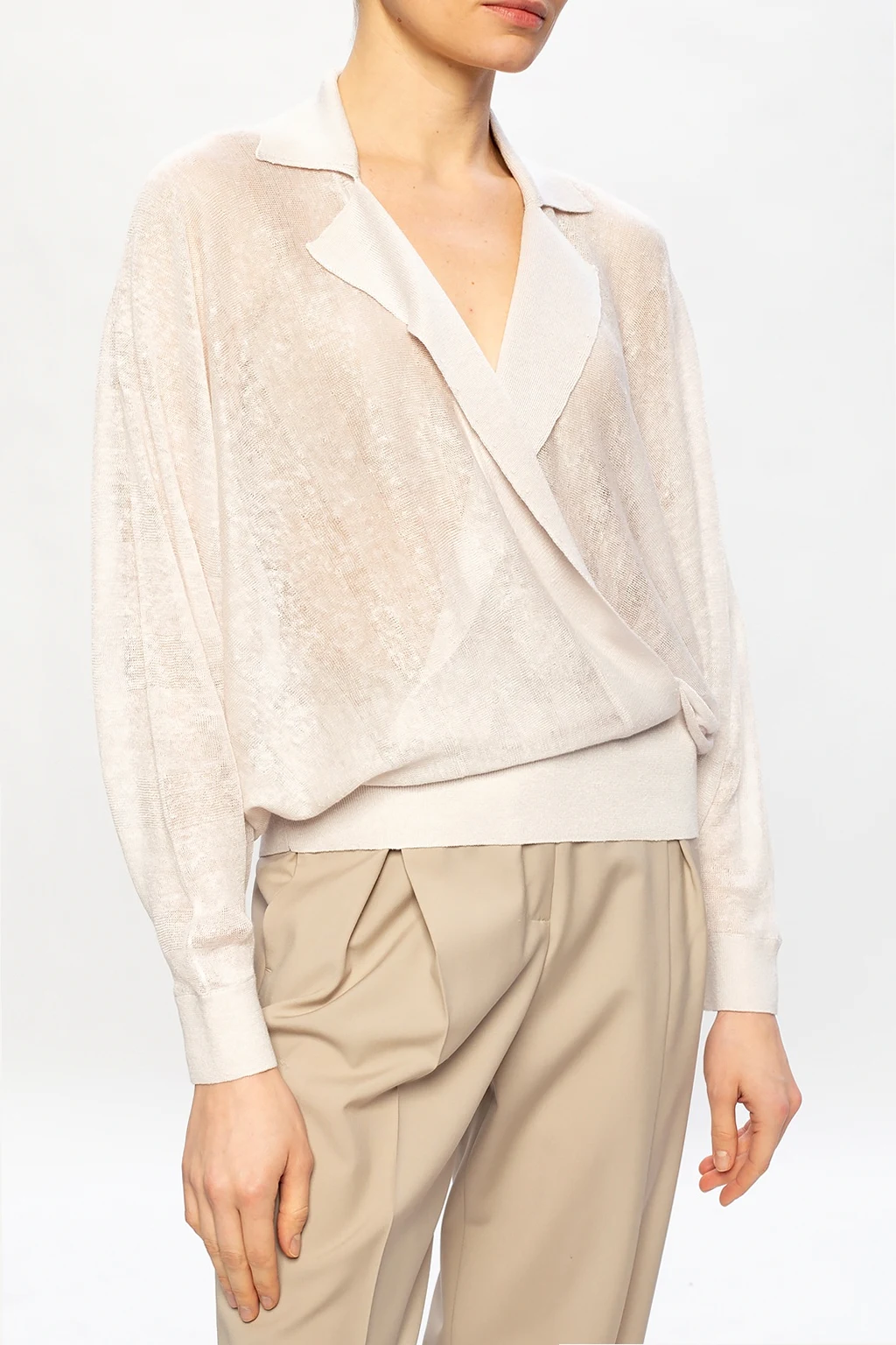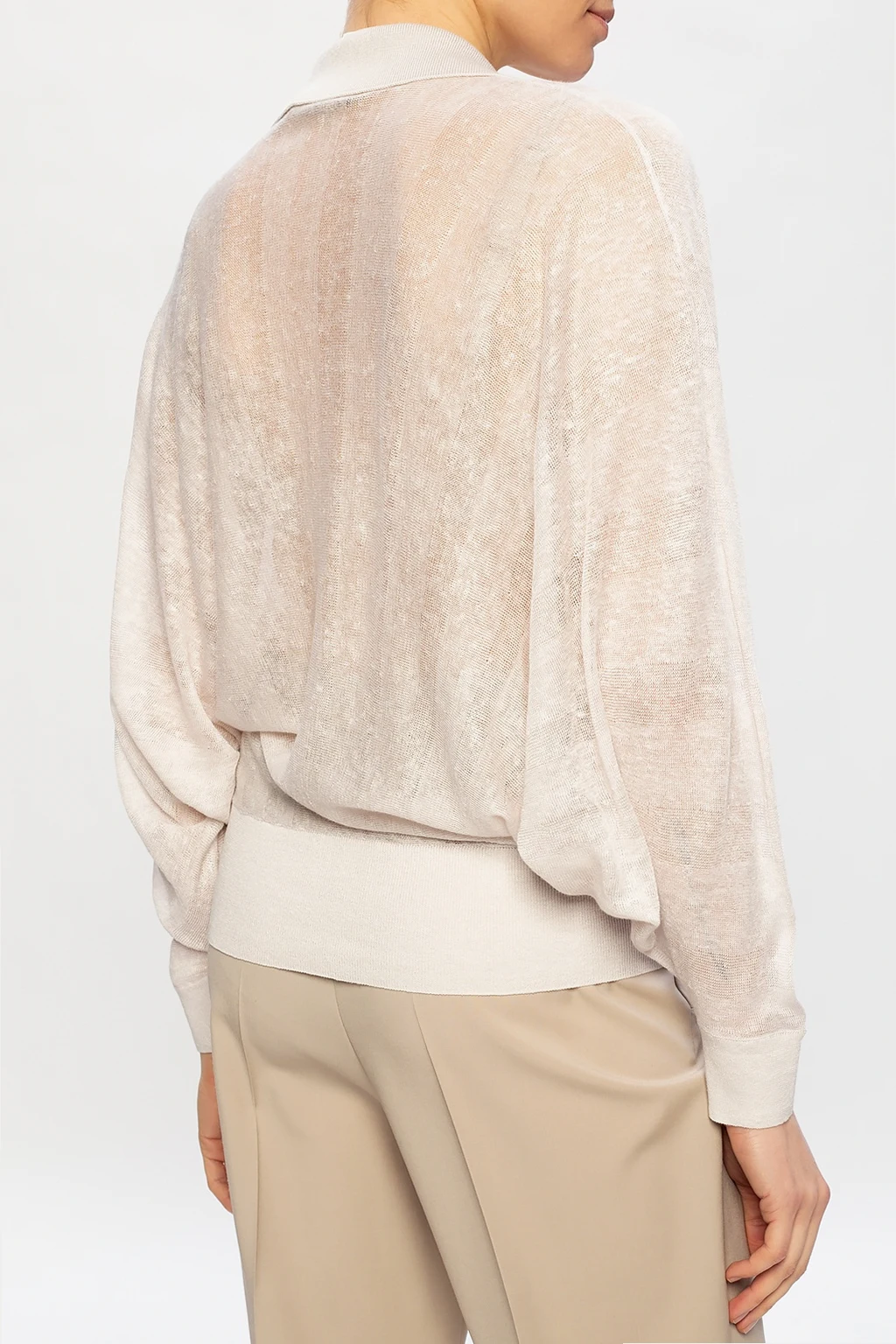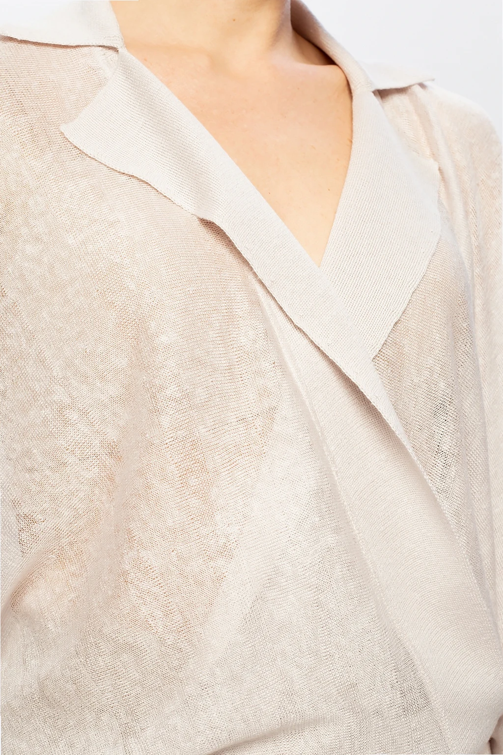 Cream sweater from Agnona. Crafted from silk and linen blend, this jumper boasts a see-through silhouette with a V-shaped neckline with a button closure and long sleeves.